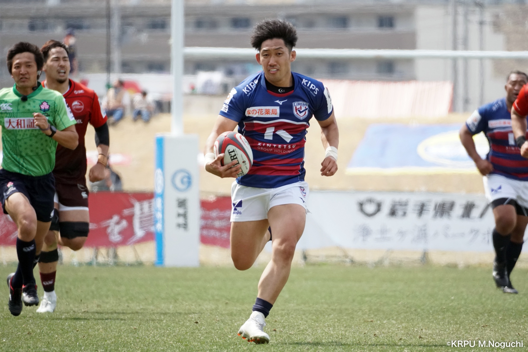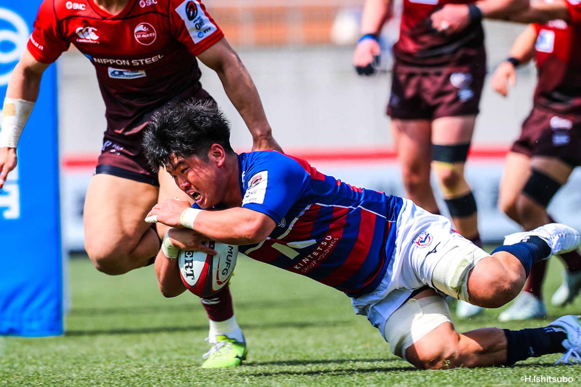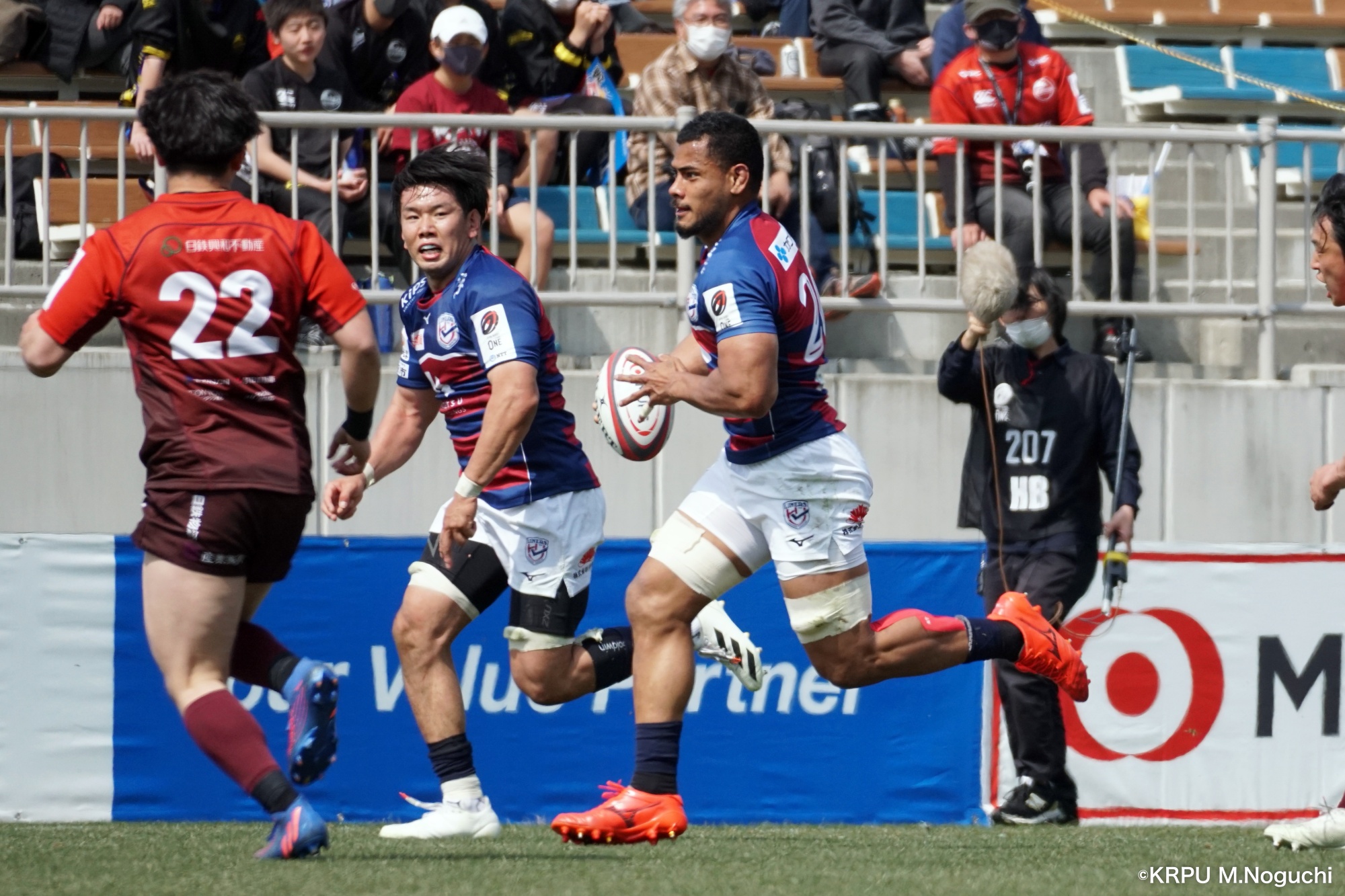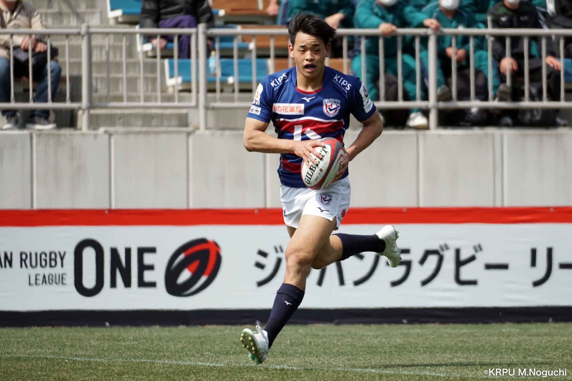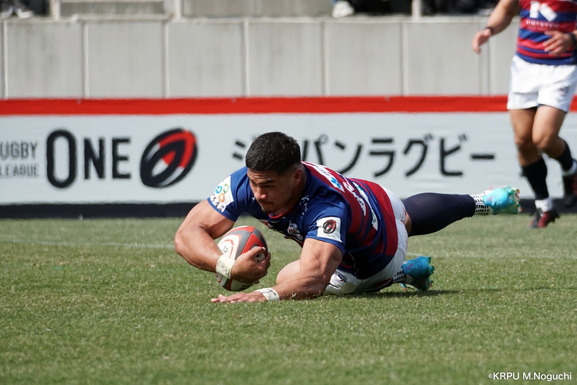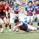 みるみる点差を広げ、67-5で迎えた後半18分。片岡がブレイクスルーすると右へ長いパスを回し、エッジを走る菅原へ渡ってトライ。