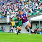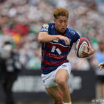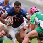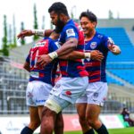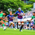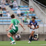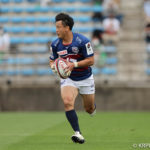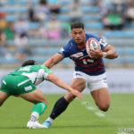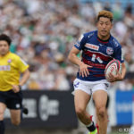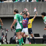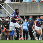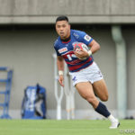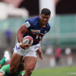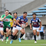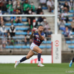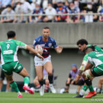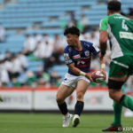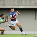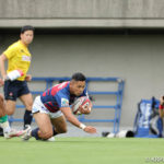 前半10分テンポ良く攻めると、相手陣22m付近での右マイボールラインアウトからつなげ、10クーパーが左へロングパス。受け取ったワクァから1番外で1人余った11片岡へ。左端にトライをあげます。クーパーのゴールも決まり14-0と離していきます。