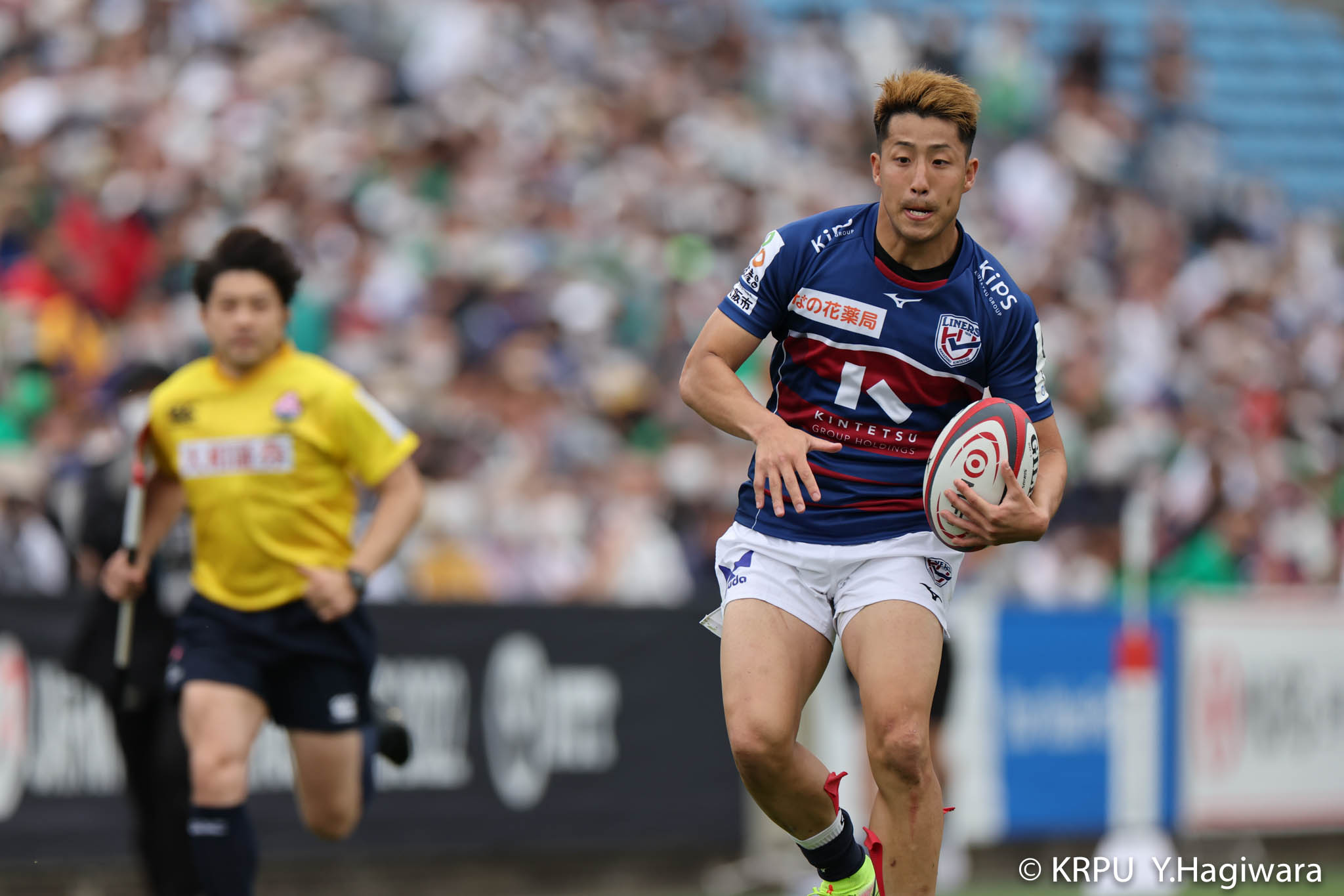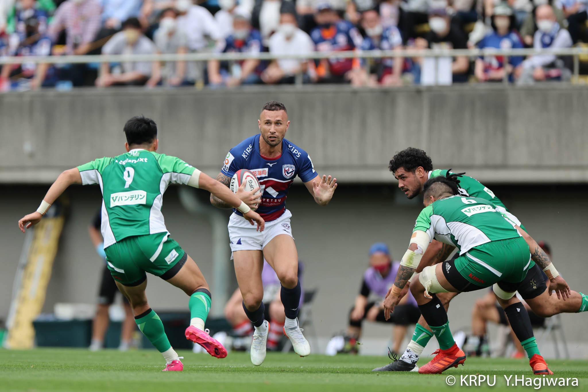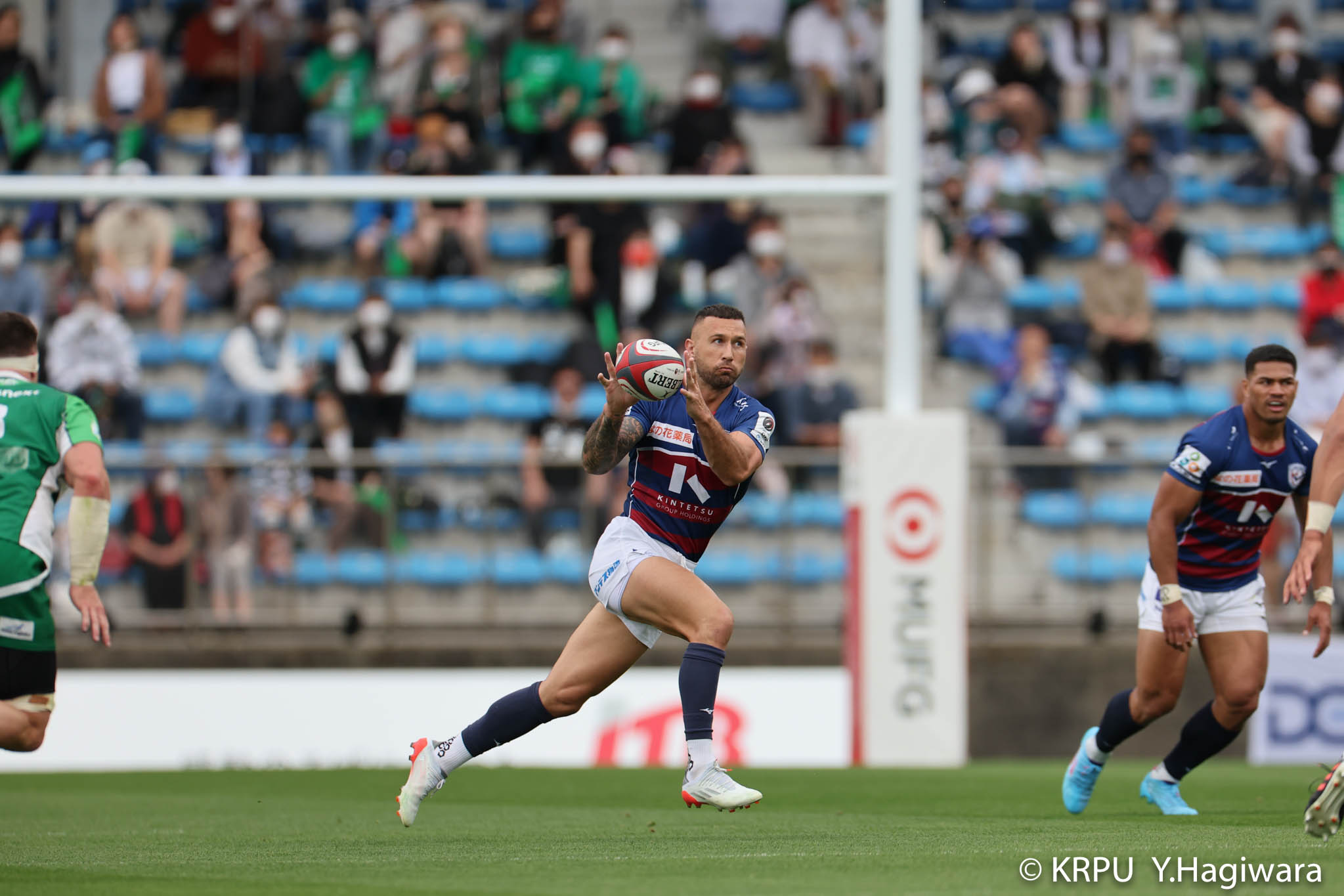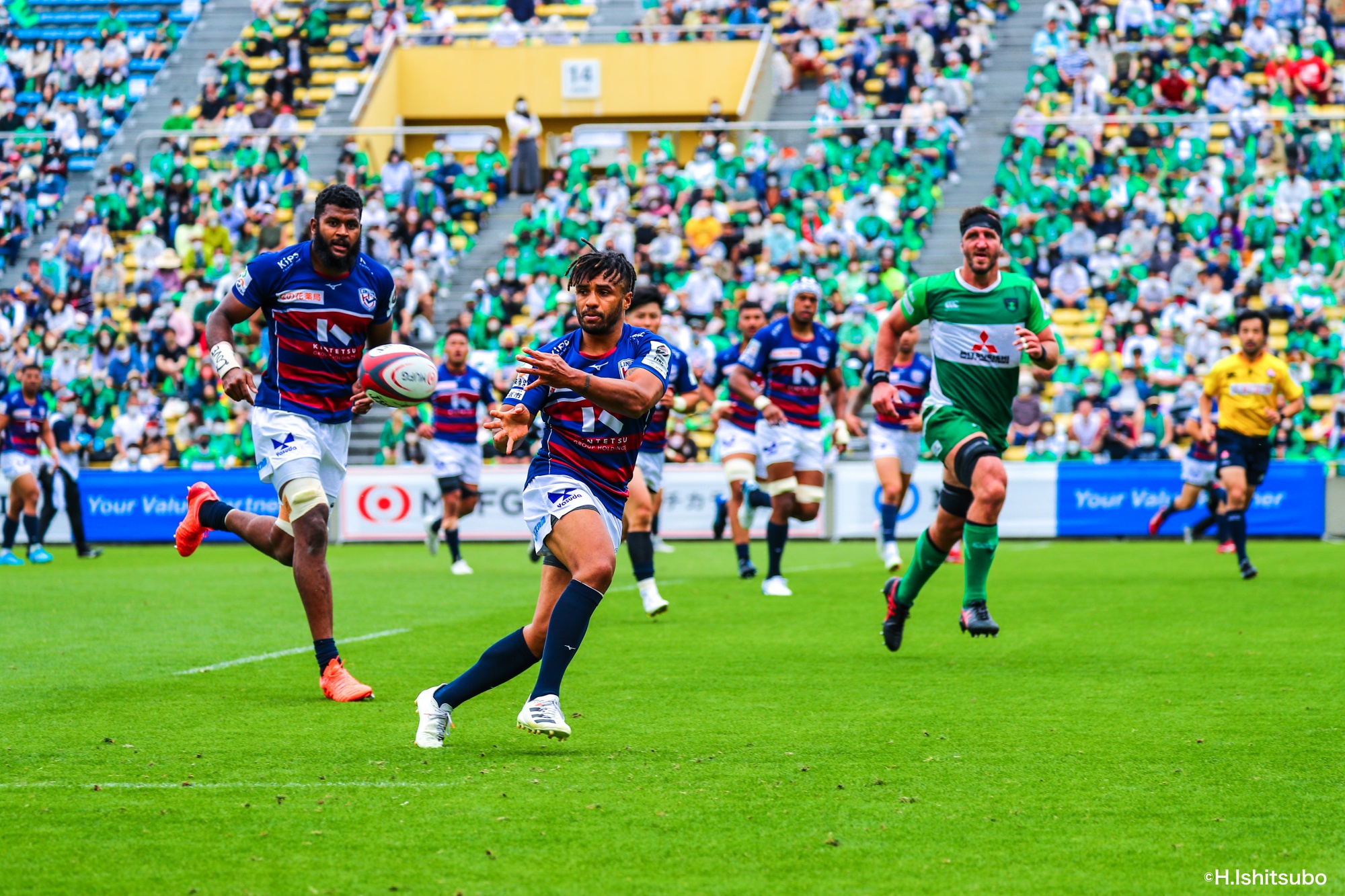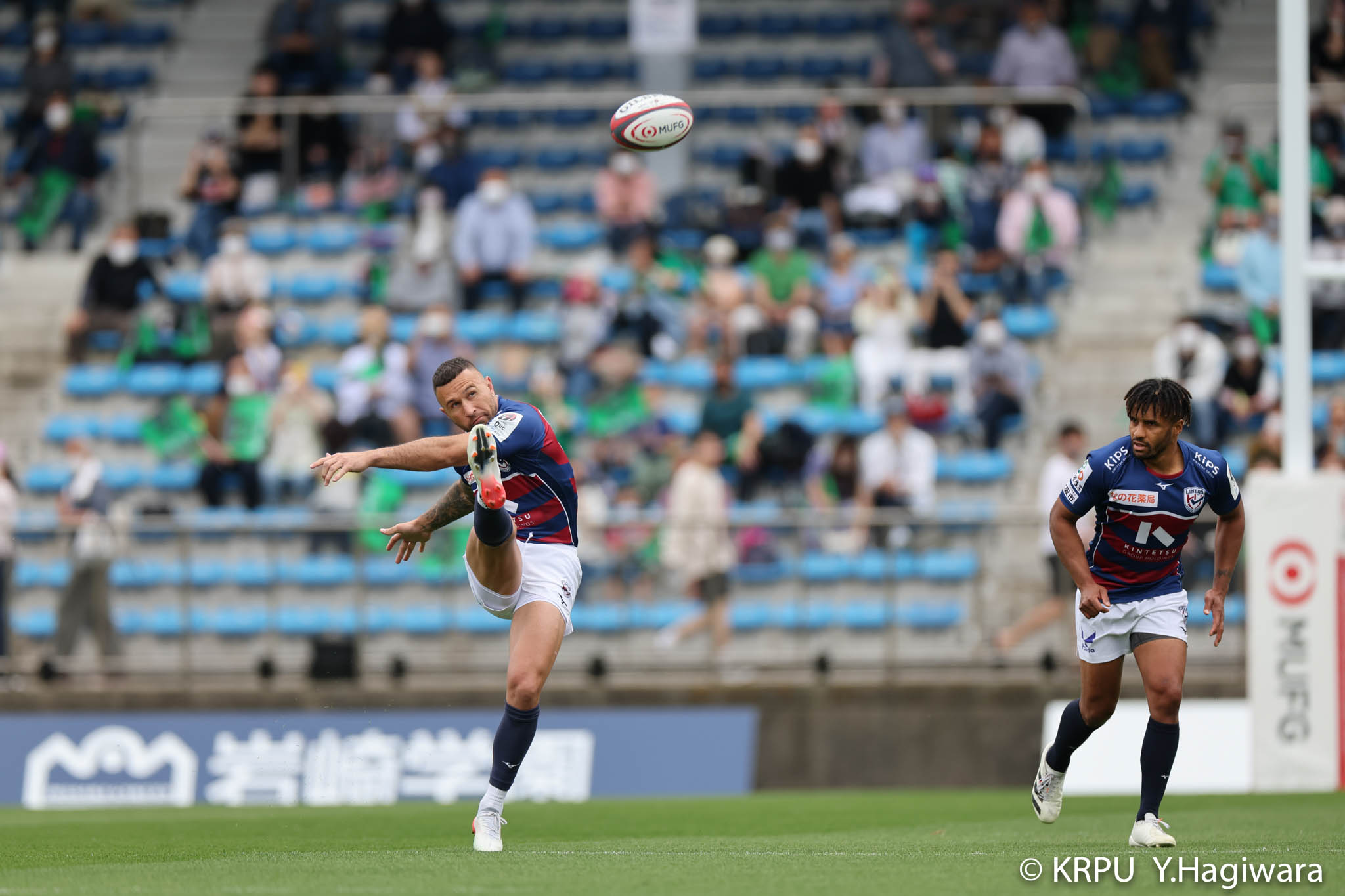 ライナーズボールのラインアウトから回し14木村がダミーで抜けると、右へ。クーパーからアウトサイドのキックパスが右外のワクァに渡ってトライを決めます。27-15のライナーズリードで前半が終了。