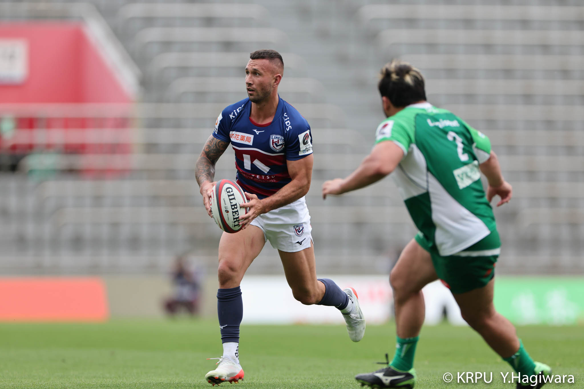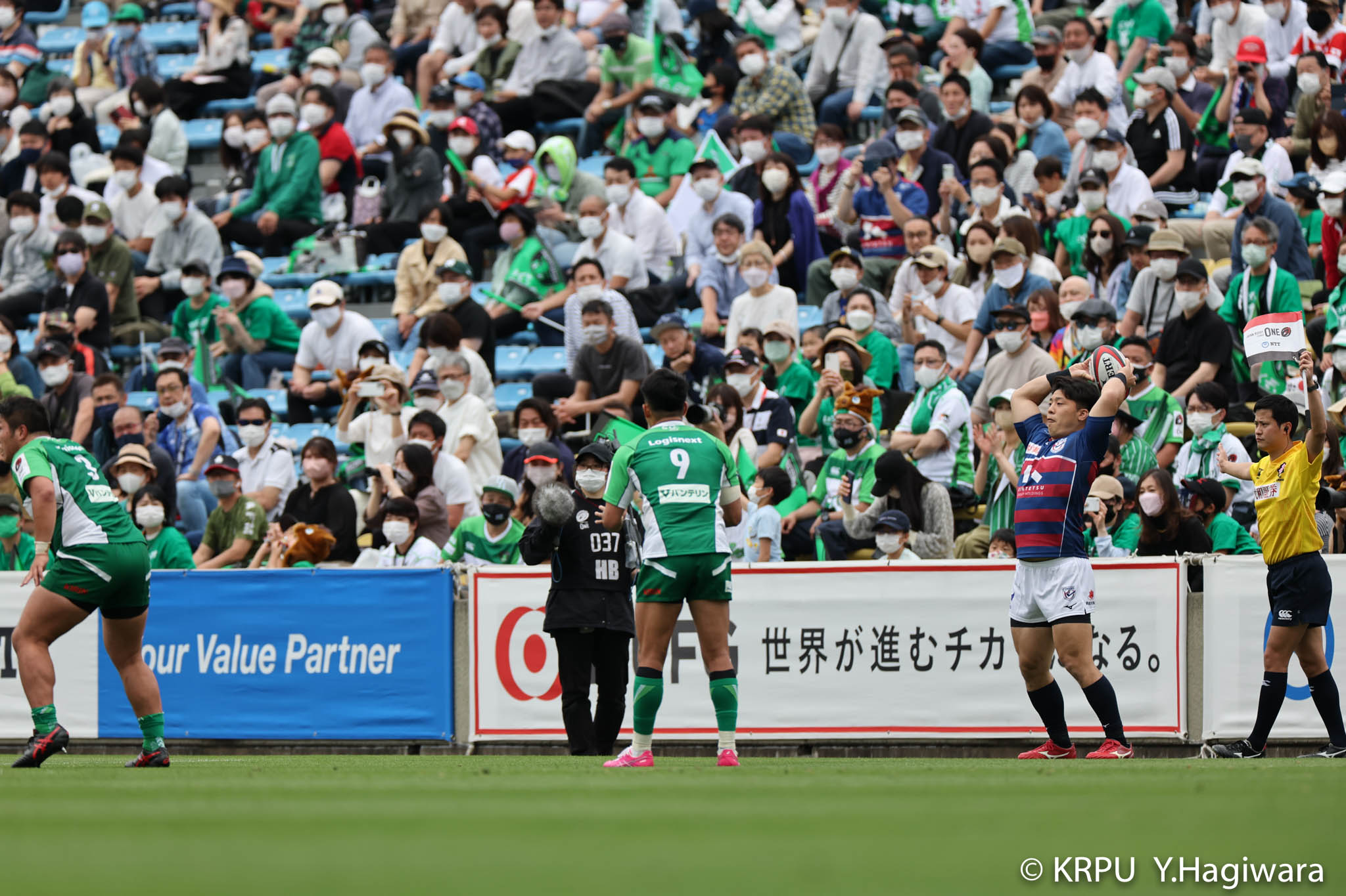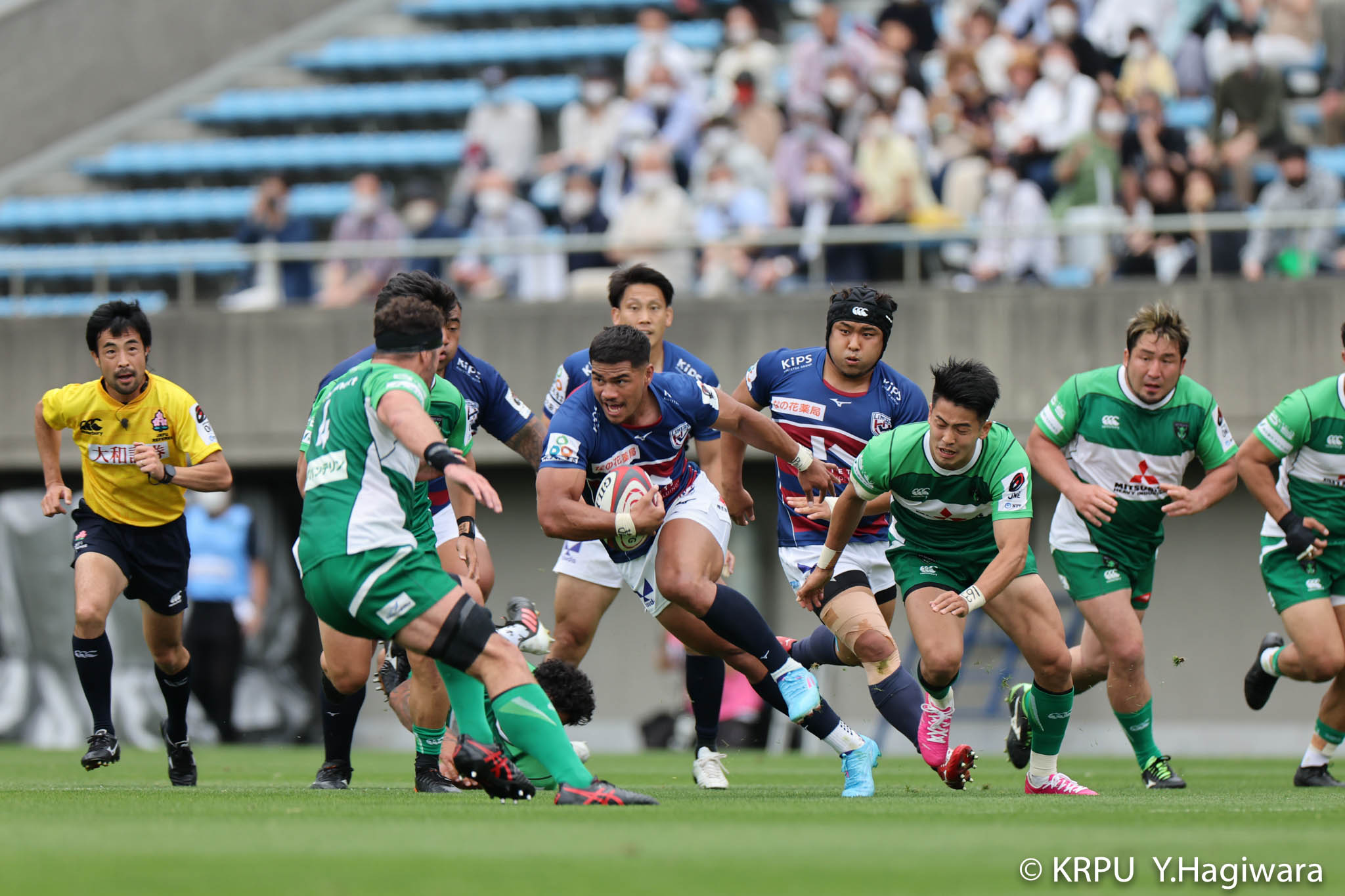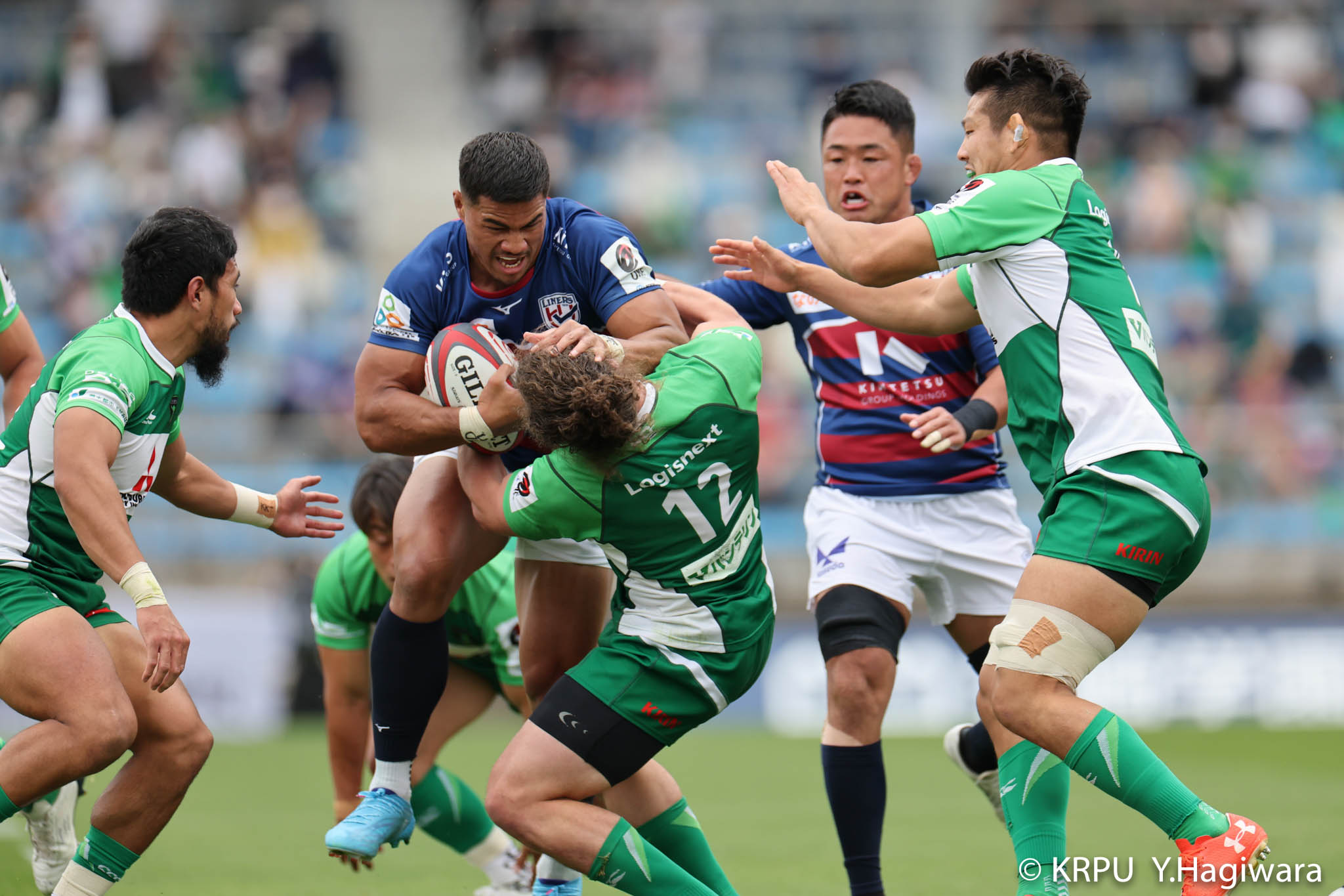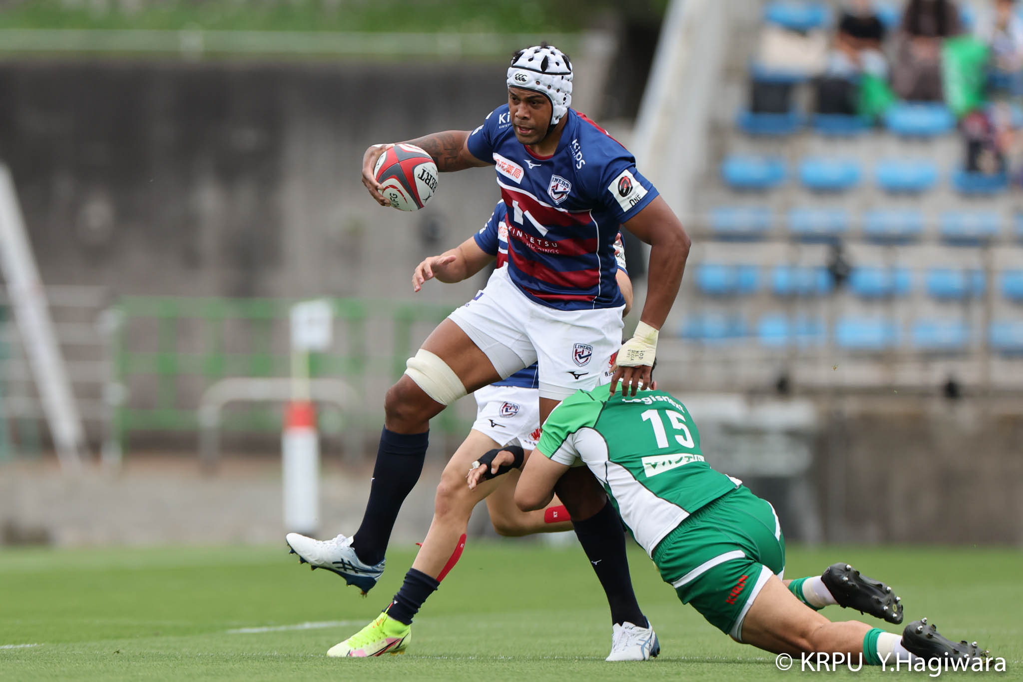 ライナーズボールのラインアウトから回し14木村がダミーで抜けると、右へ。クーパーからアウトサイドのキックパスが右外のワクァに渡ってトライを決めます。27-15のライナーズリードで前半が終了。