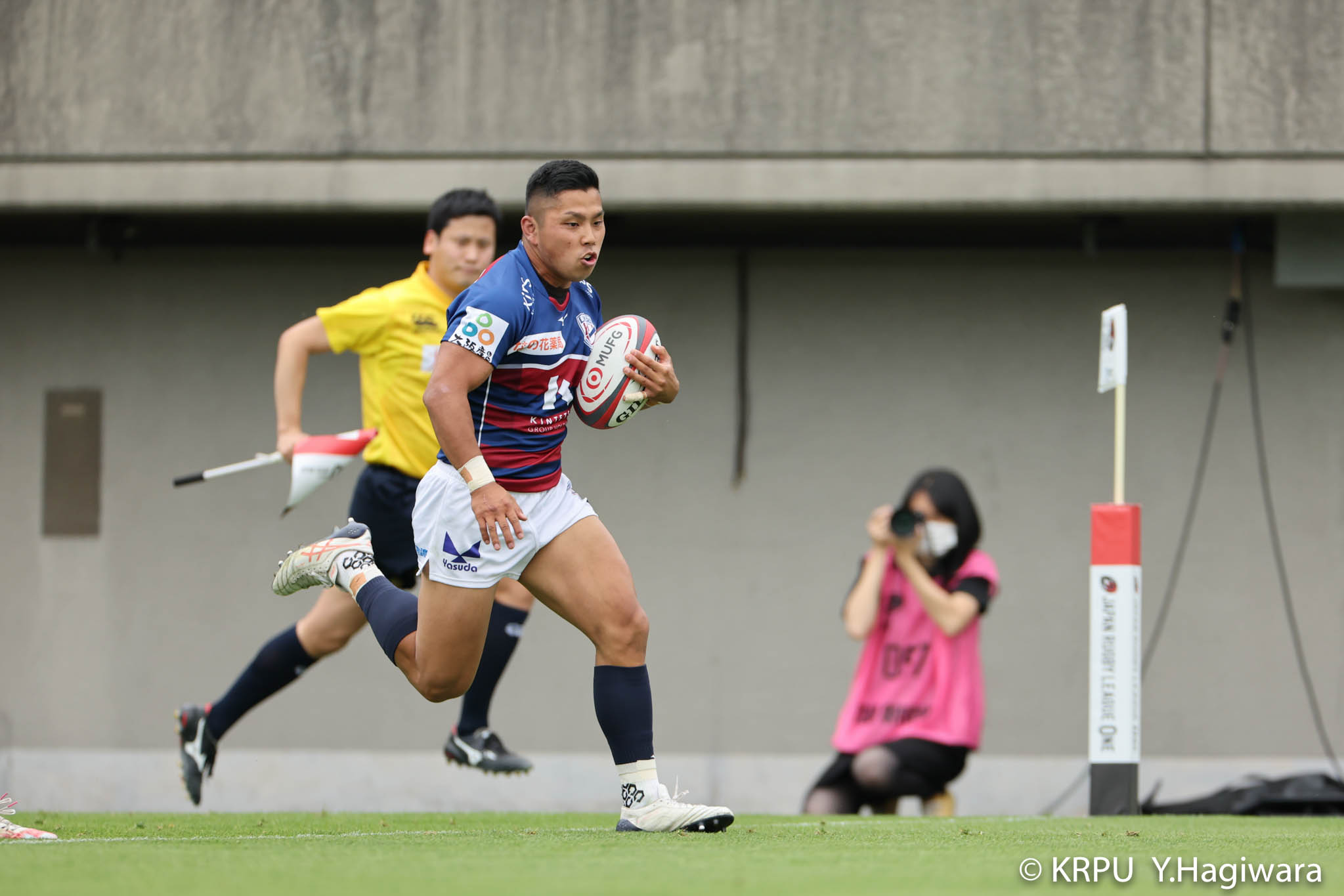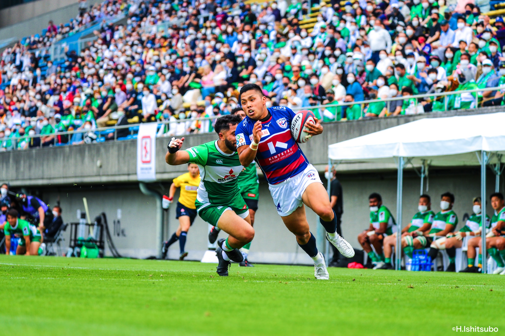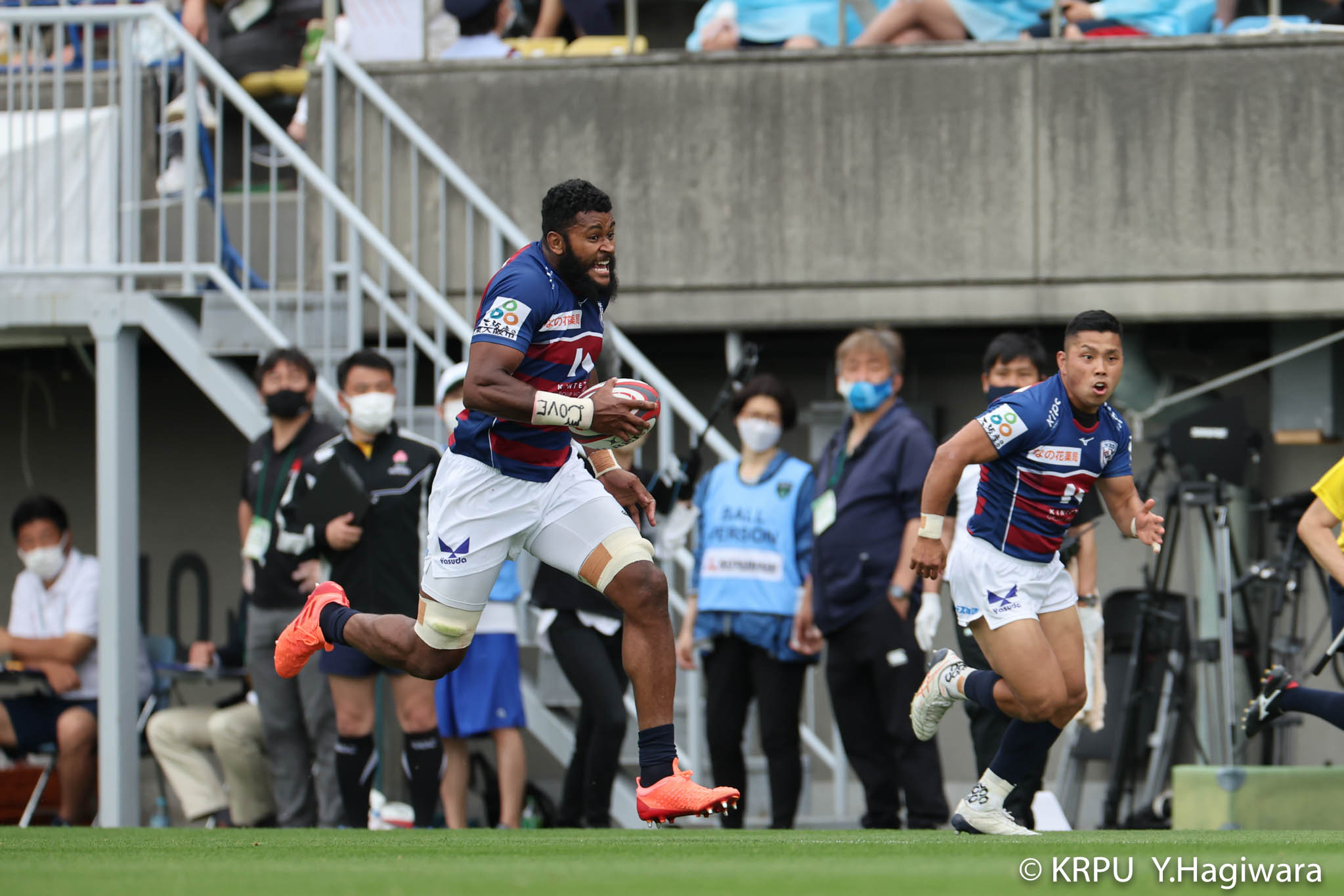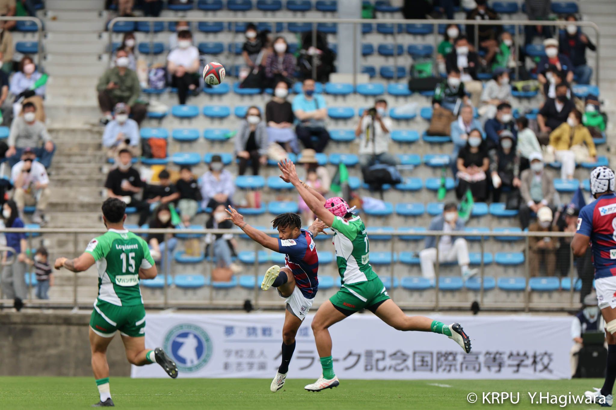 ライナーズボールのラインアウトから回し14木村がダミーで抜けると、右へ。クーパーからアウトサイドのキックパスが右外のワクァに渡ってトライを決めます。27-15のライナーズリードで前半が終了。