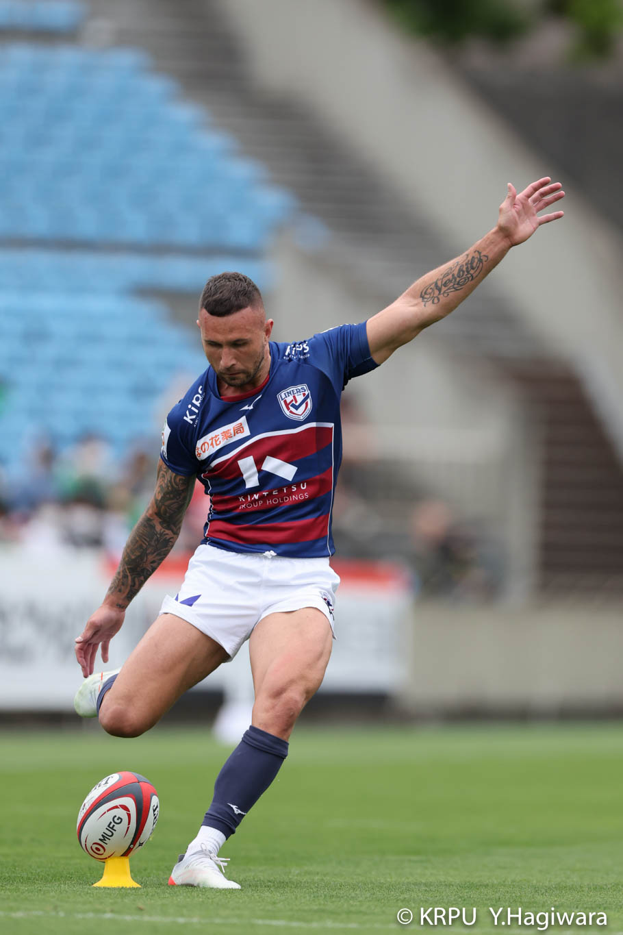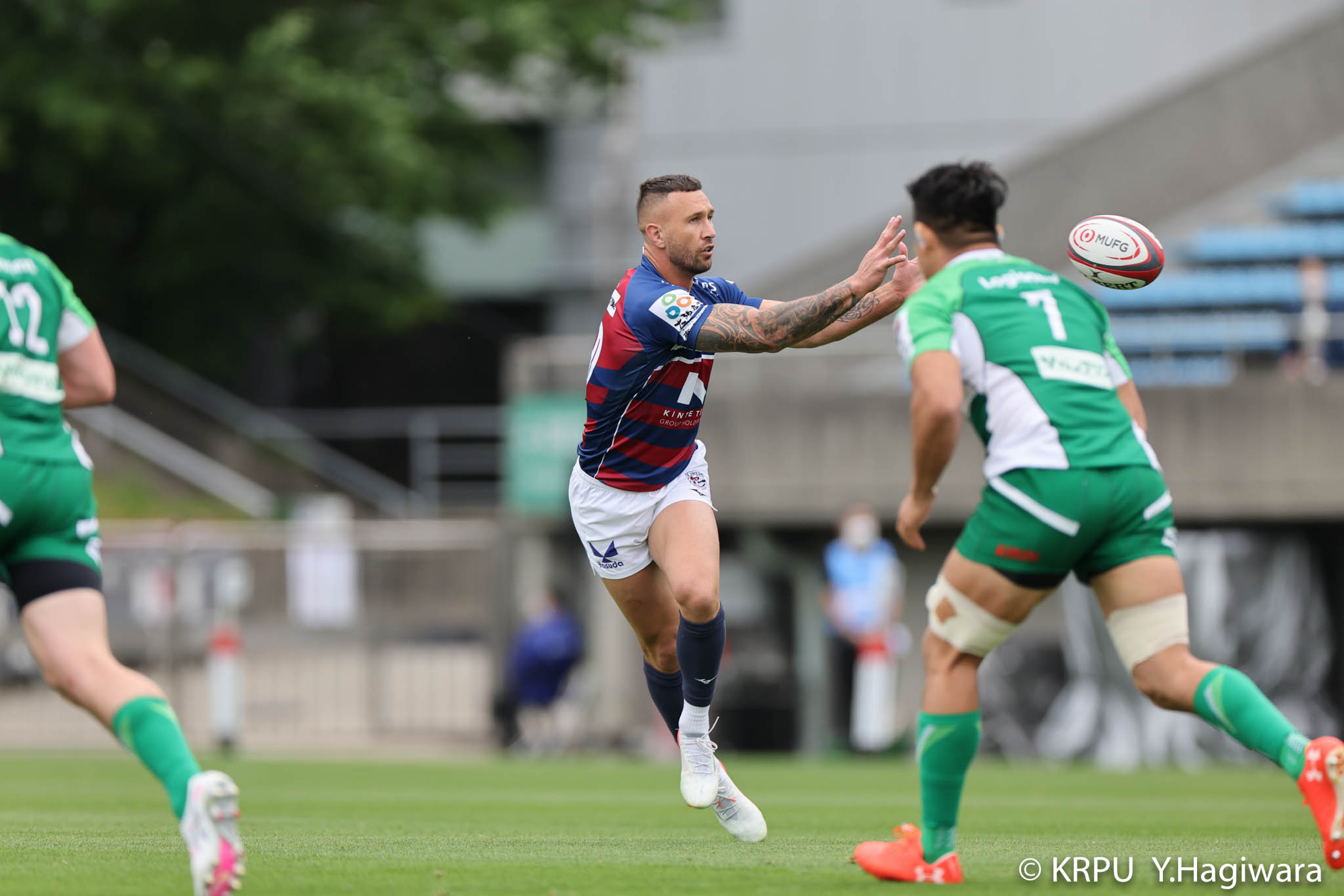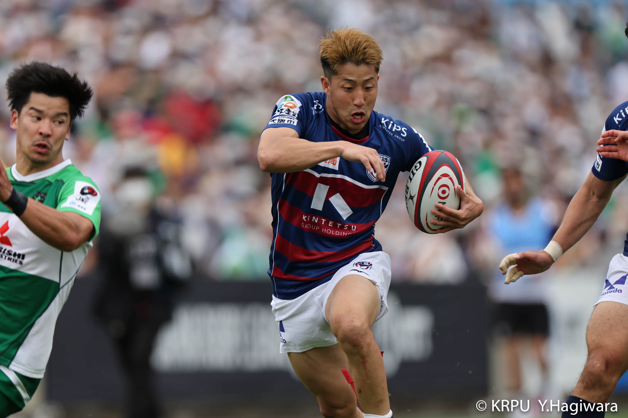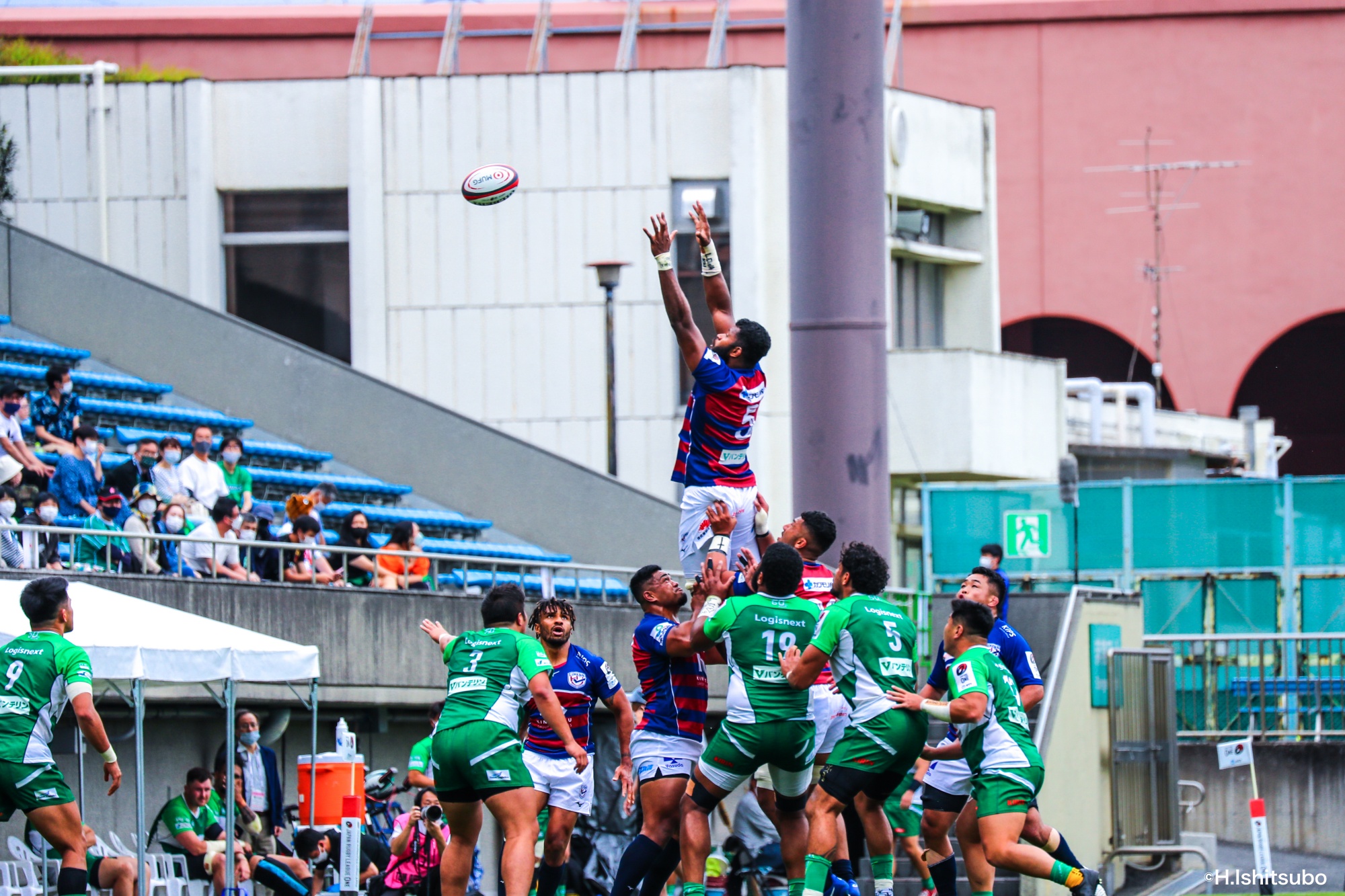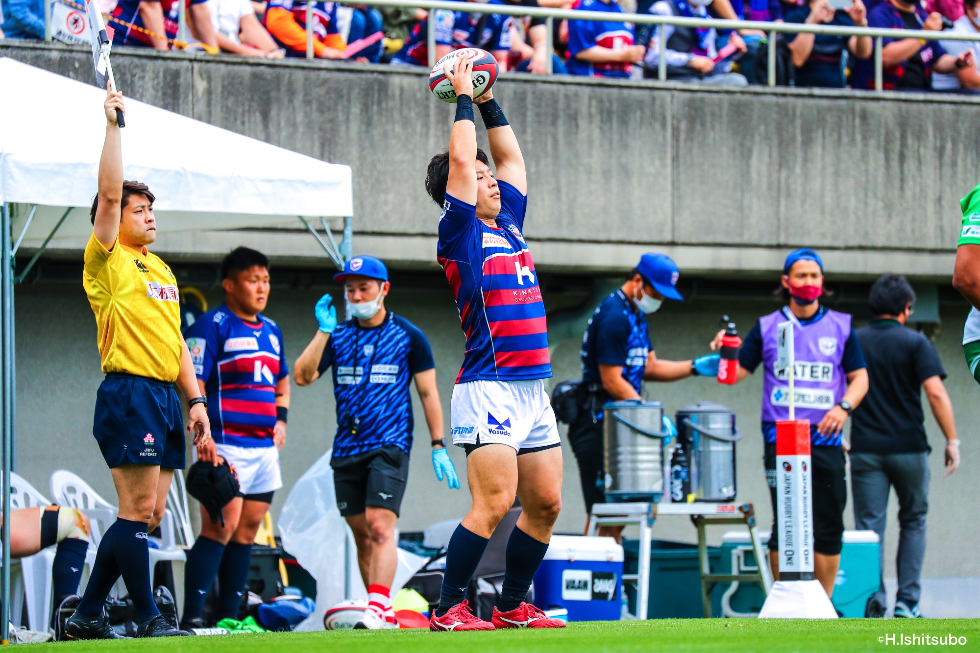 ライナーズボールのラインアウトから回し14木村がダミーで抜けると、右へ。クーパーからアウトサイドのキックパスが右外のワクァに渡ってトライを決めます。27-15のライナーズリードで前半が終了。