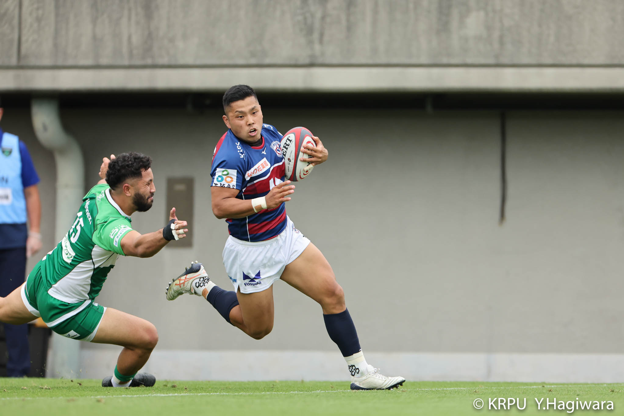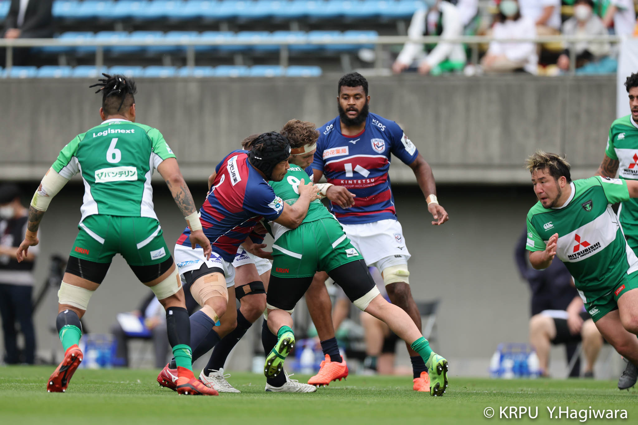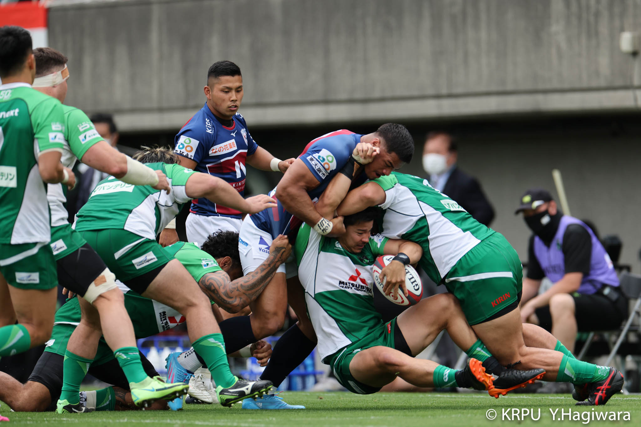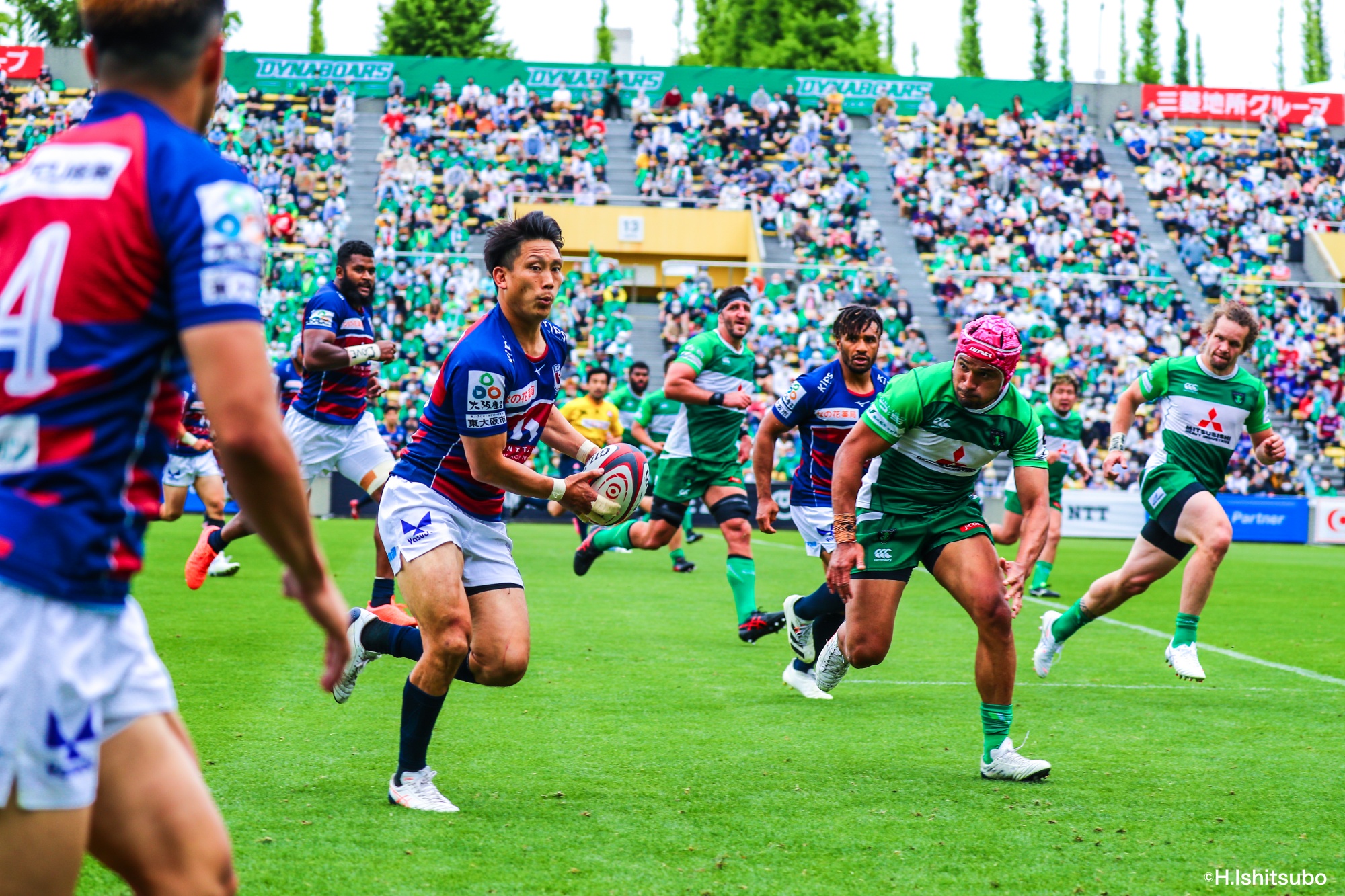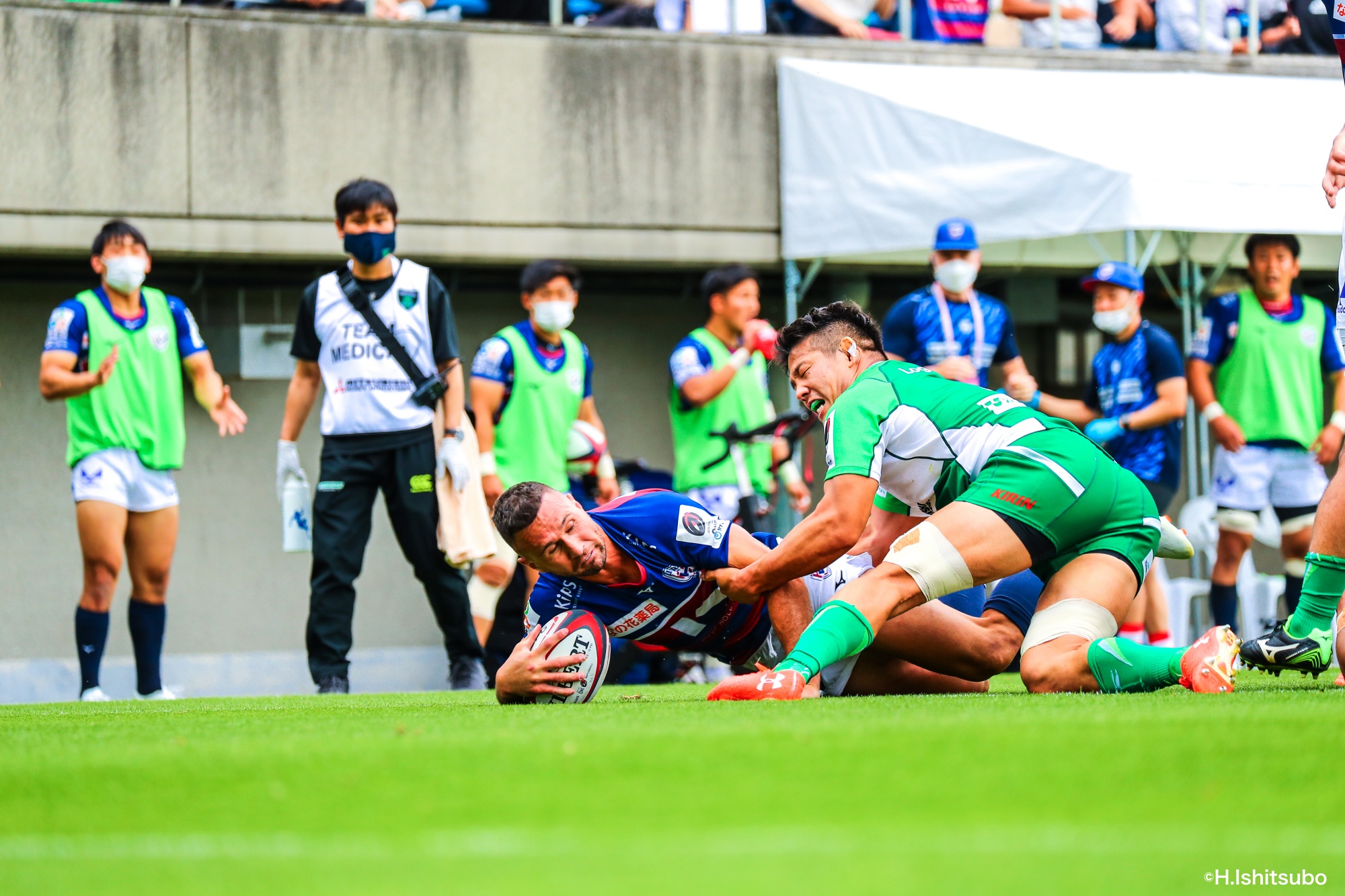 オフロードパスを駆使しながら真っ直ぐ突っ込んでくるダイナボアーズ。ディフェンスで応戦しますが間に合わず、前半18分にトライを許します。