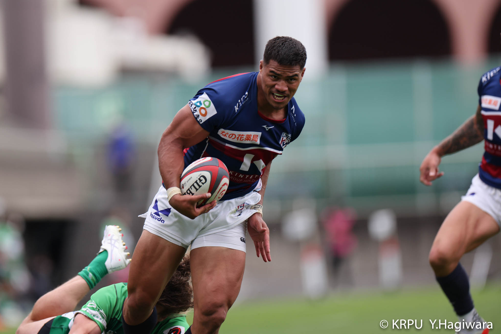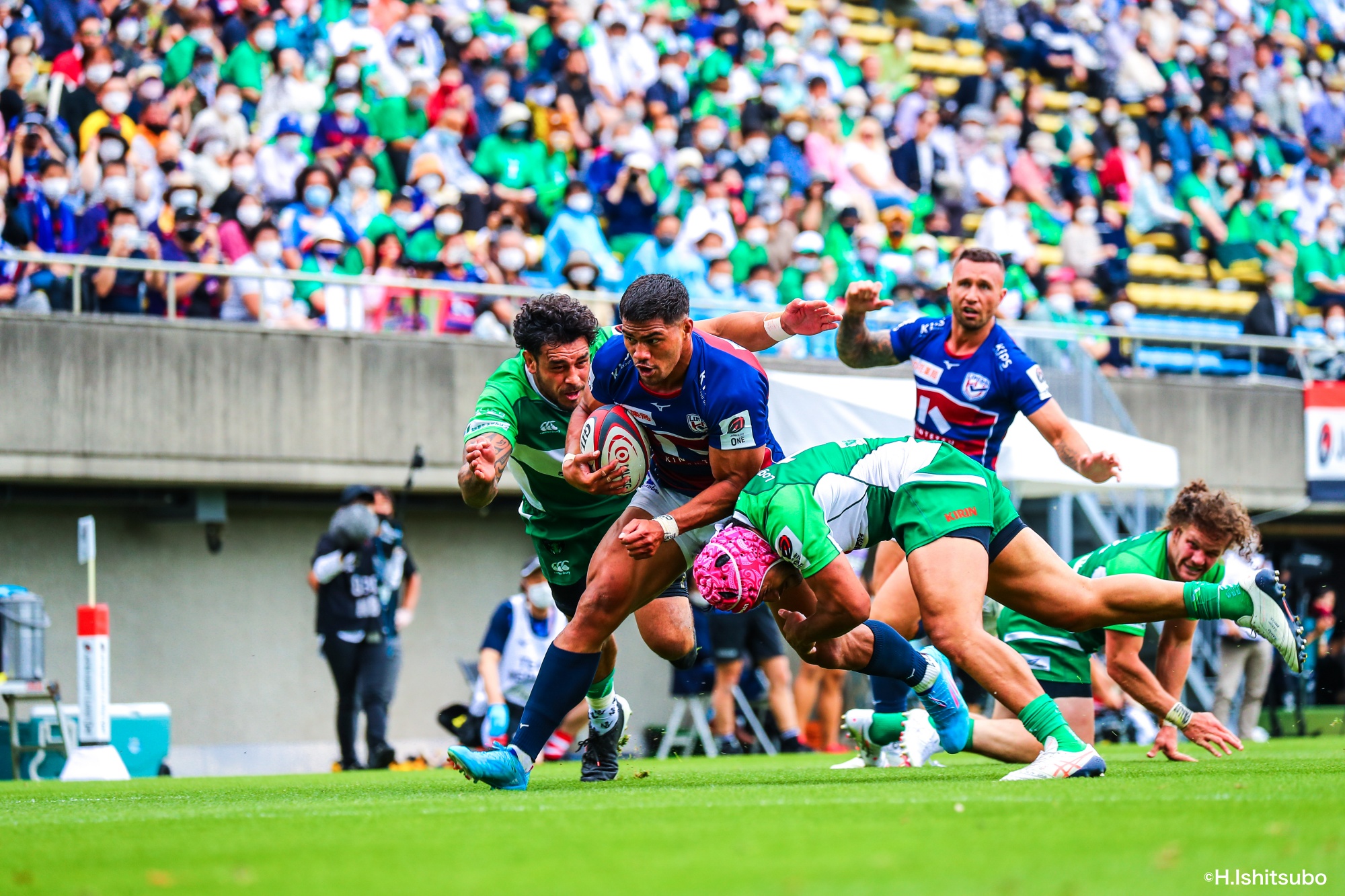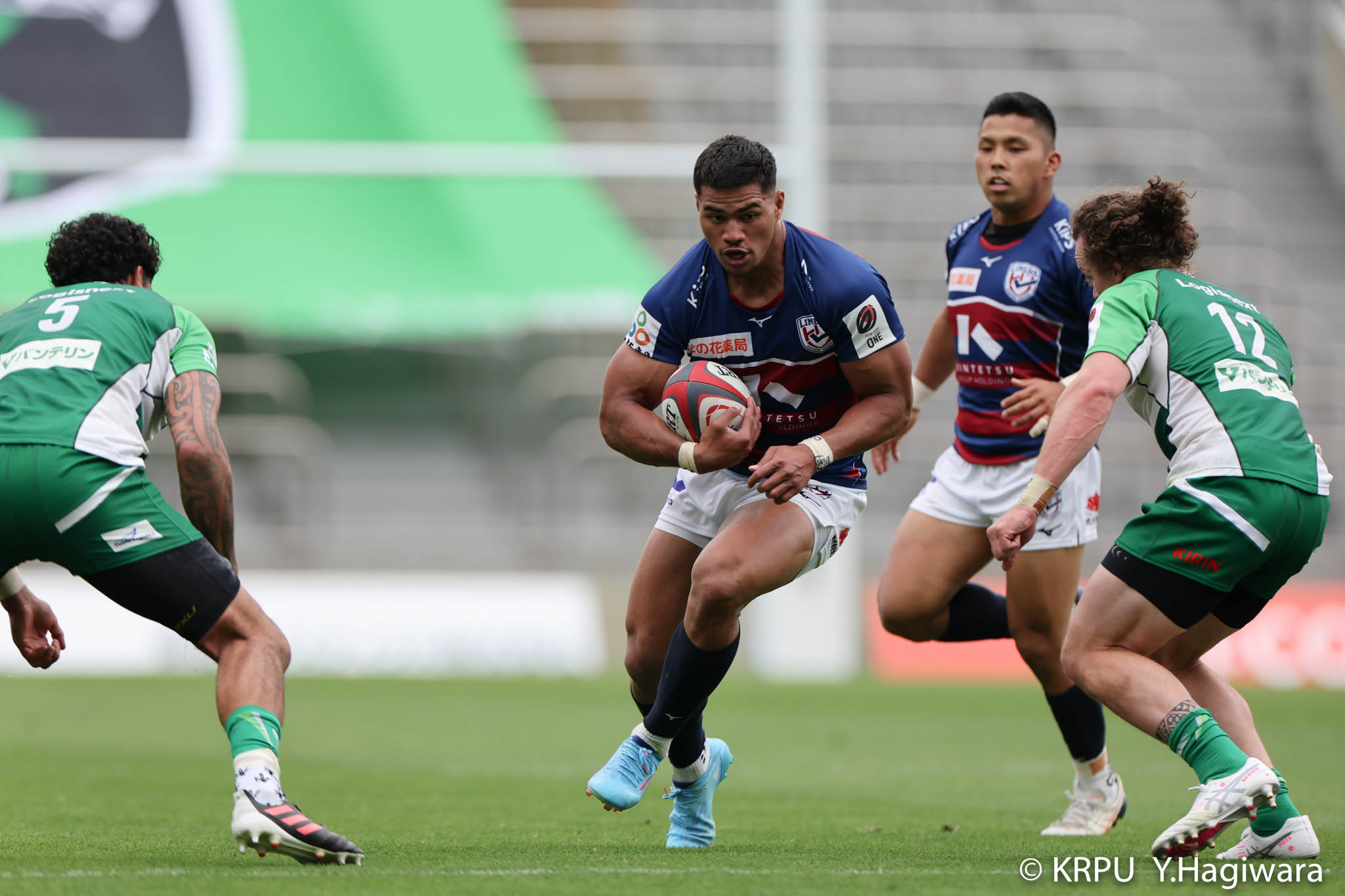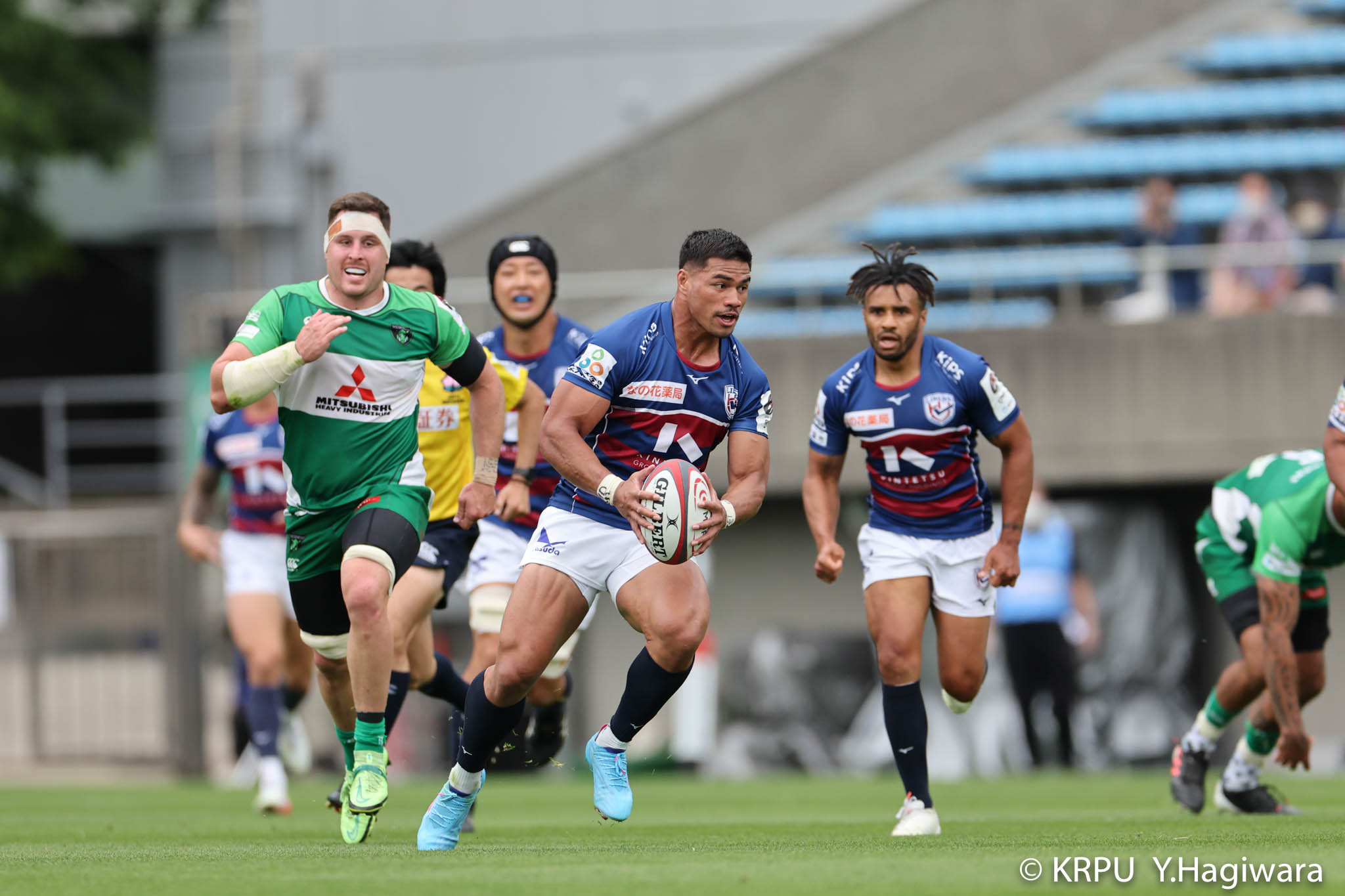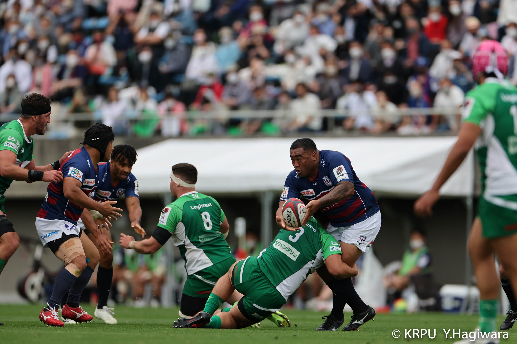 オフロードパスを駆使しながら真っ直ぐ突っ込んでくるダイナボアーズ。ディフェンスで応戦しますが間に合わず、前半18分にトライを許します。