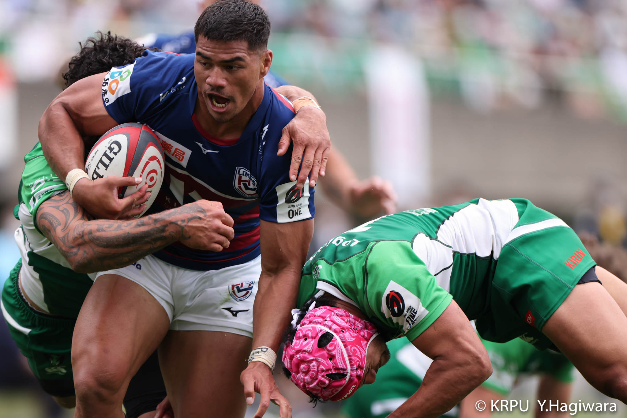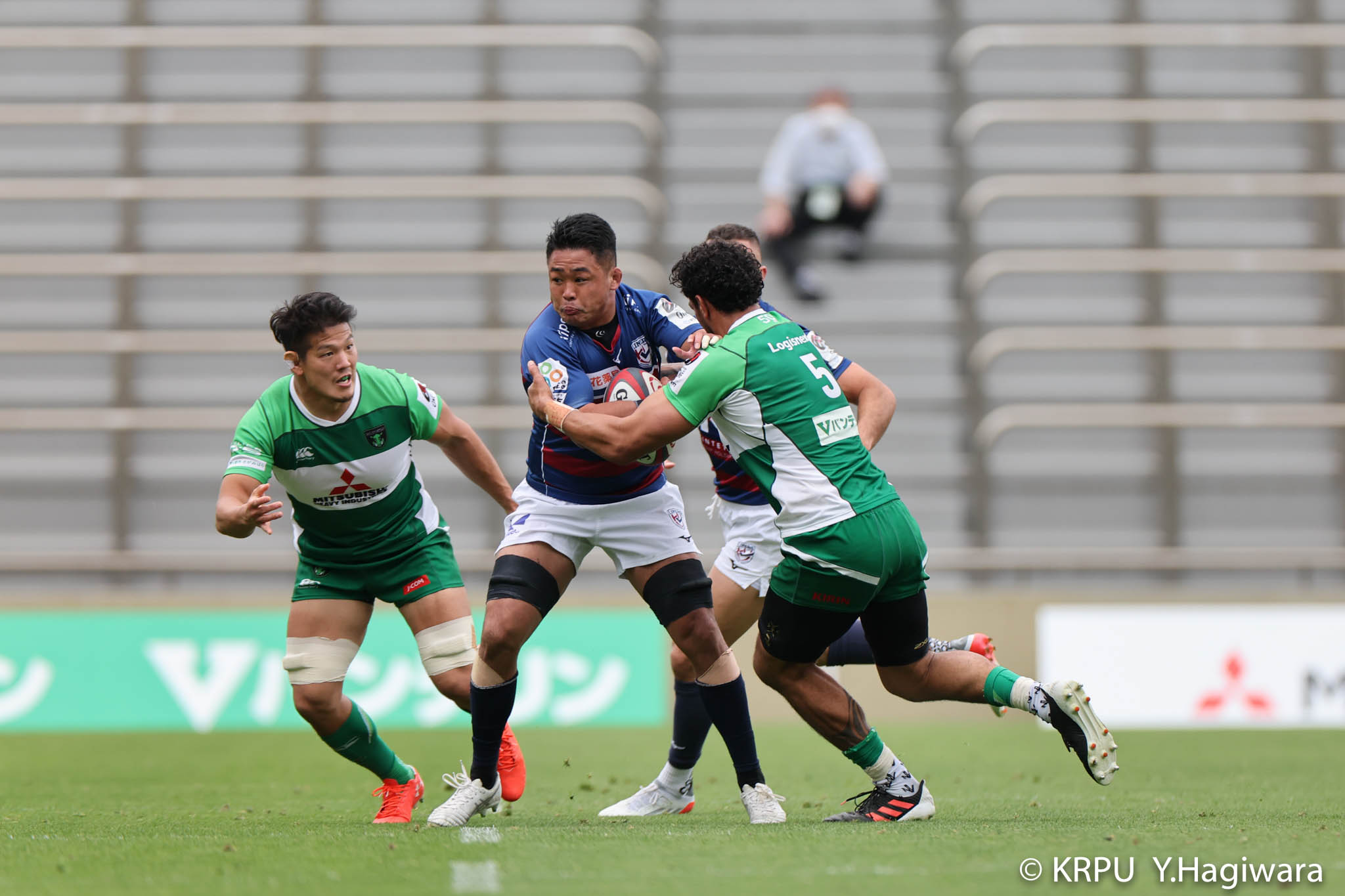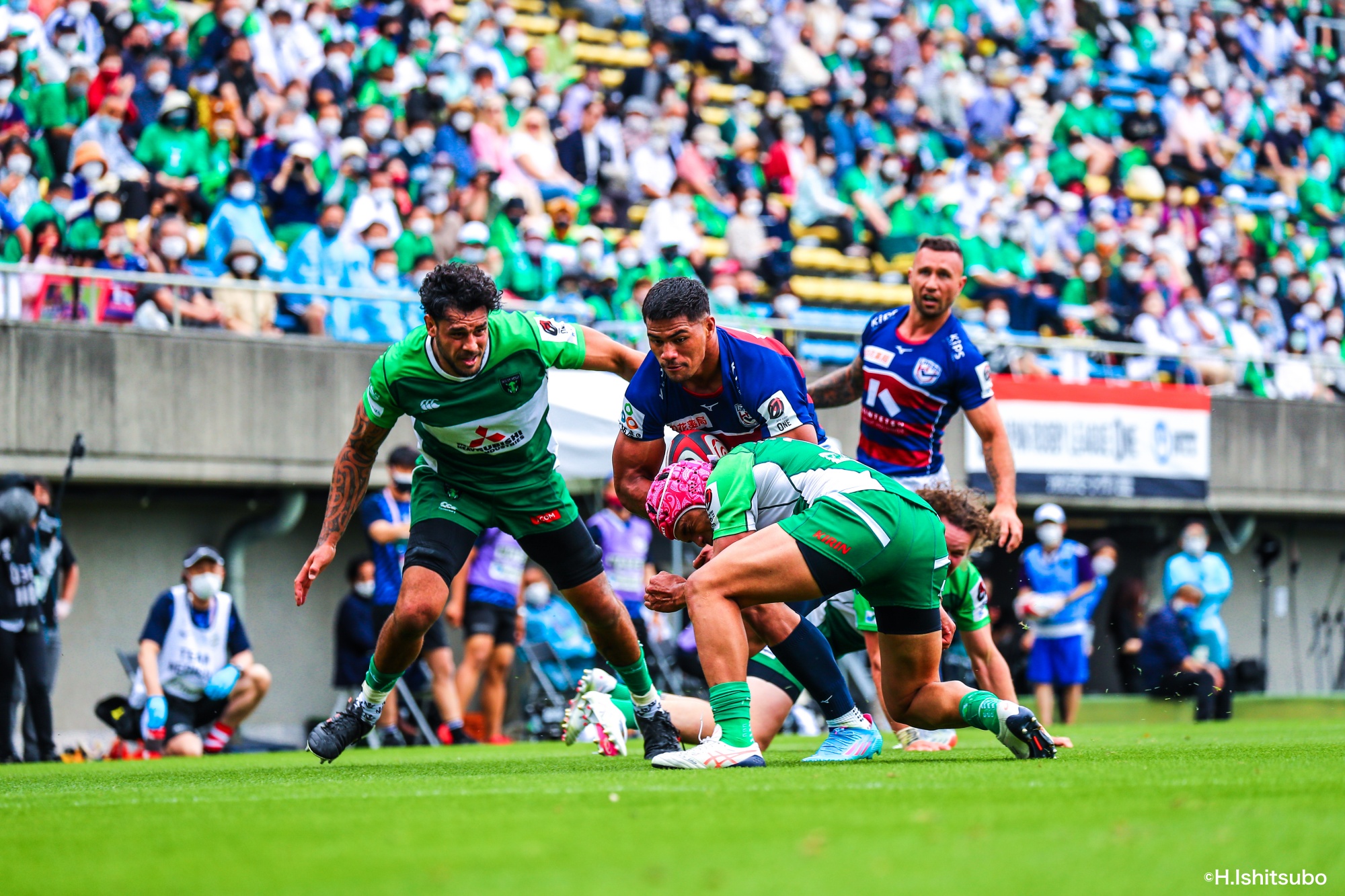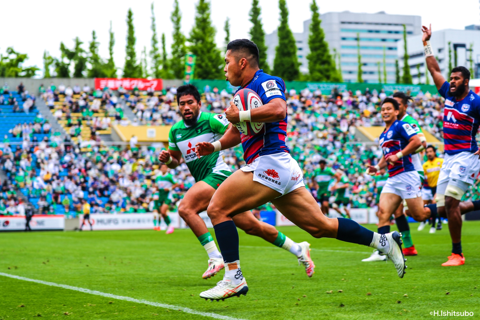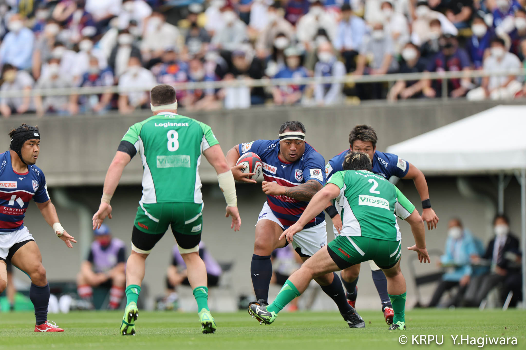 オフロードパスを駆使しながら真っ直ぐ突っ込んでくるダイナボアーズ。ディフェンスで応戦しますが間に合わず、前半18分にトライを許します。