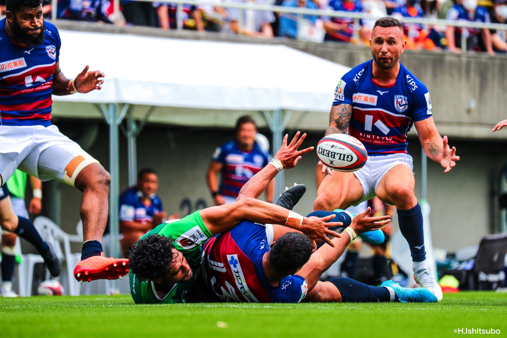 リスタートから切り替えるライナーズ。グラウンドをワイドに使って攻め上げます。ハーフウェイライン付近で15竹田がタックルを受けながらも倒れず耐えると、クーパーへ。さらに左へワクァ、片岡と左へ回し、トライを取り返します。