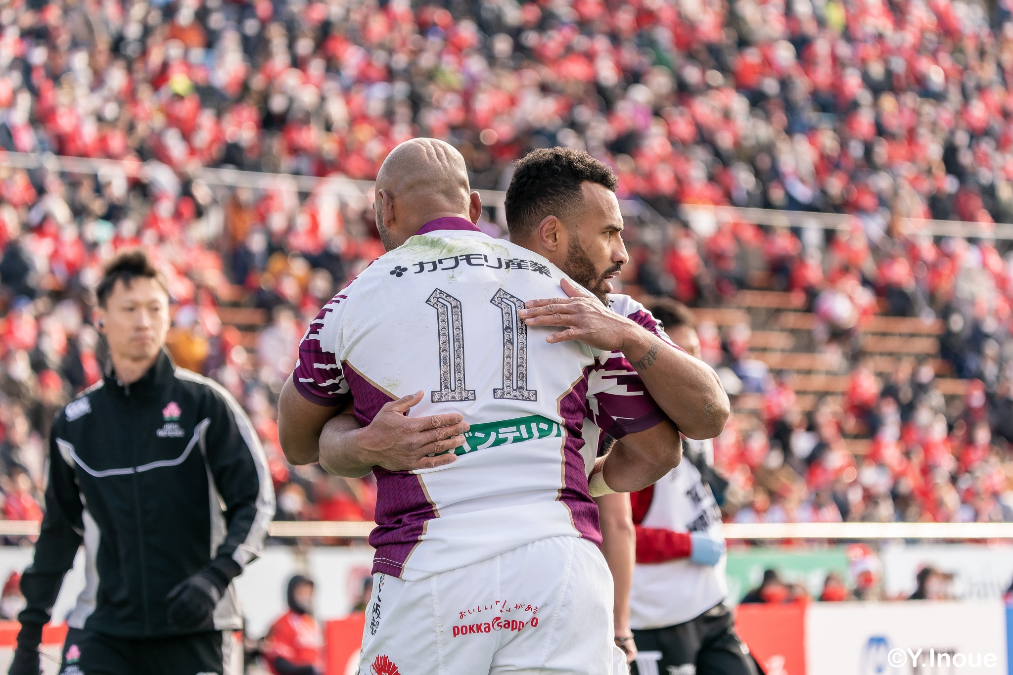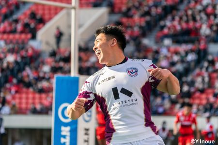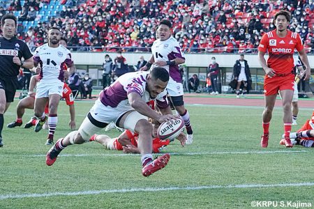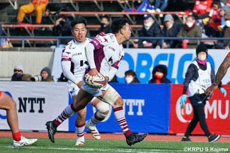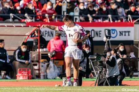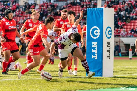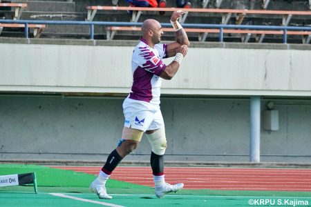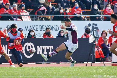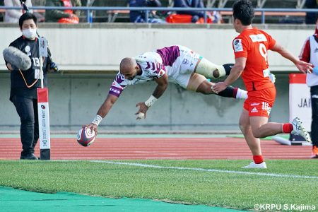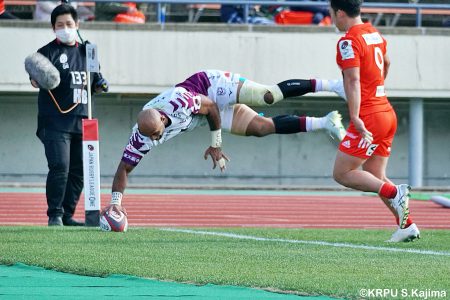 リザーブで入っていた21人羅が裏に蹴ると、追ったジョシュアが中央にトライを決めます。バショップのG成功で36-58。
