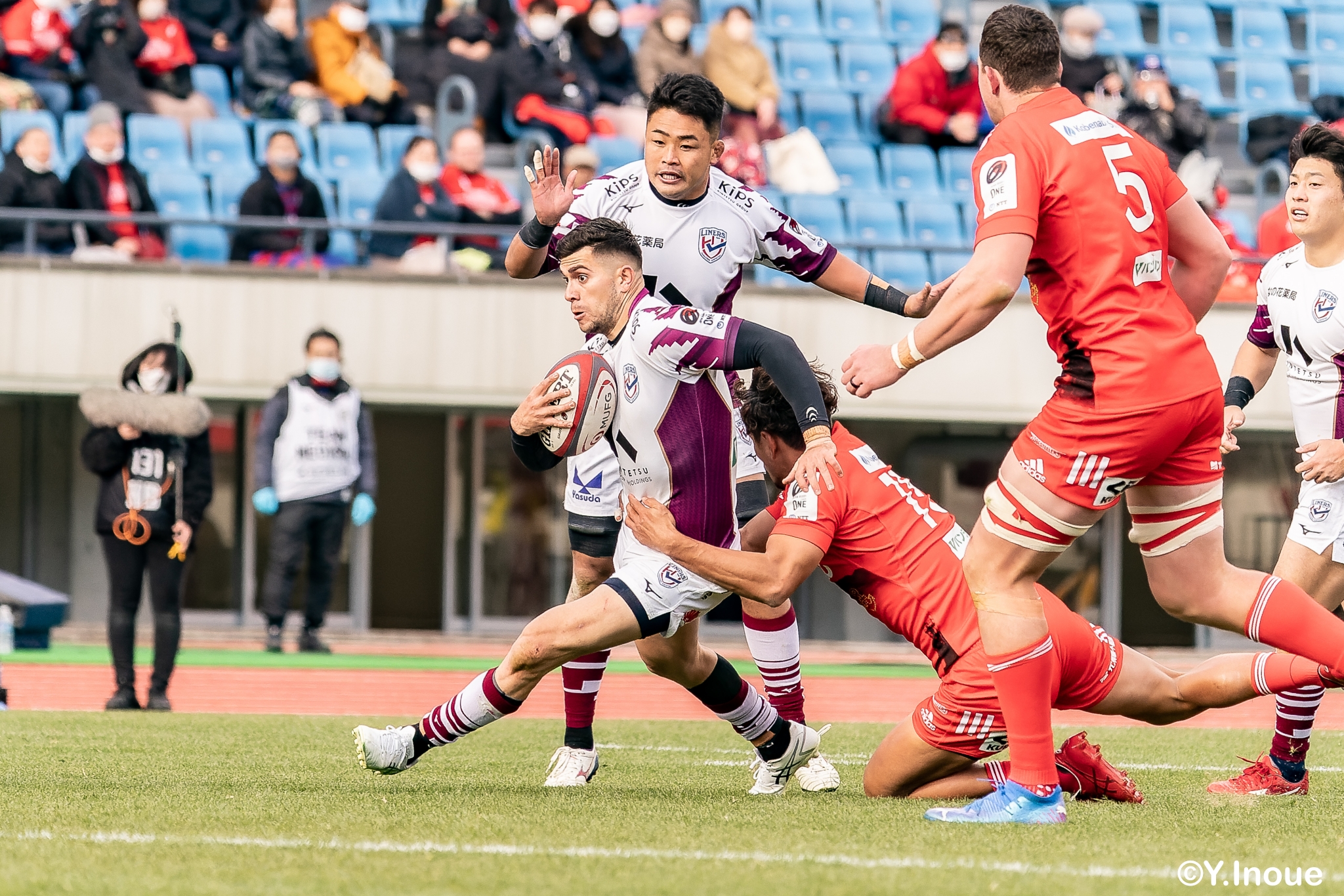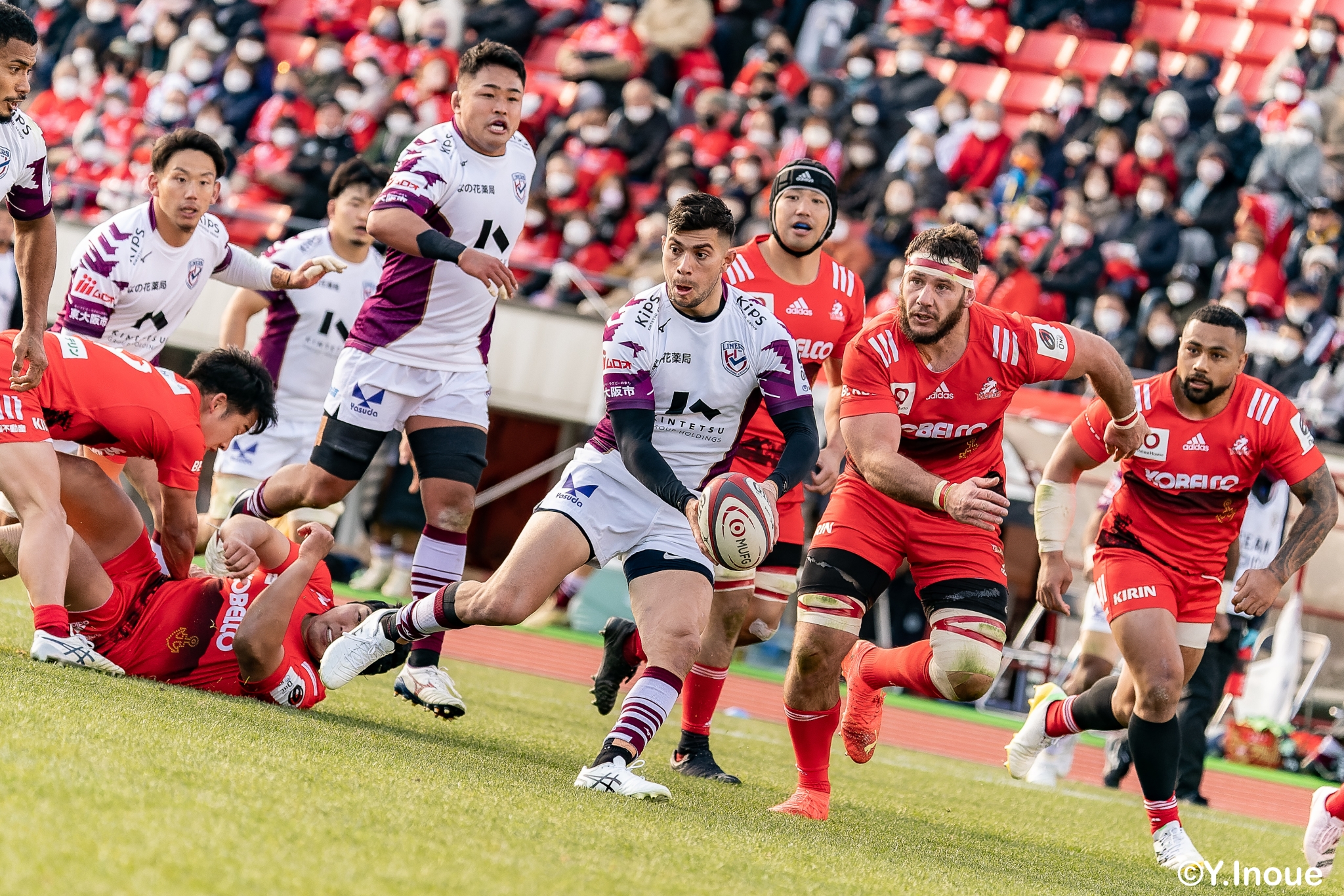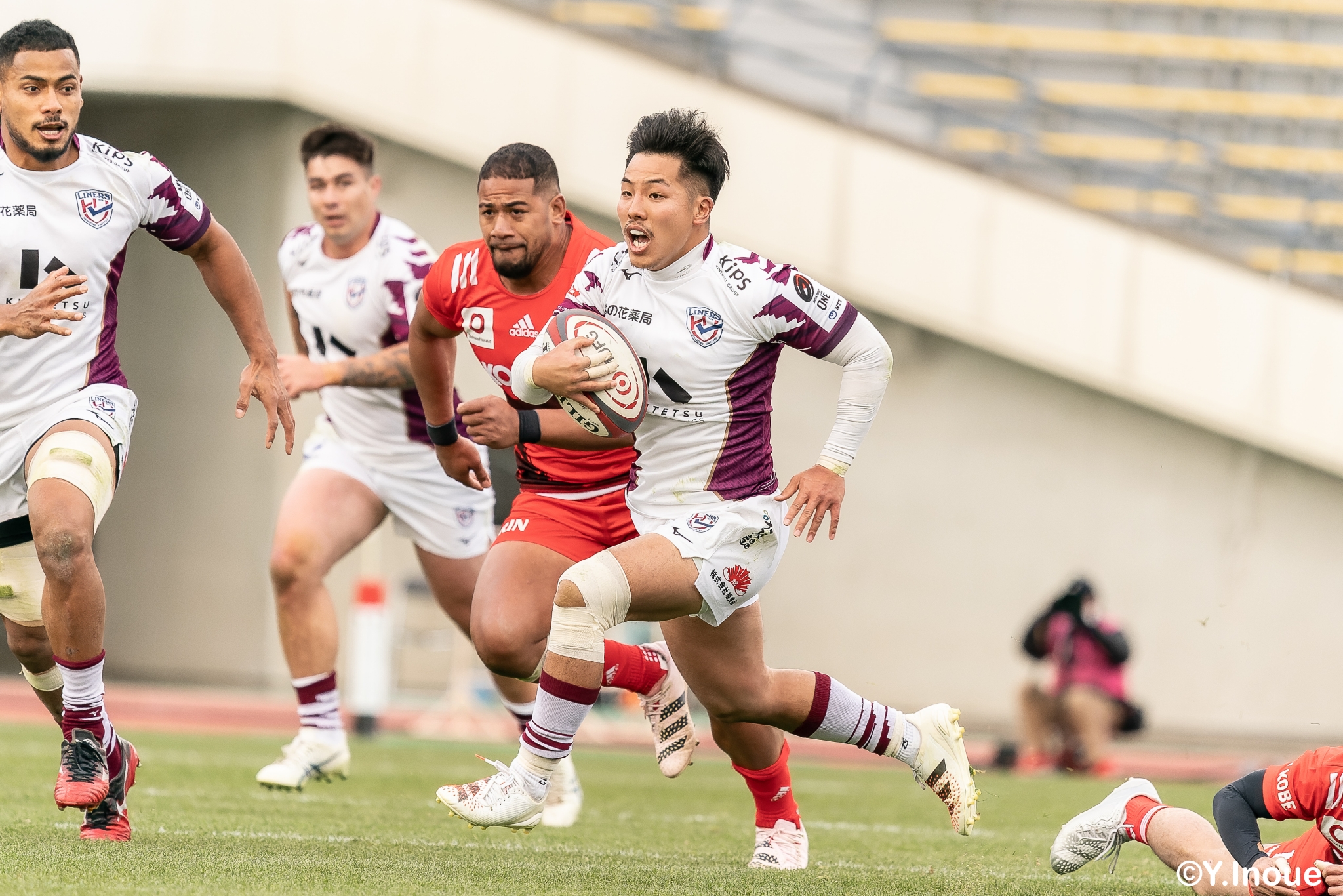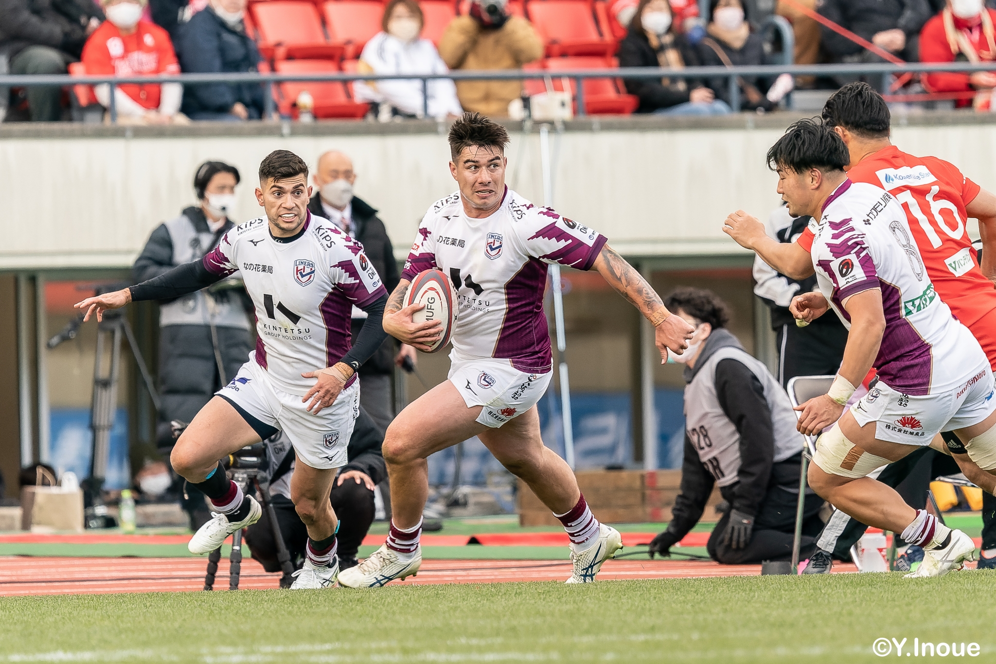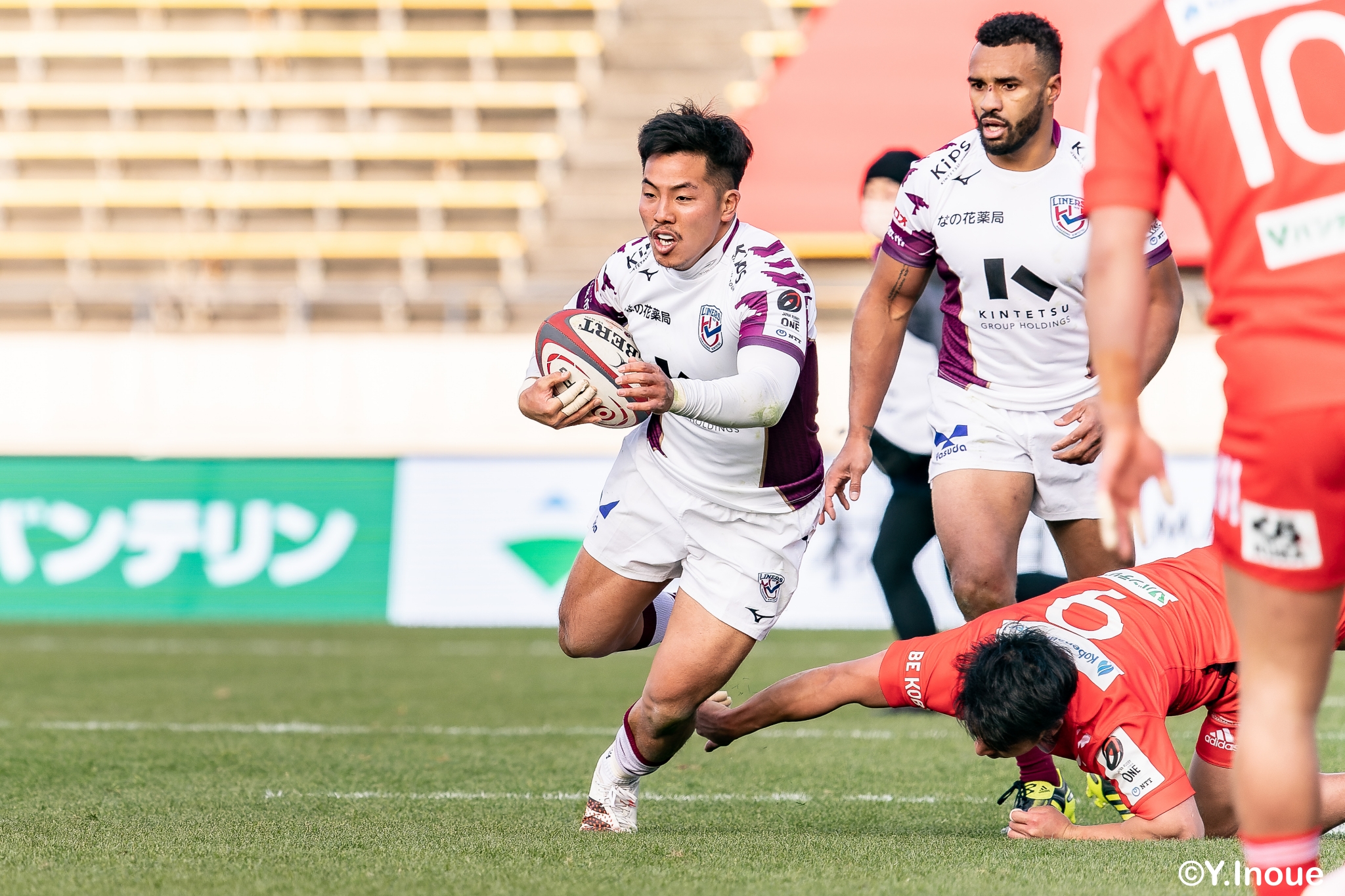 もう1本取られ、14-22で迎えた前半33分。相手のシンビンで数的有利な状況のライナーズは、パスを回して相手ディフェンスを翻弄します。