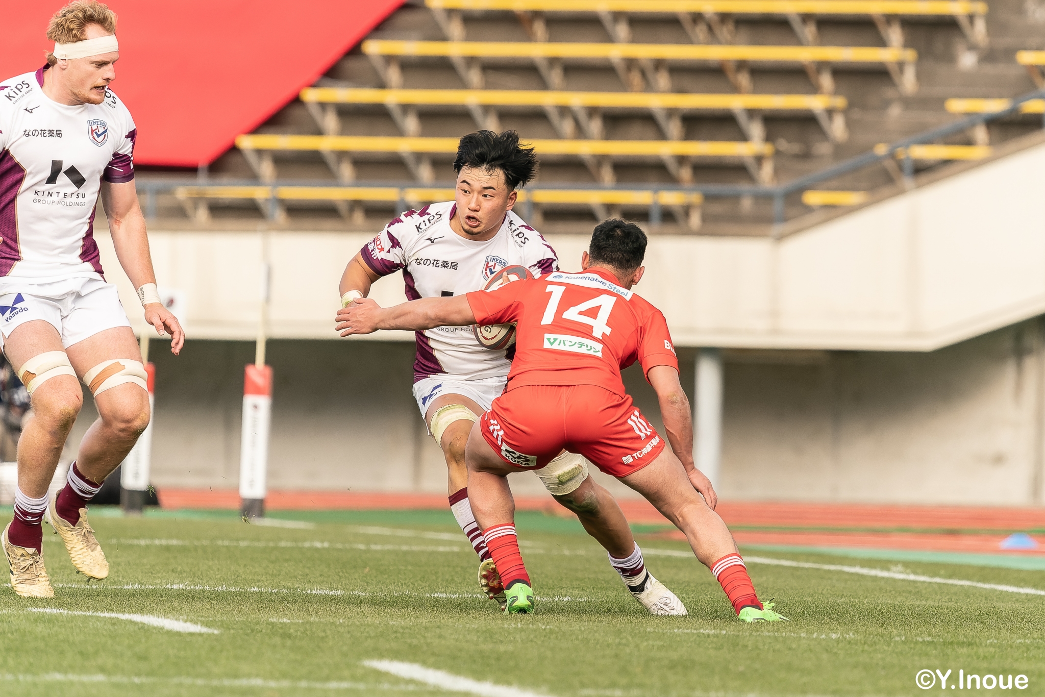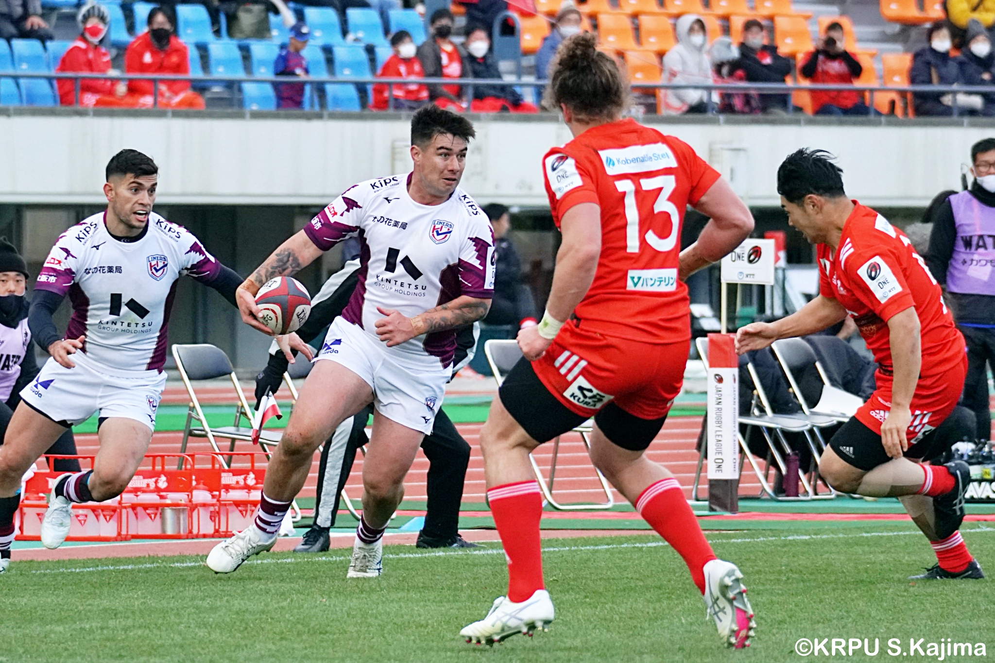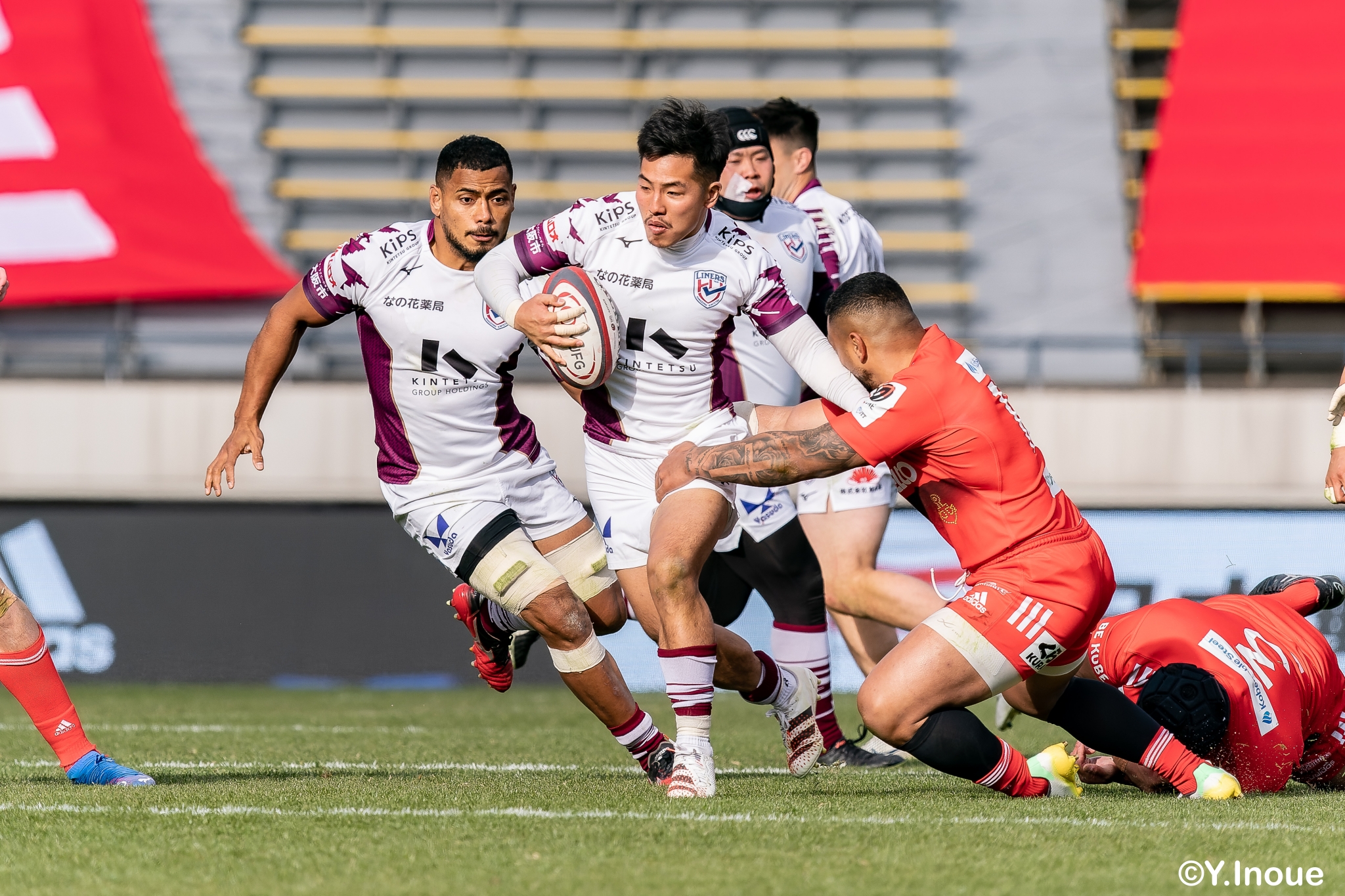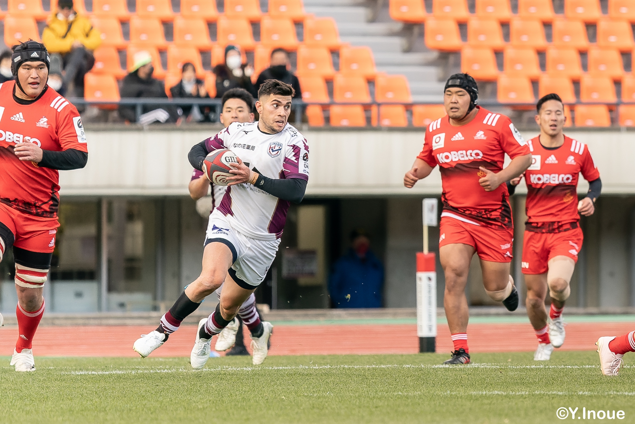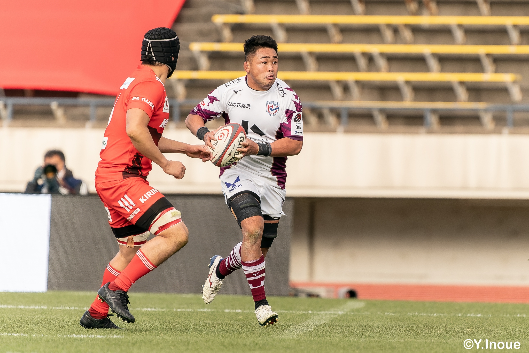 もう1本取られ、14-22で迎えた前半33分。相手のシンビンで数的有利な状況のライナーズは、パスを回して相手ディフェンスを翻弄します。
