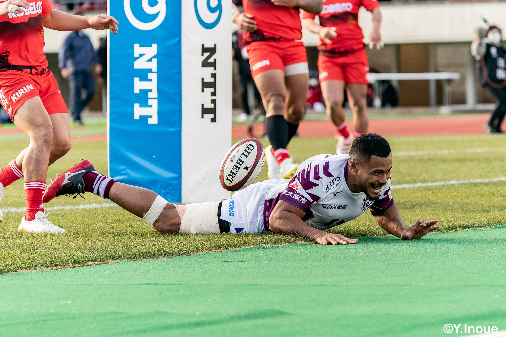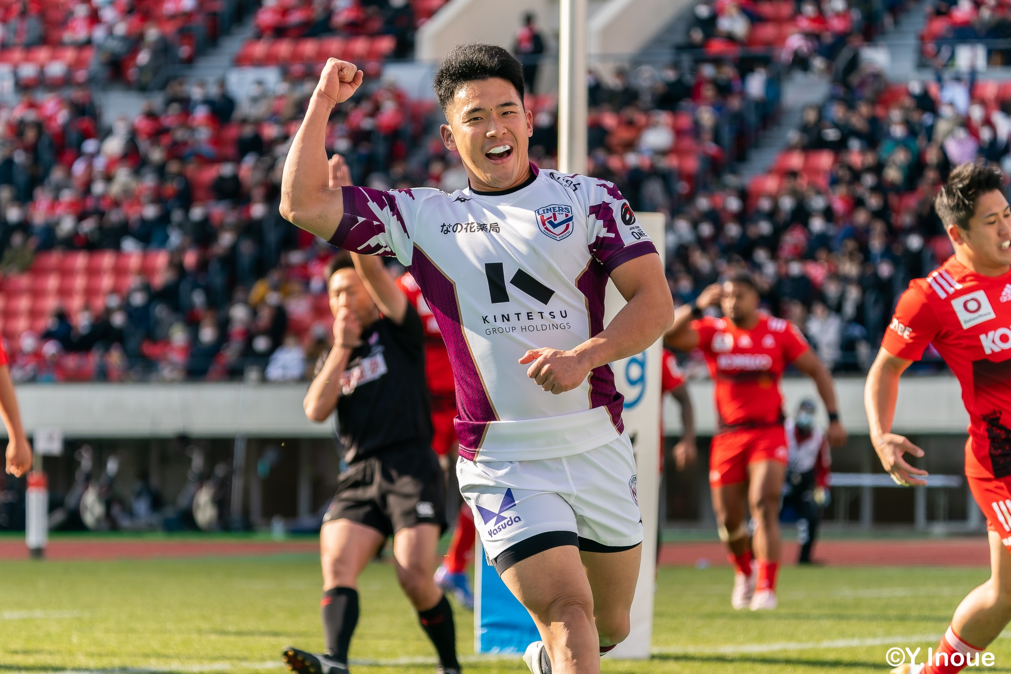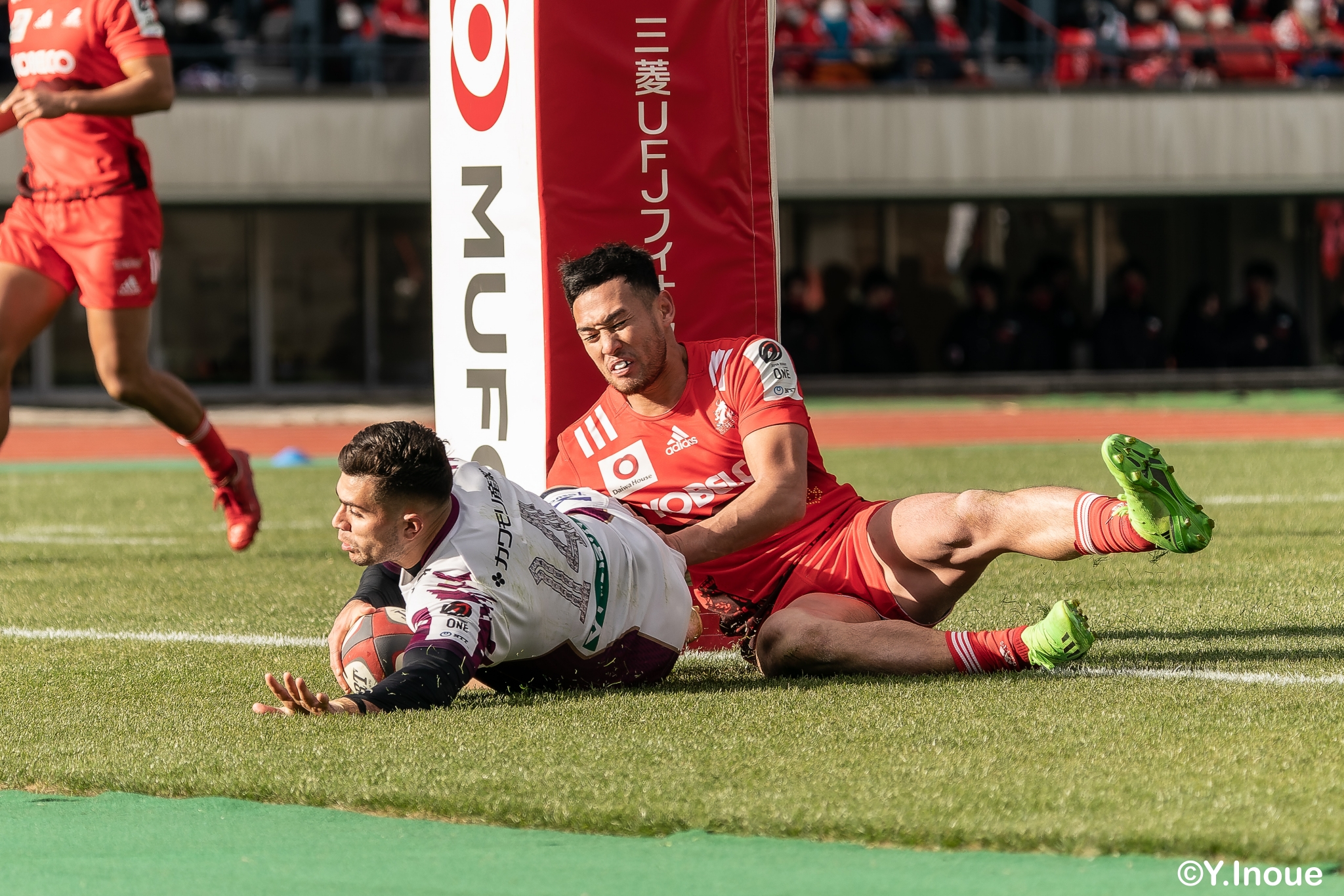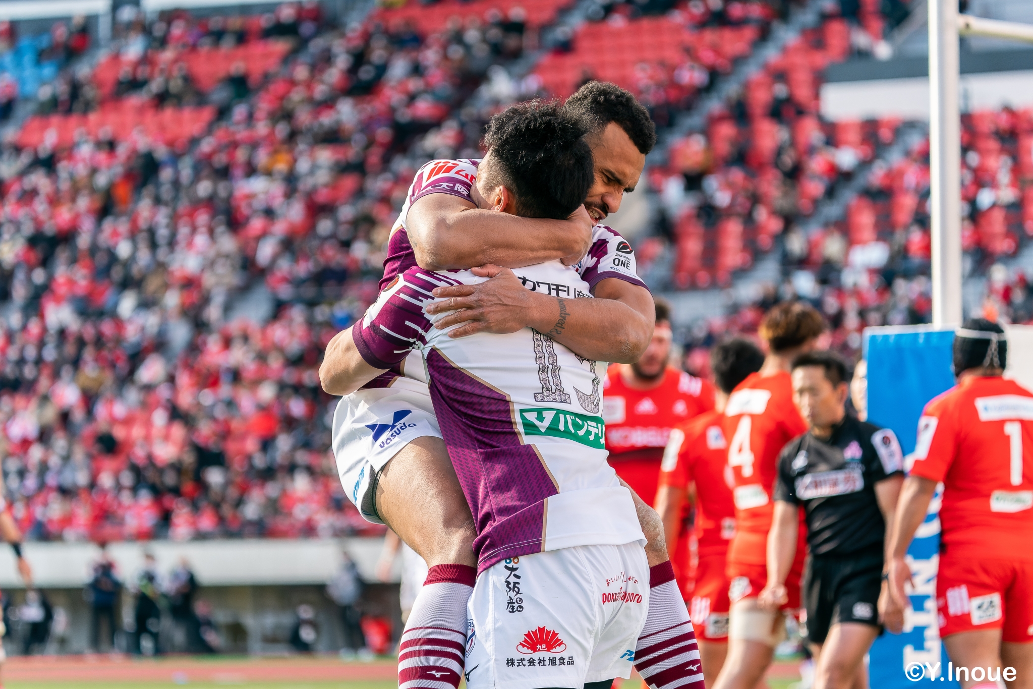 リザーブで入っていた21人羅が裏に蹴ると、追ったジョシュアが中央にトライを決めます。バショップのG成功で36-58。
