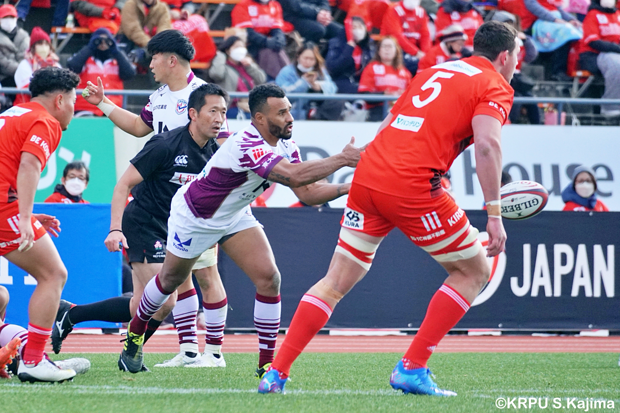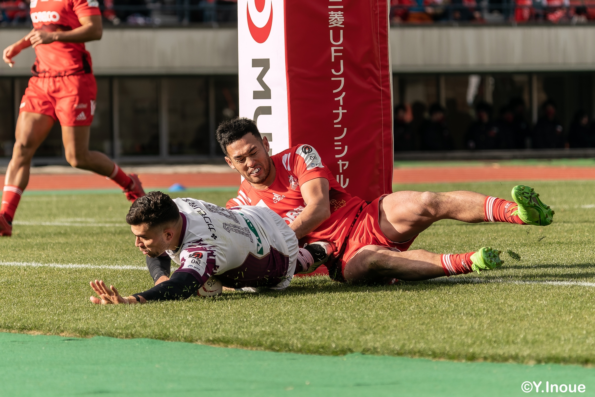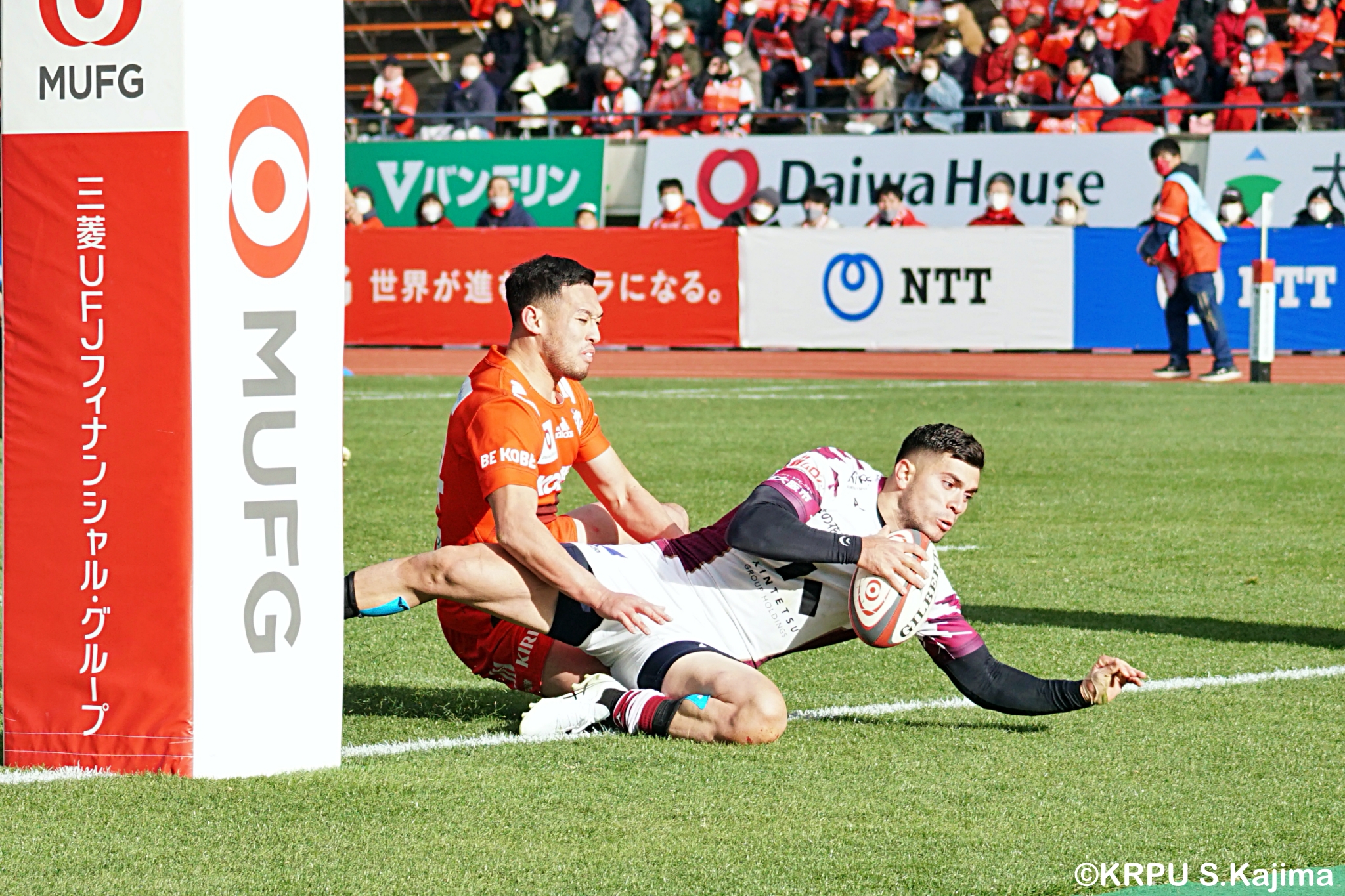 リザーブで入っていた21人羅が裏に蹴ると、追ったジョシュアが中央にトライを決めます。バショップのG成功で36-58。