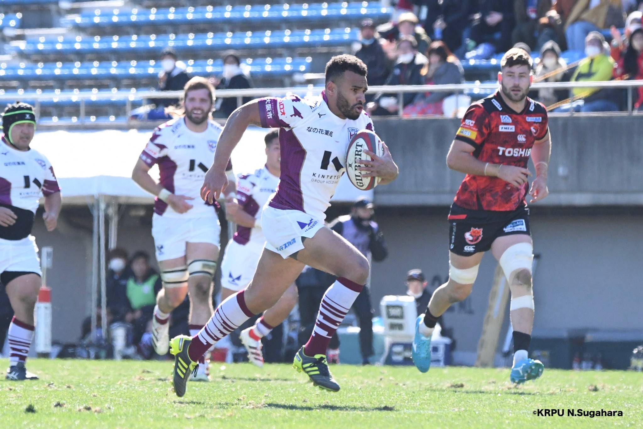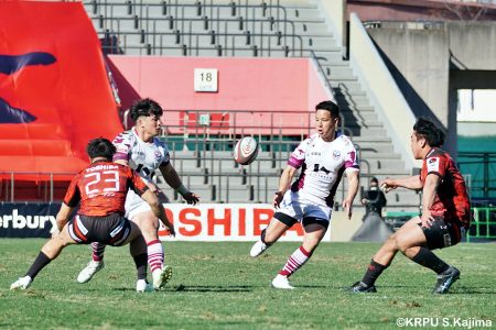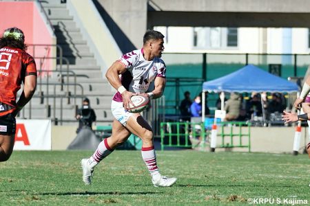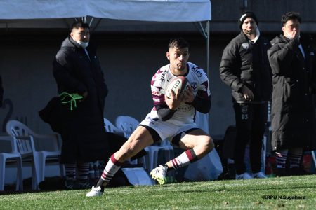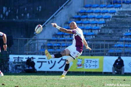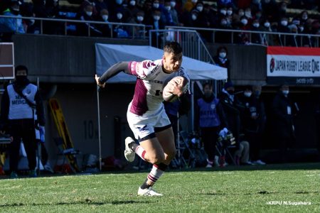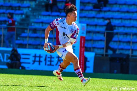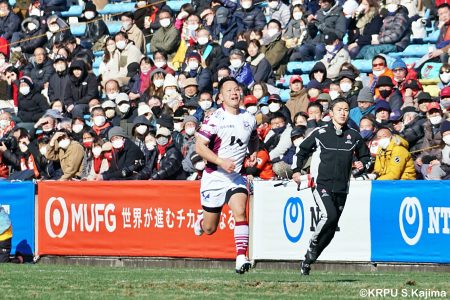 そんな中もがくライナーズは後半39分、22バショップが相手のパスをカットし10吉本へ。そこから右へ大きく蹴って、受け取った右端の14ジョシュアがトライを決めます。バショップのGも成功。