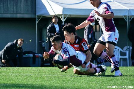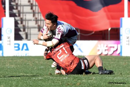 開始早々ライナーズのオフロードパスからこぼれたボールをグラバーキックしたブレイブルーパス9小川は、追いかけて自ら拾うとトライ。