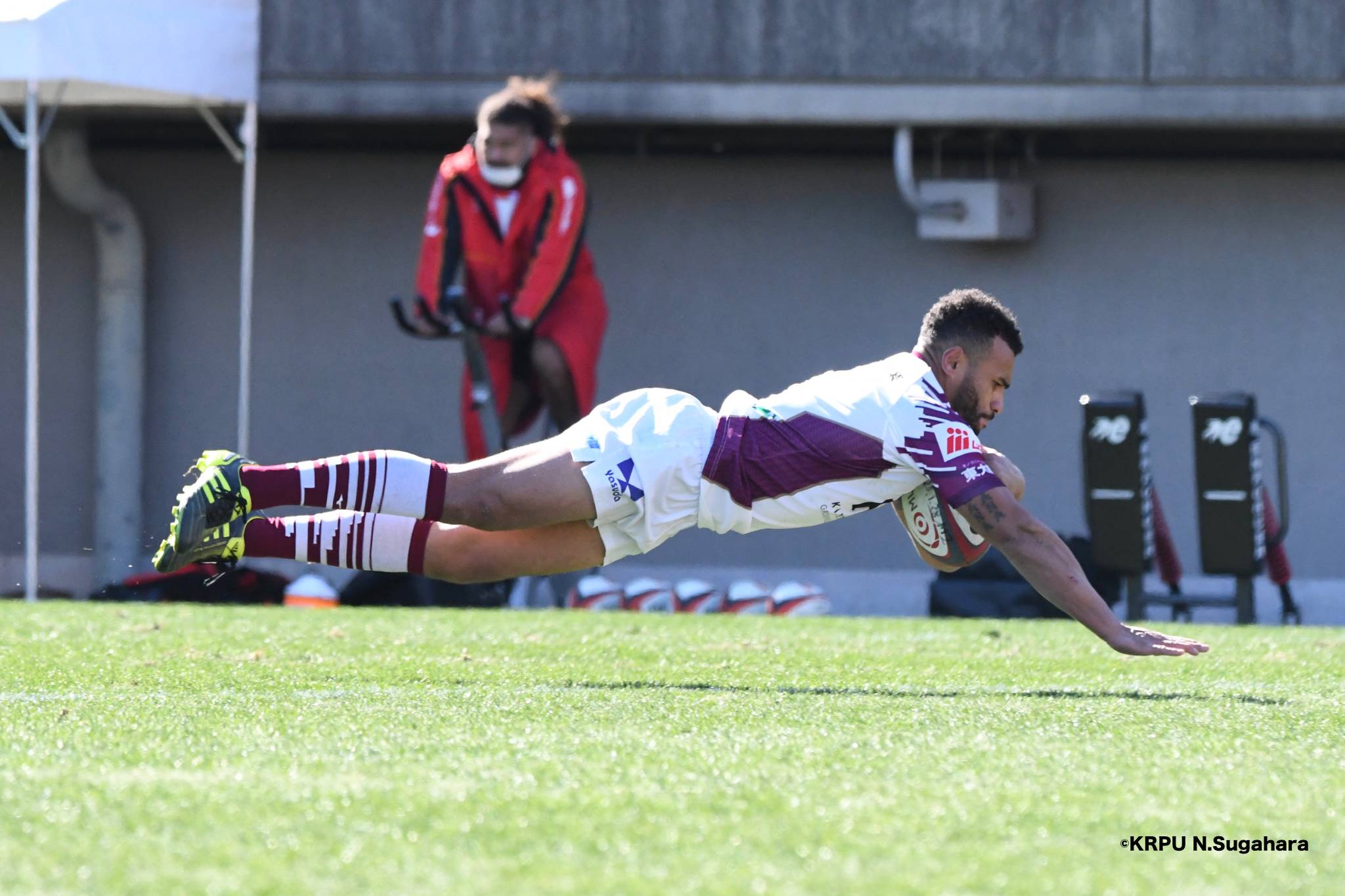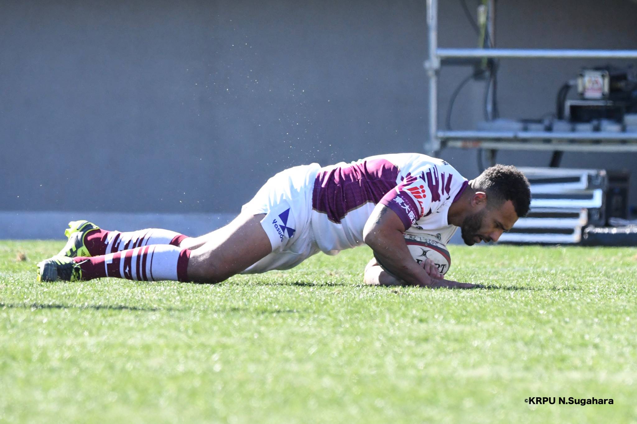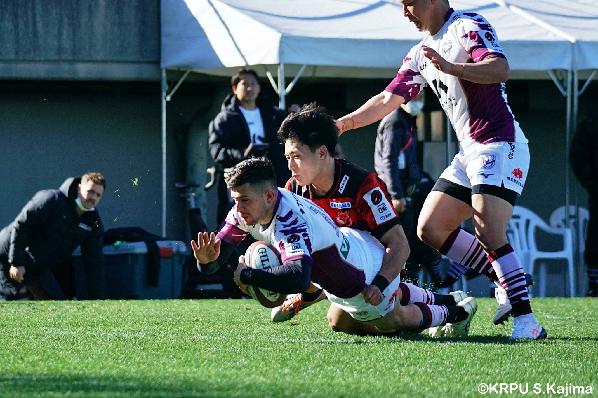 開始早々ライナーズのオフロードパスからこぼれたボールをグラバーキックしたブレイブルーパス9小川は、追いかけて自ら拾うとトライ。