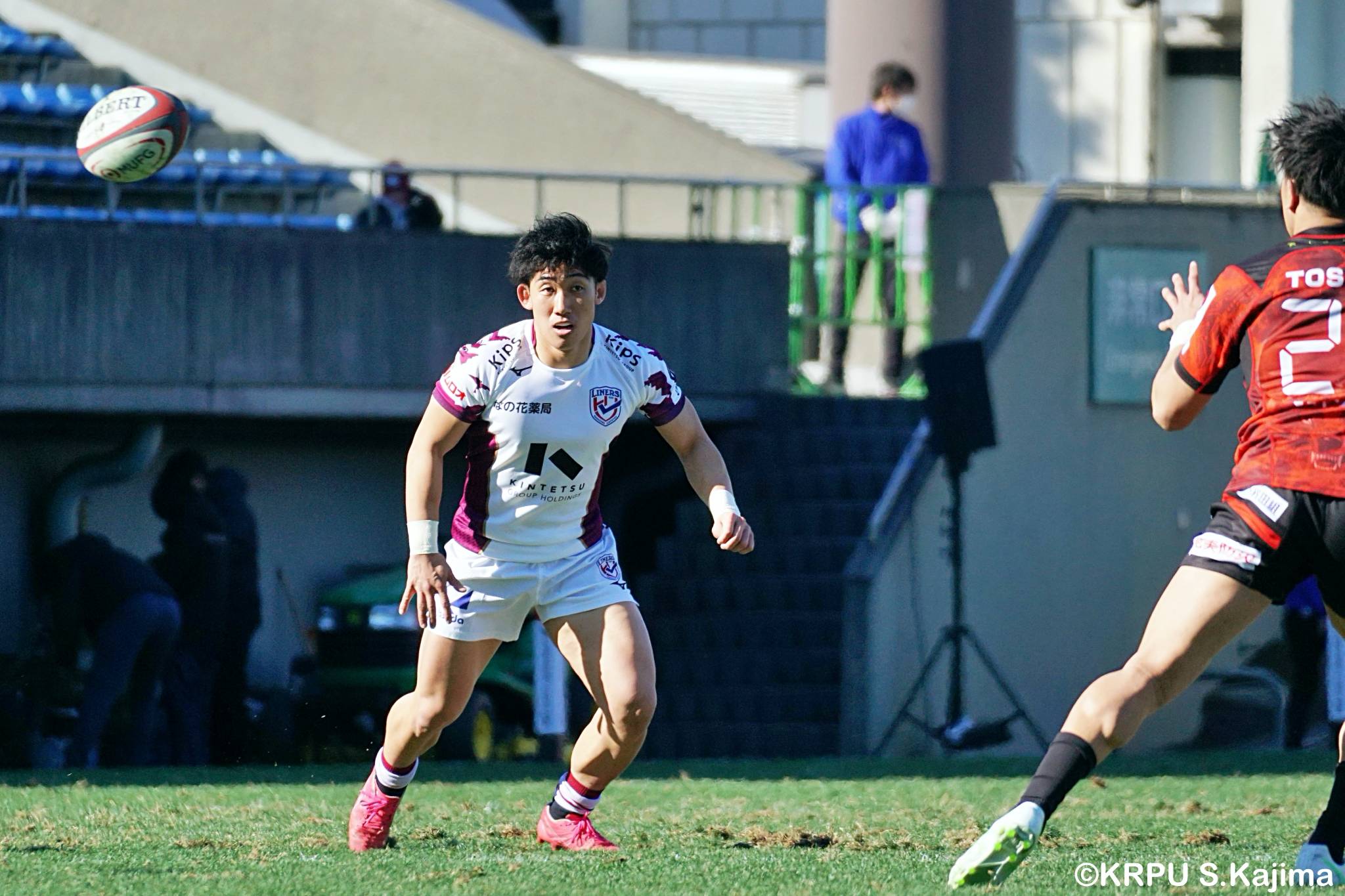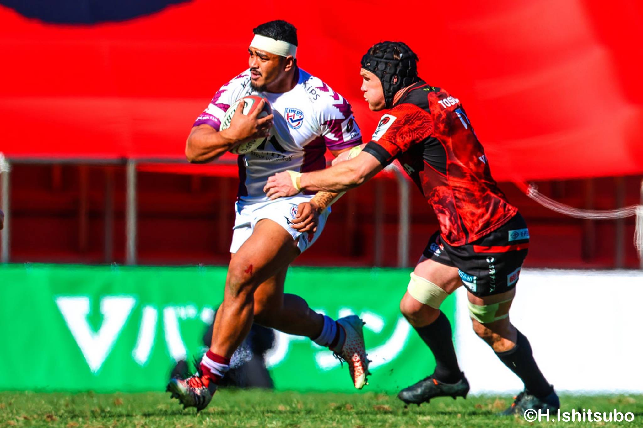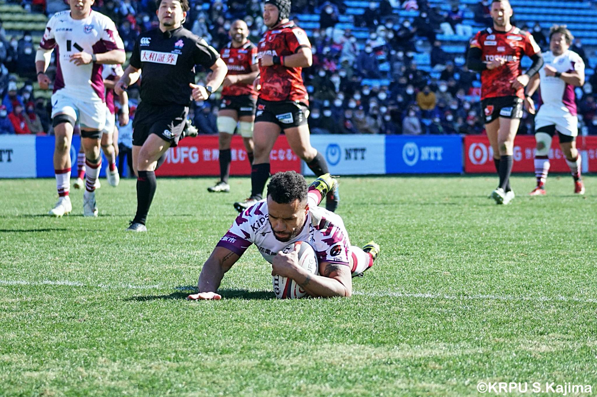 そんな中もがくライナーズは後半39分、22バショップが相手のパスをカットし10吉本へ。そこから右へ大きく蹴って、受け取った右端の14ジョシュアがトライを決めます。バショップのGも成功。