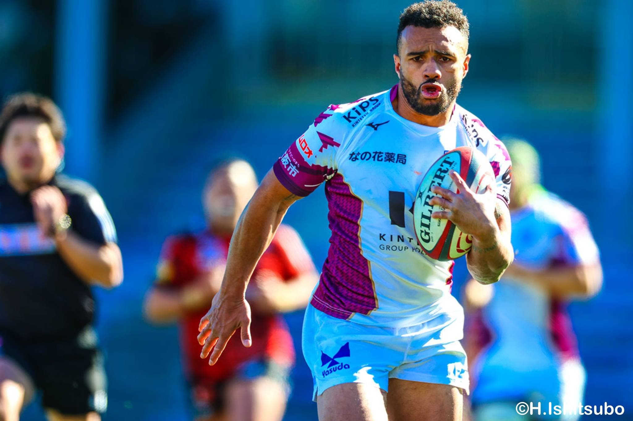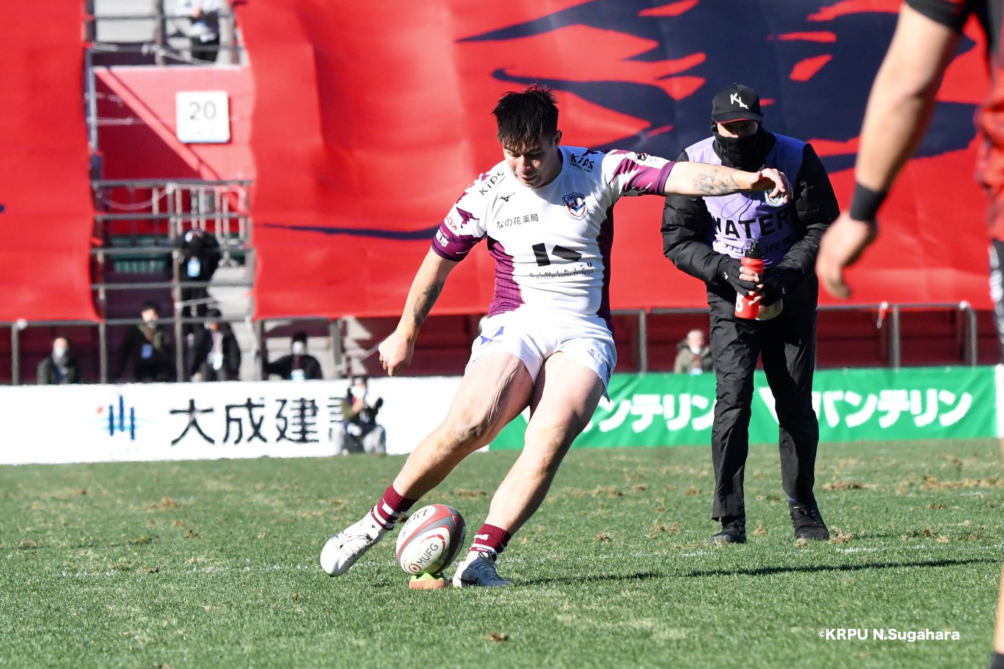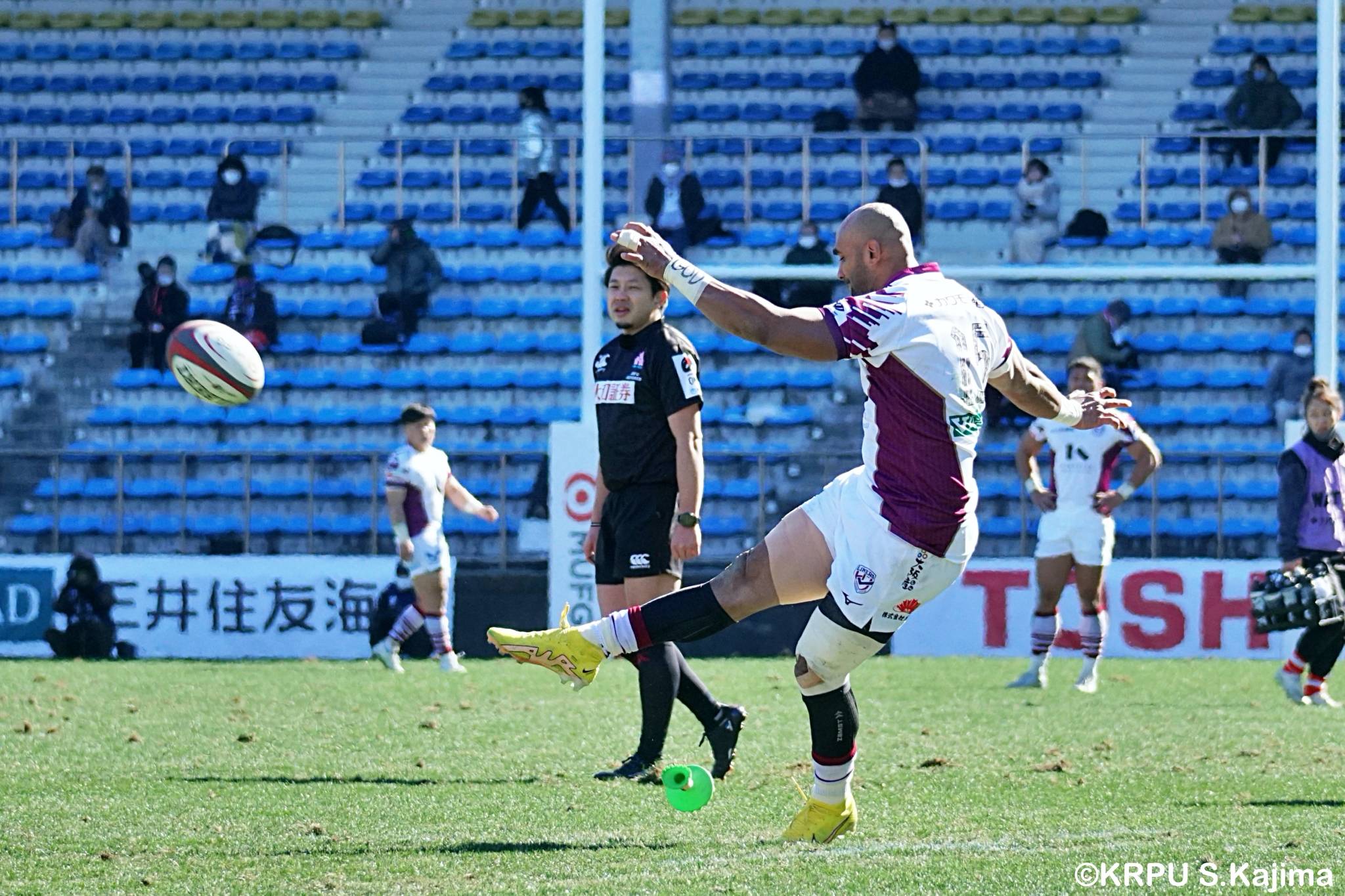 そんな中もがくライナーズは後半39分、22バショップが相手のパスをカットし10吉本へ。そこから右へ大きく蹴って、受け取った右端の14ジョシュアがトライを決めます。バショップのGも成功。