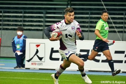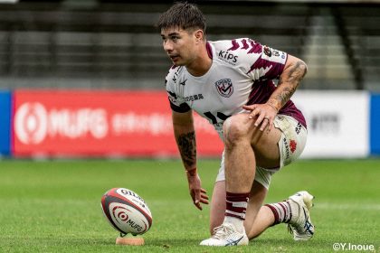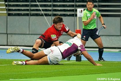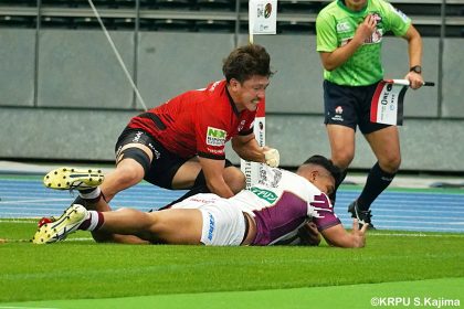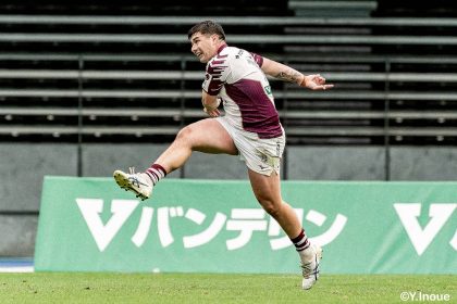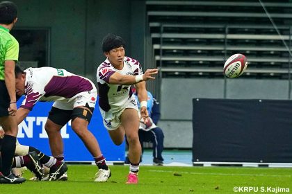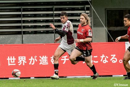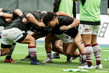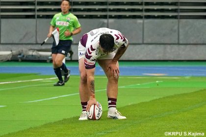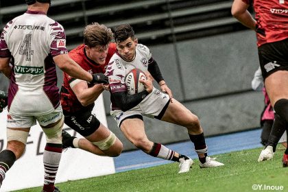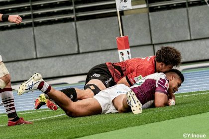 スクラムで相手のコラプシングを誘って陣地を前へ進めると、マイボールラインアウトのサインプレーから短く素早いパスを右へ回して11セフォが相手ディフェンスを引きずりトライ。10バショップのゴールは外れますが、1本返します。