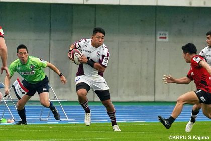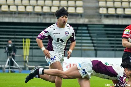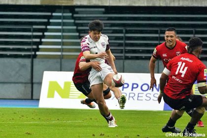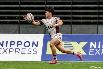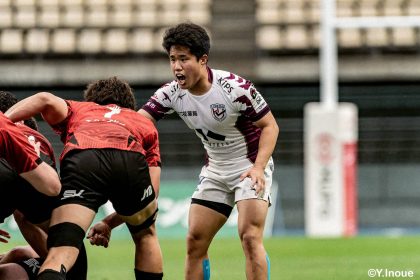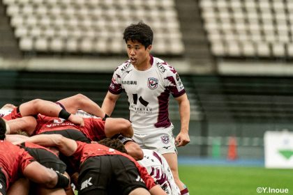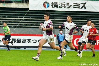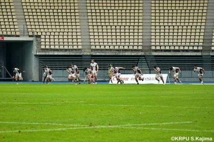 相手のタックルを受けながらボールをつなげると、後半13分に6菅原がビッグゲイン。2人抜くと、後ろから走ってきたバショップに渡してトライを決めます。バショップのGも成功し、後半先制点を奪います。
