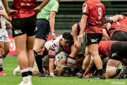 10バショップから13岡村、12ステイリンが抜けて14ジョシュアがインゴールにグラウンディングする良い形のアタックもありましたが、その前のプレーでオブストラクション。トライに結びつきません。