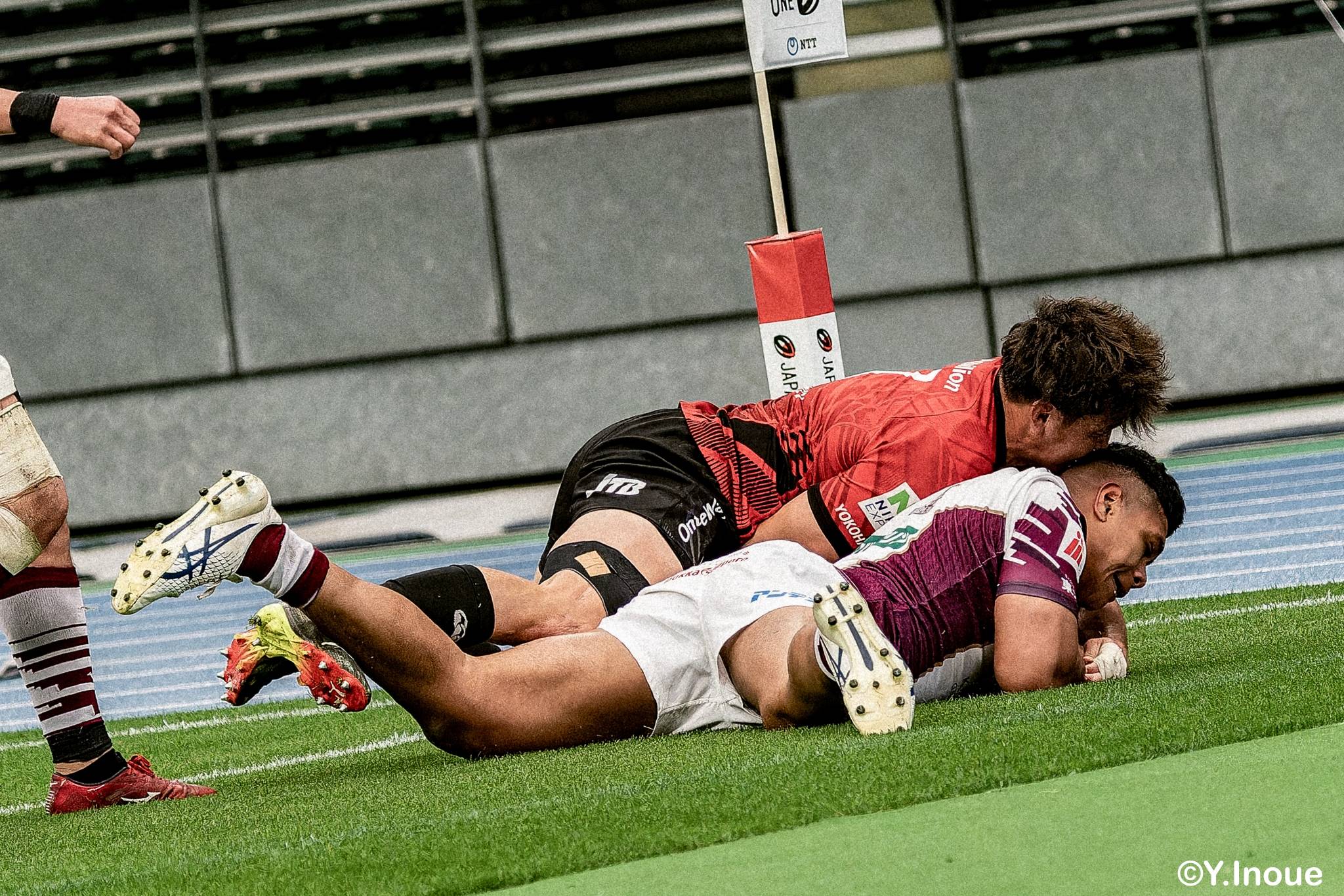 ダブルタックルで阻もうとしますが、ディフェンスをやぶられ相手6ファンダイクのトライ。