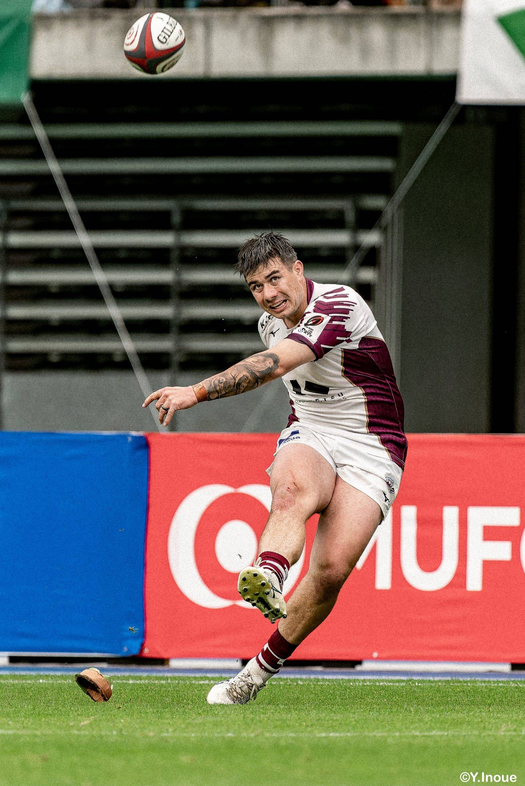 スクラムで相手のコラプシングを誘って陣地を前へ進めると、マイボールラインアウトのサインプレーから短く素早いパスを右へ回して11セフォが相手ディフェンスを引きずりトライ。10バショップのゴールは外れますが、1本返します。