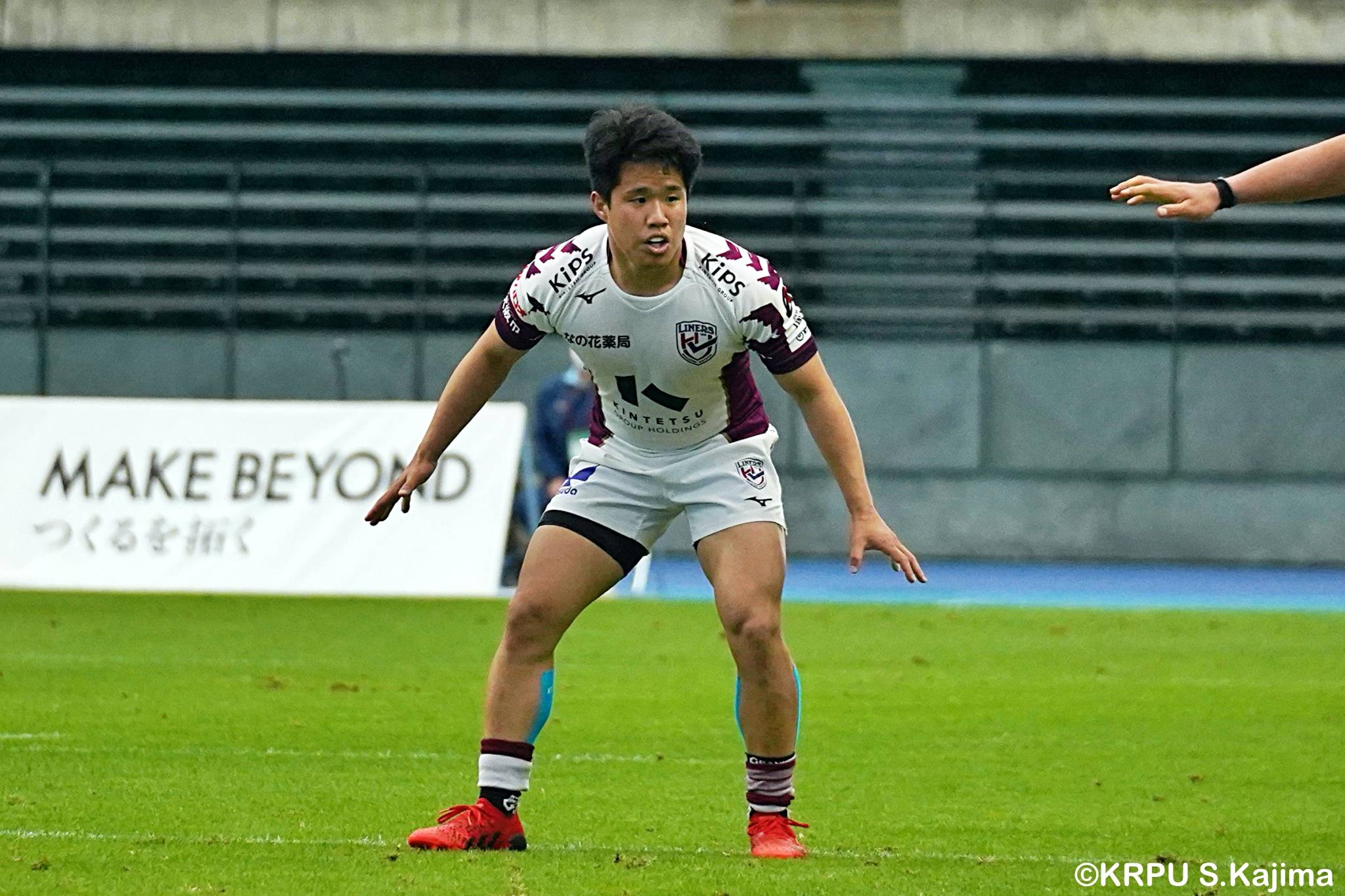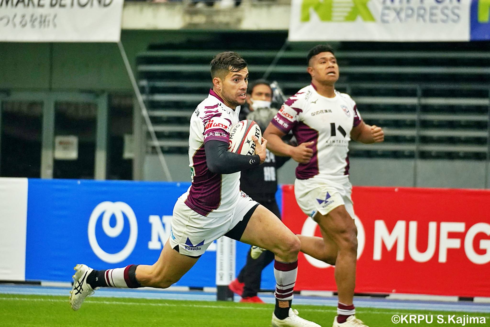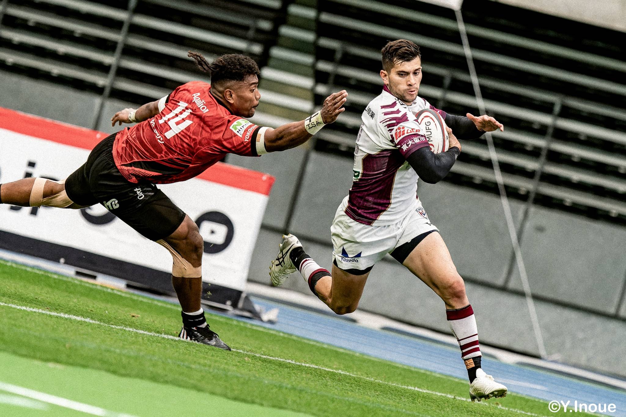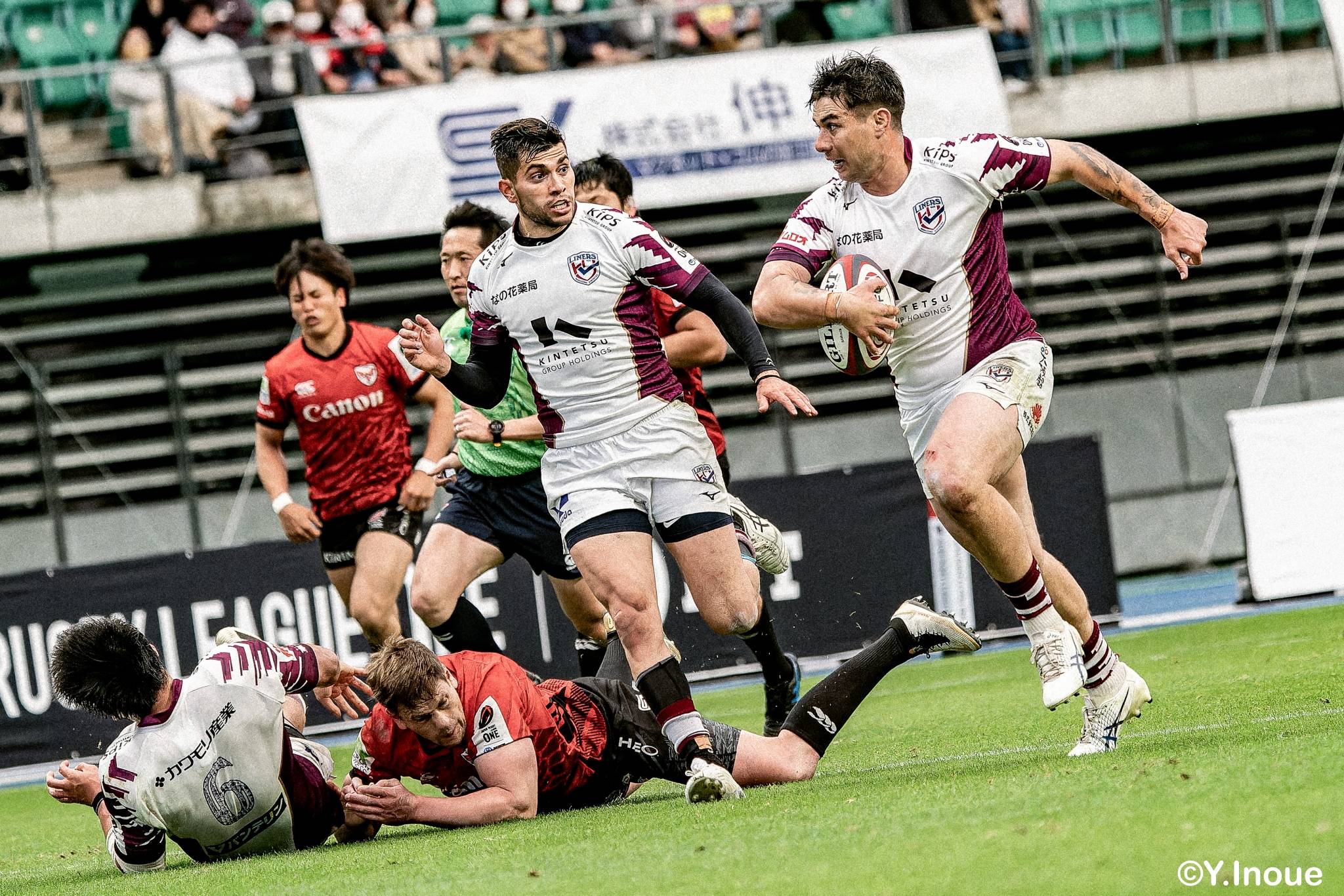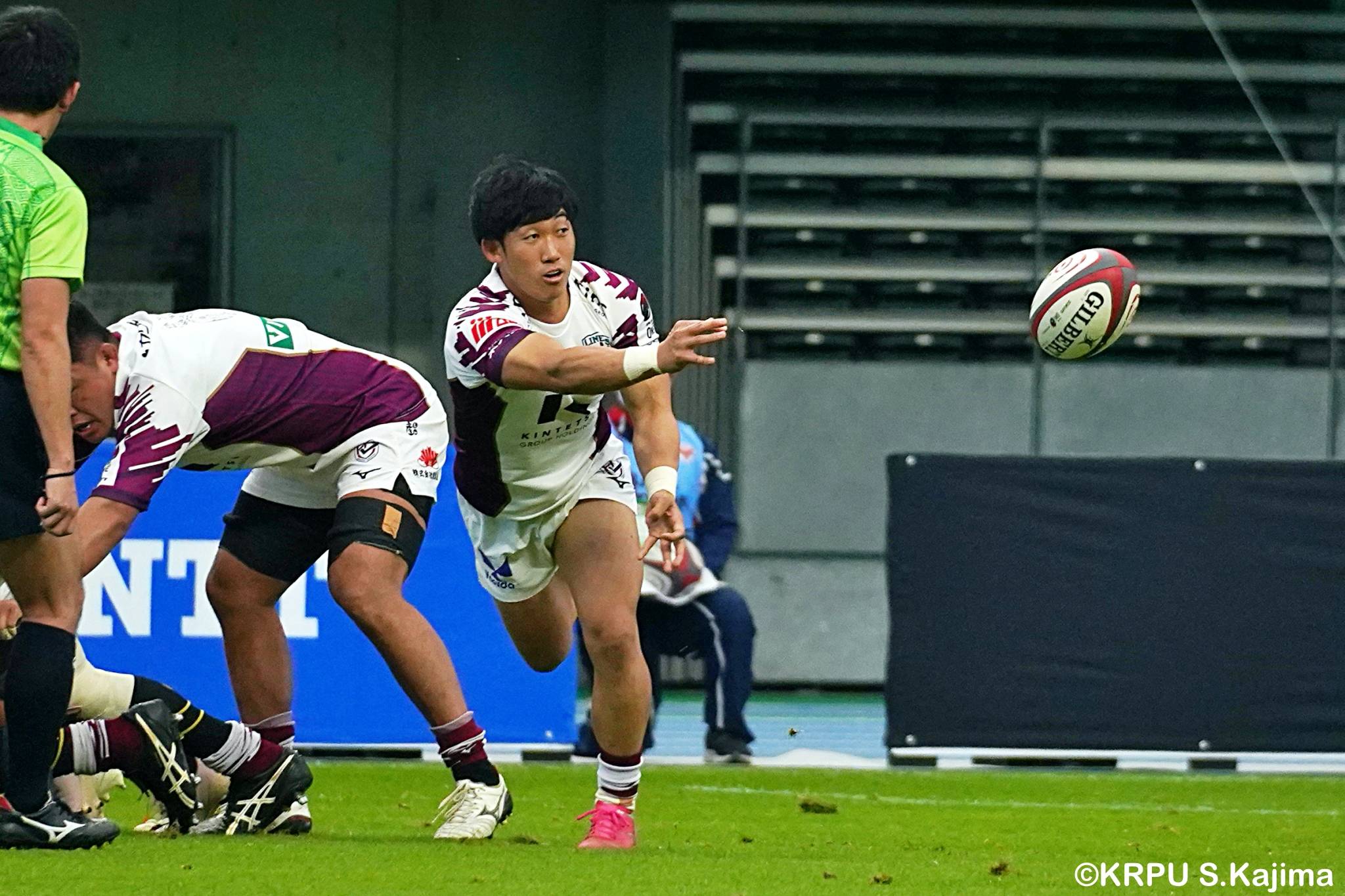 相手のタックルを受けながらボールをつなげると、後半13分に6菅原がビッグゲイン。2人抜くと、後ろから走ってきたバショップに渡してトライを決めます。バショップのGも成功し、後半先制点を奪います。