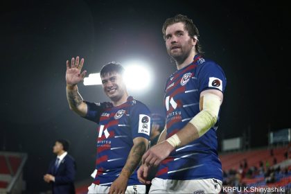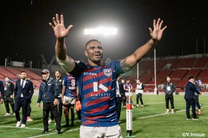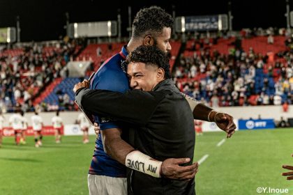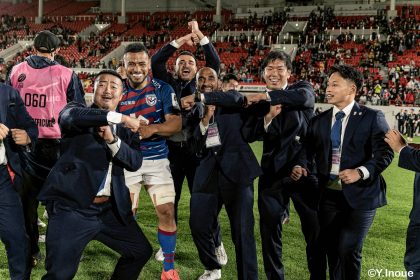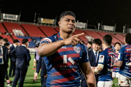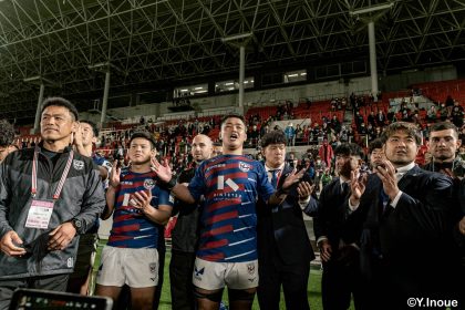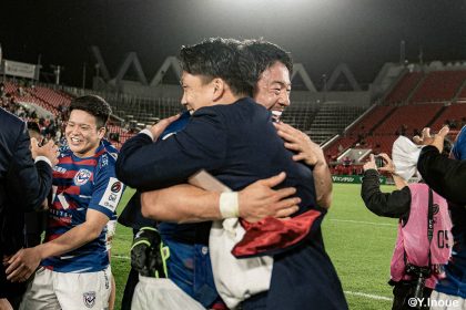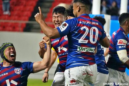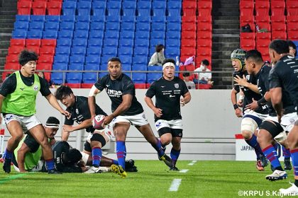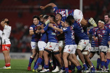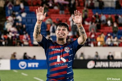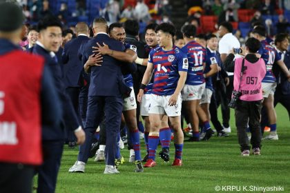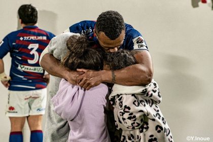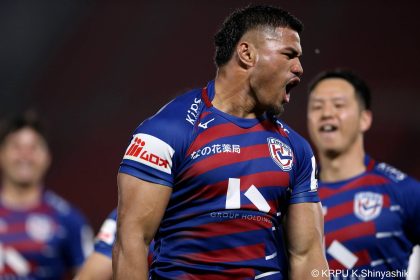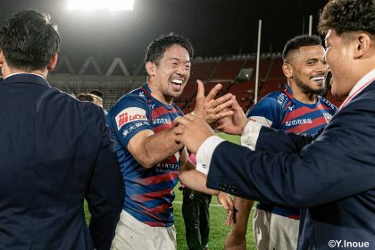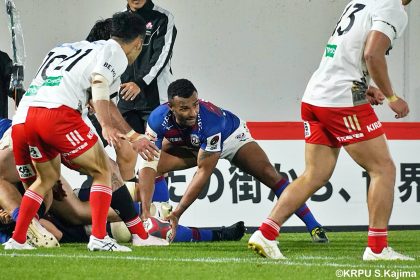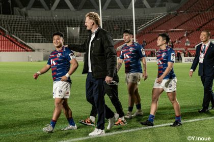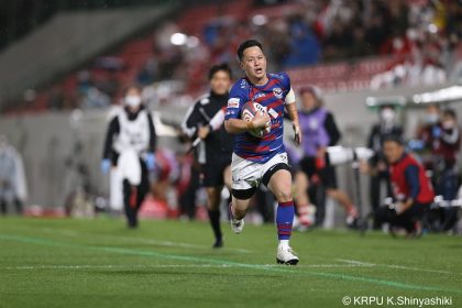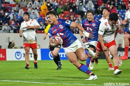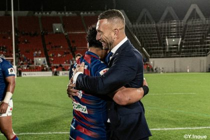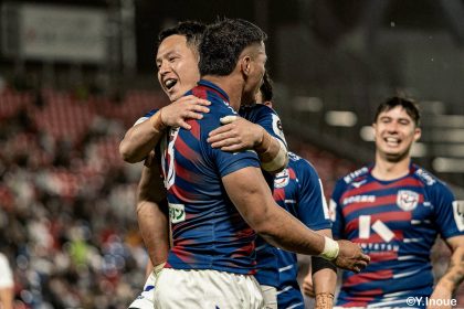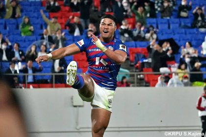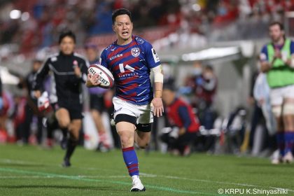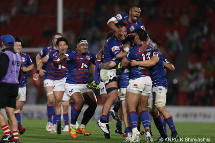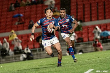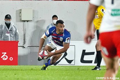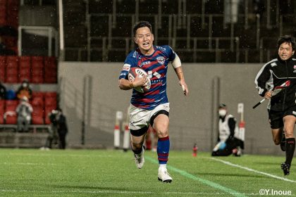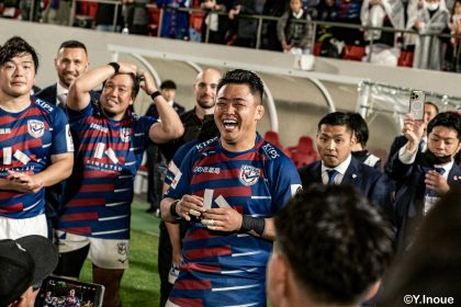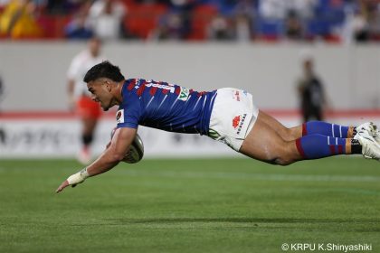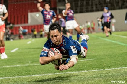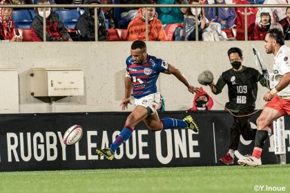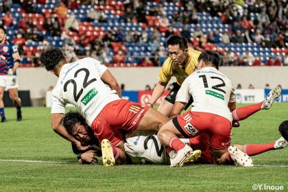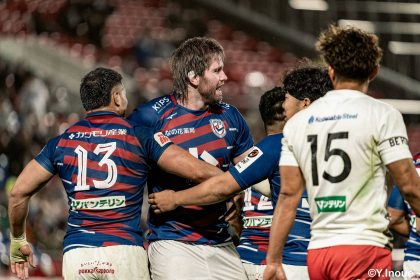後半14分、相手陣22m付近のマイボールラインアウトからフェーズを重ねて前進。ブレイクダウンからゲニア、バショップ、12金澤が受け取り相手ディフェンスを引きつけると、フィフィタに渡してゴール中央へ滑り込みます。バショップのGも決まって24-26。いよいよ2点差、見えてきた相手の背中。