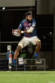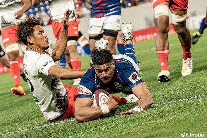 これを武器に前進すると、後半5分ようやく入った相手陣22m内でのラインアウトからボールを素早く回します。バショップ、8カパ、最後は短いパスで13フィフィタへ渡すと、ついにファーストトライ。バショップのGも成功し、反撃開始が始まります。