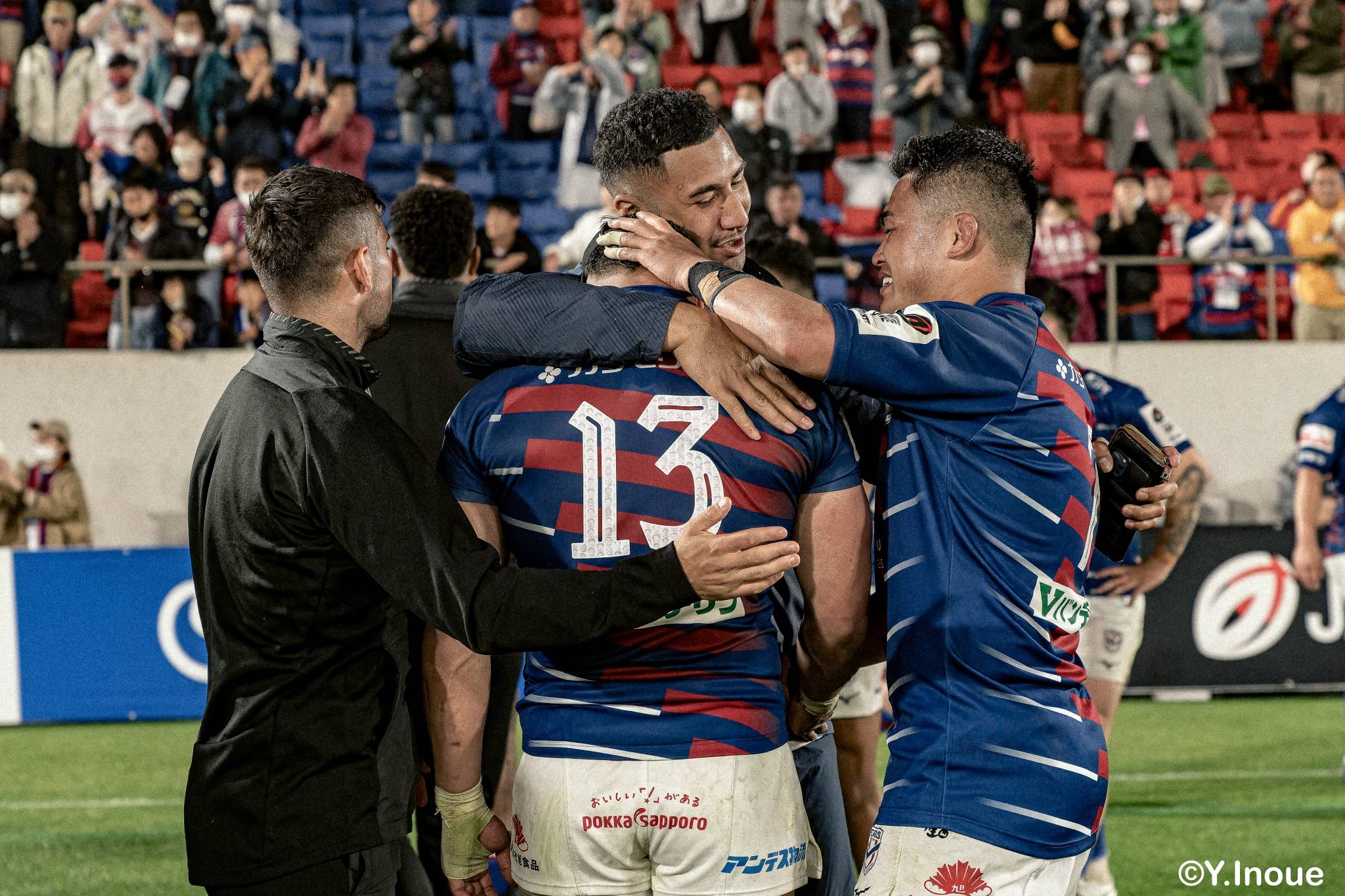 後半14分、相手陣22m付近のマイボールラインアウトからフェーズを重ねて前進。ブレイクダウンからゲニア、バショップ、12金澤が受け取り相手ディフェンスを引きつけると、フィフィタに渡してゴール中央へ滑り込みます。バショップのGも決まって24-26。いよいよ2点差、見えてきた相手の背中。