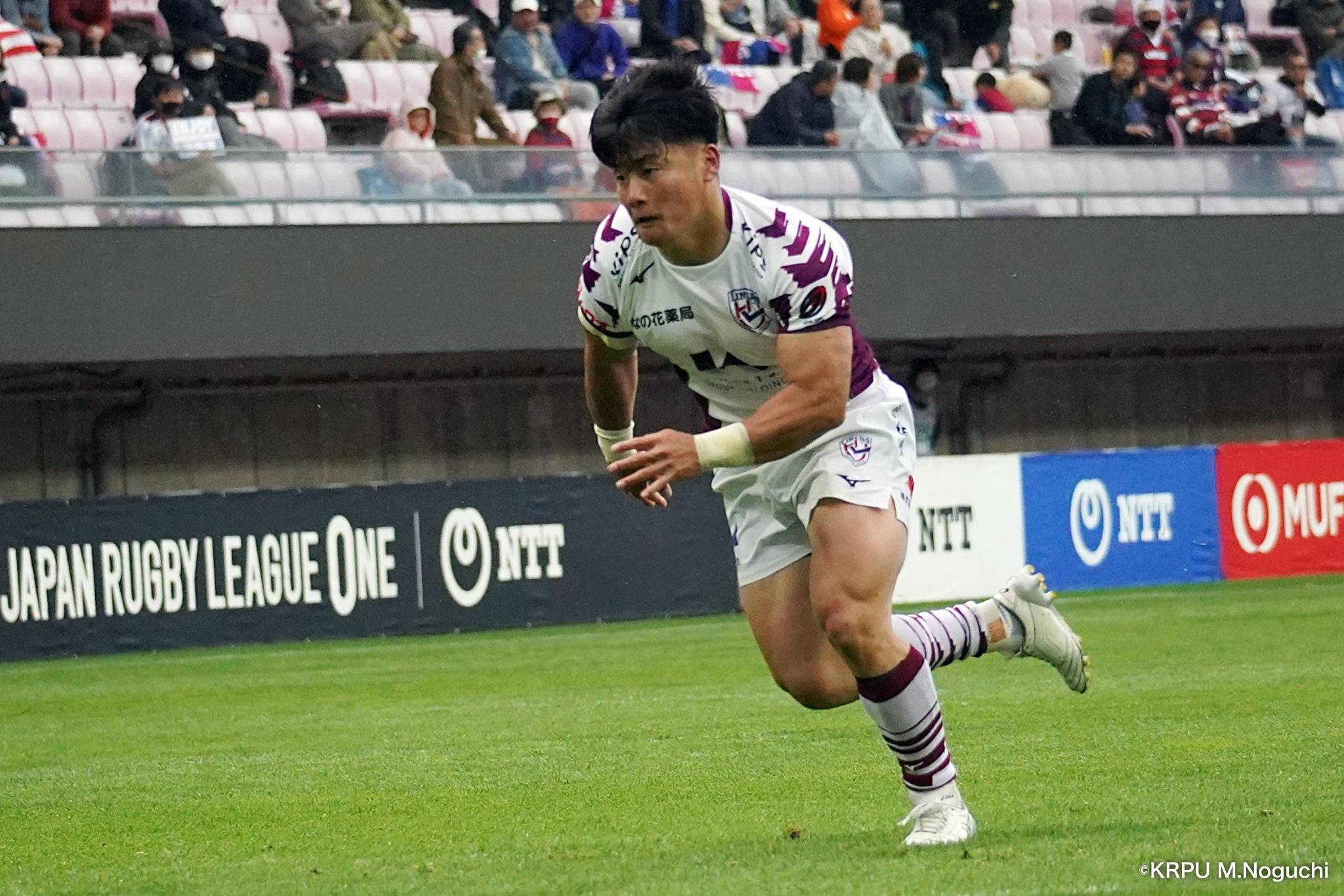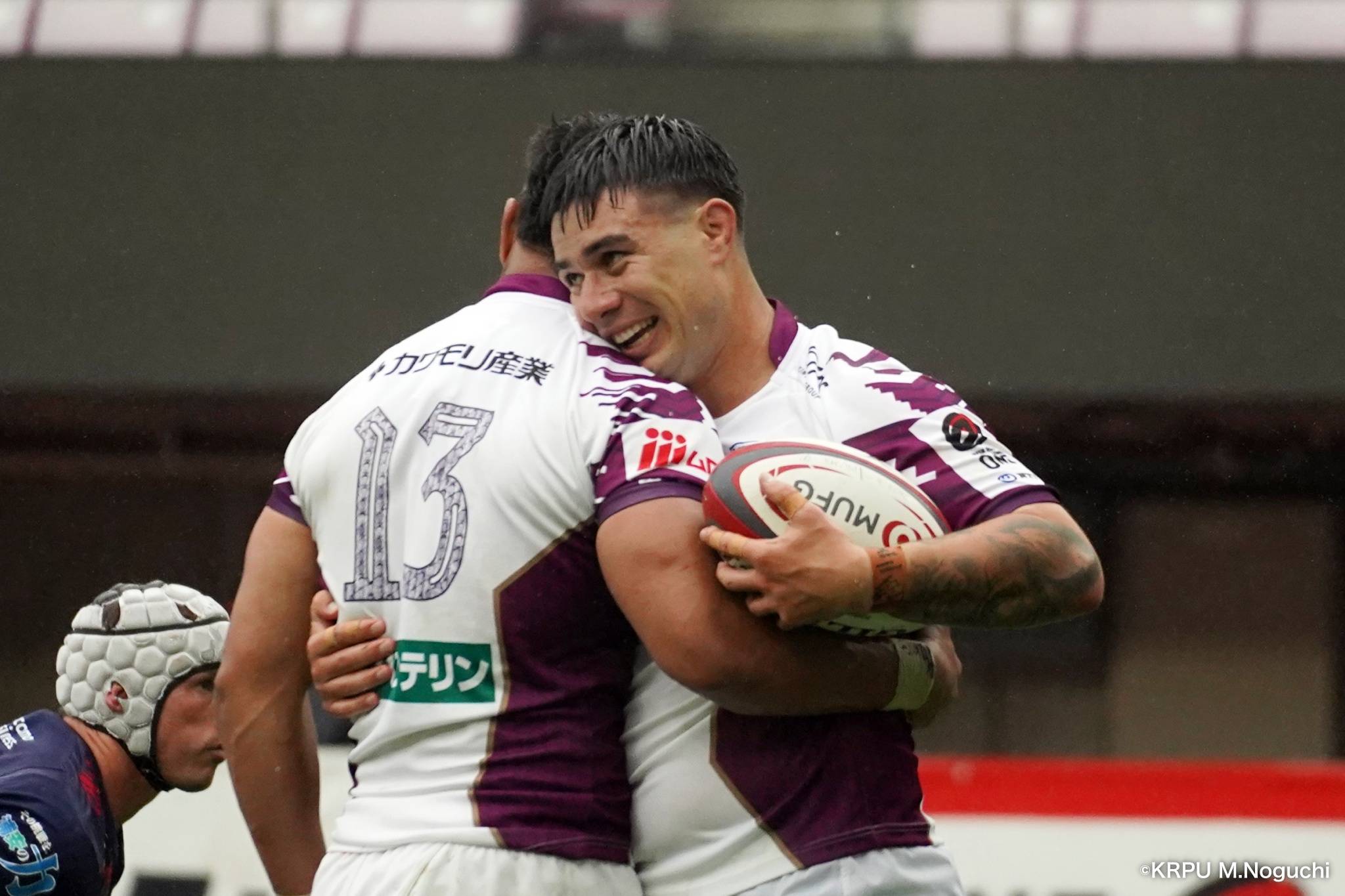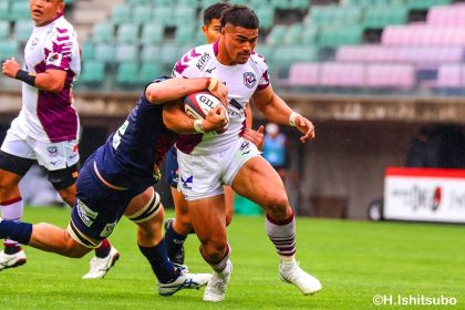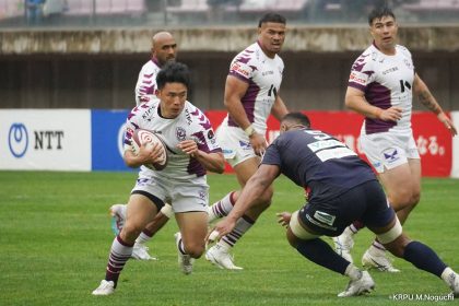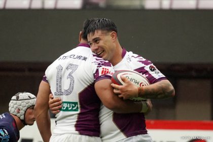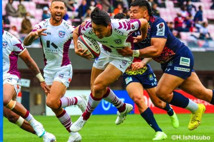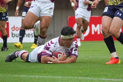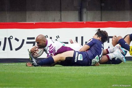 勢いそのままに、前半14分にはハーフラインから10クーパーがグラバーキックでボールを転がし、追いかけて自らもう一度キックし右へ。後ろから走ってきた1田中がキャッチすると、猪突猛進に真っ直ぐ走り抜け中央右にトライを決めます。マシレワのGも決まって12-7。