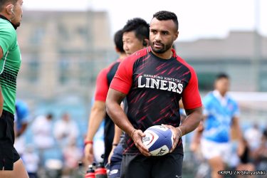 気を取り直しアタックに回るライナーズは、前半4分にカウンターから連続攻撃。22mライン付近へ迫り、ラックから出たボールを14セフォがキャッチし抜けると、左にテンポよく回し7宮下が左端にトライします。