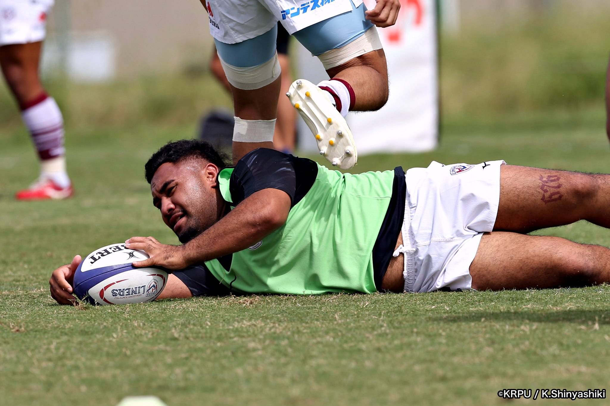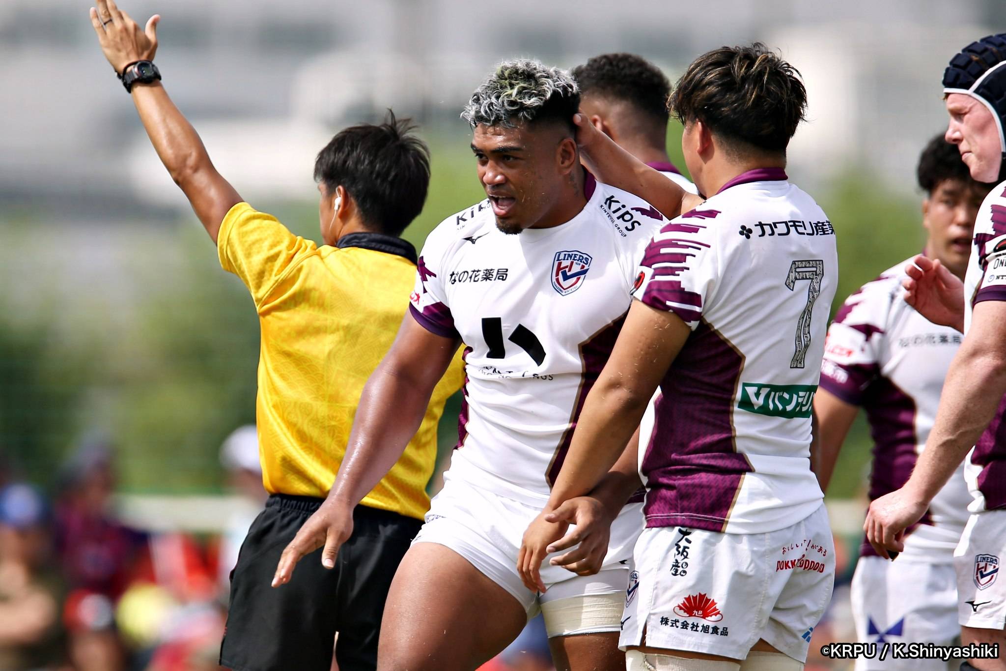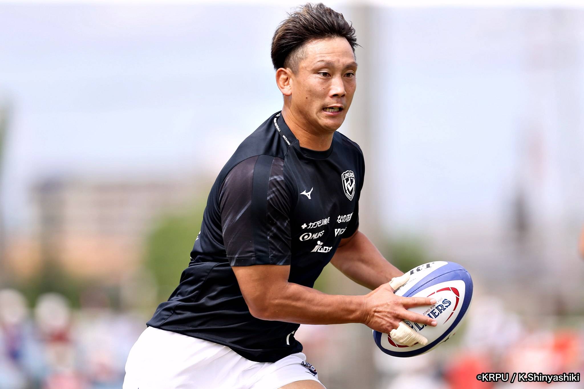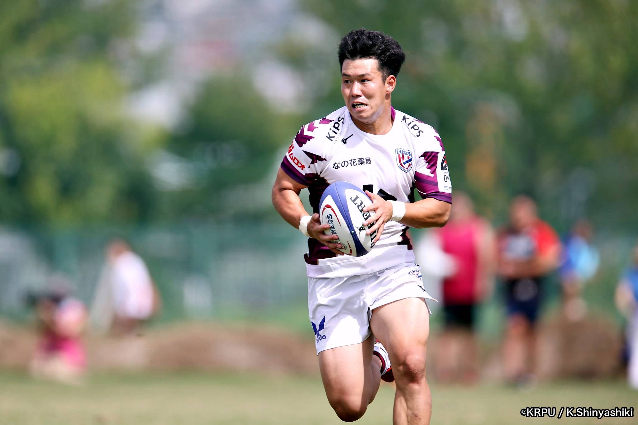 気を取り直しアタックに回るライナーズは、前半4分にカウンターから連続攻撃。22mライン付近へ迫り、ラックから出たボールを14セフォがキャッチし抜けると、左にテンポよく回し7宮下が左端にトライします。
