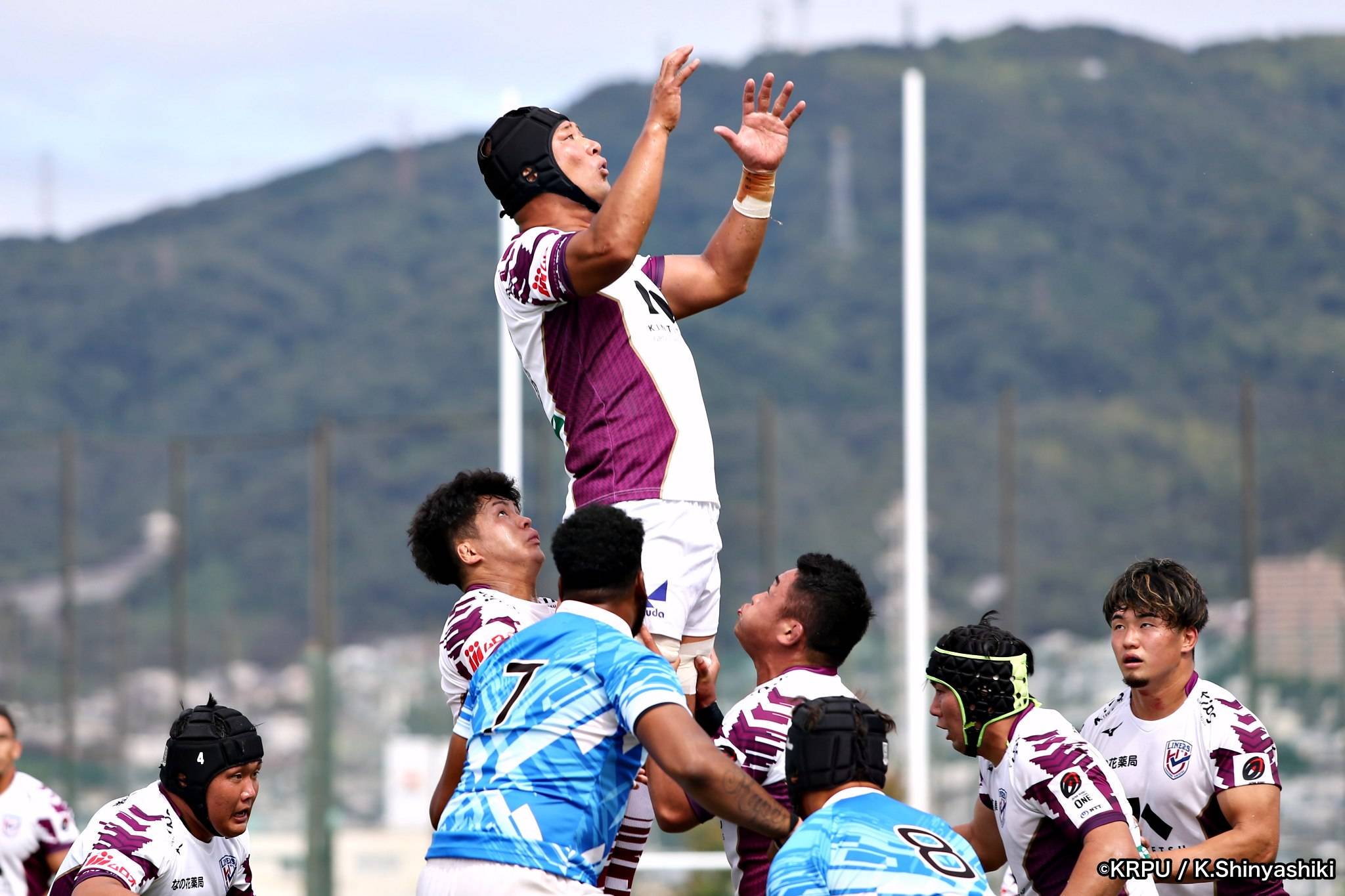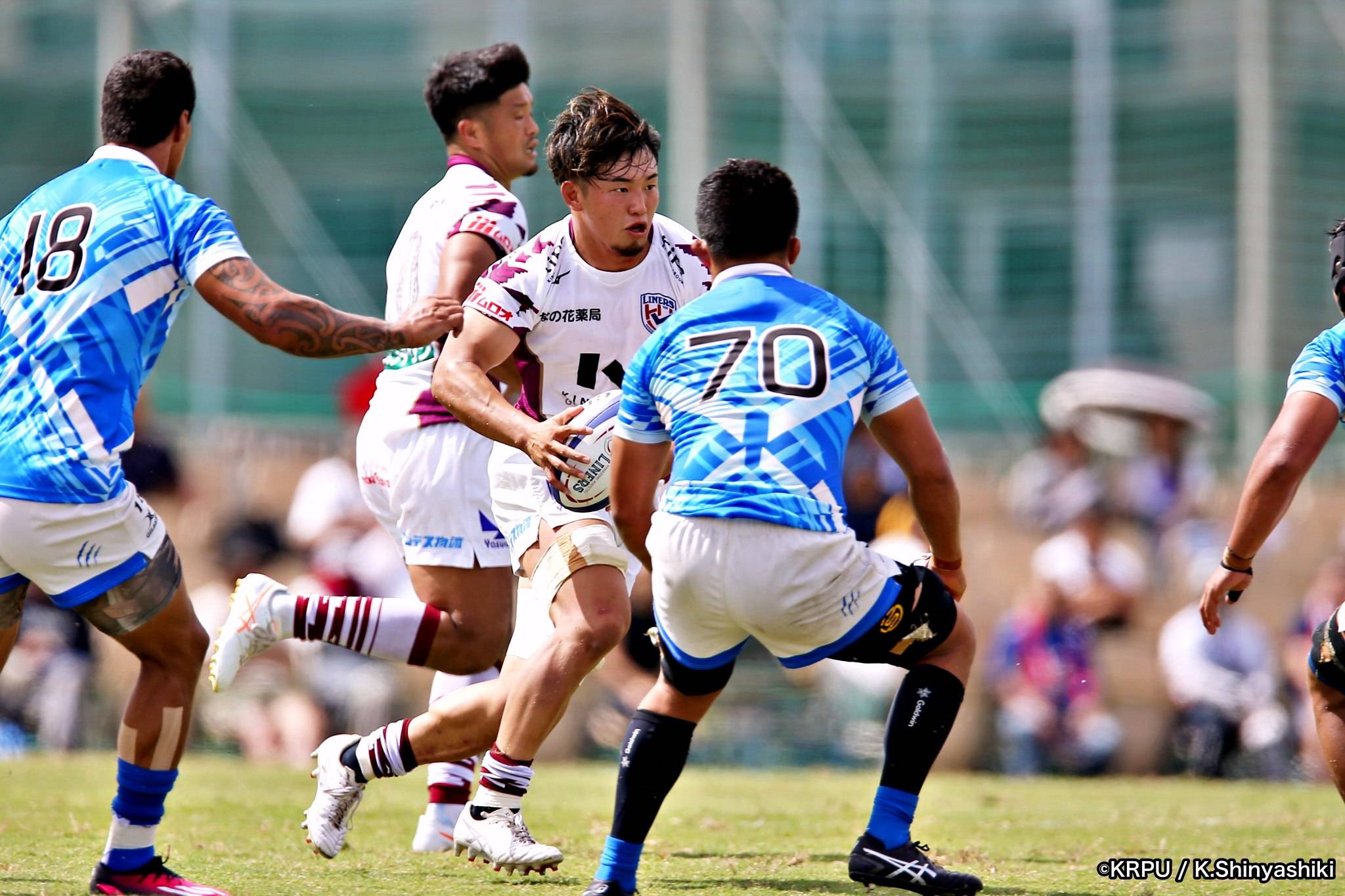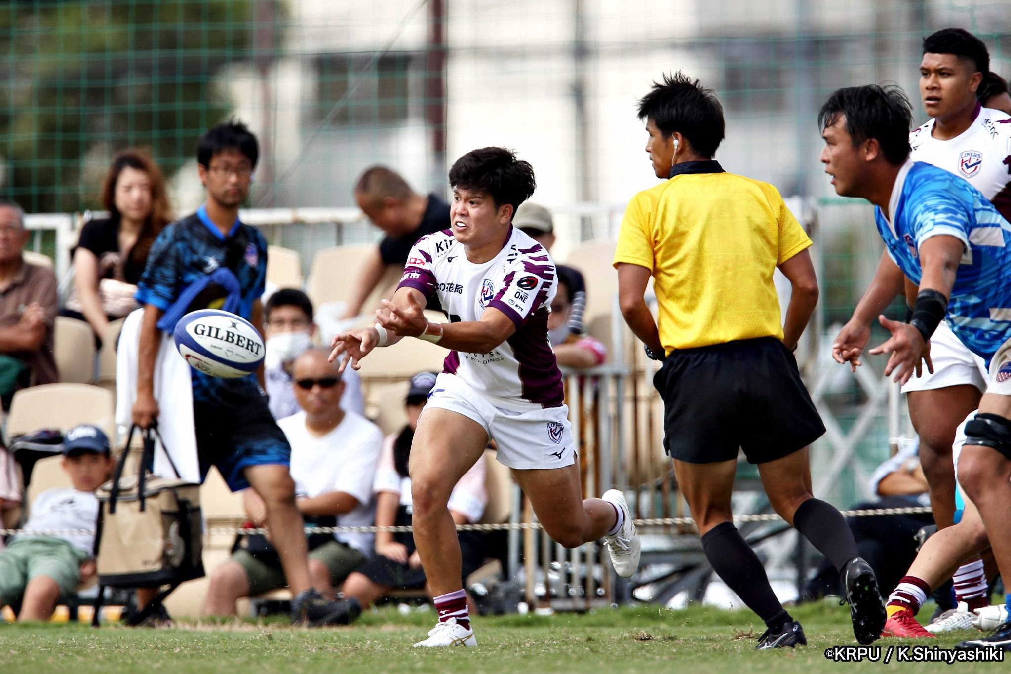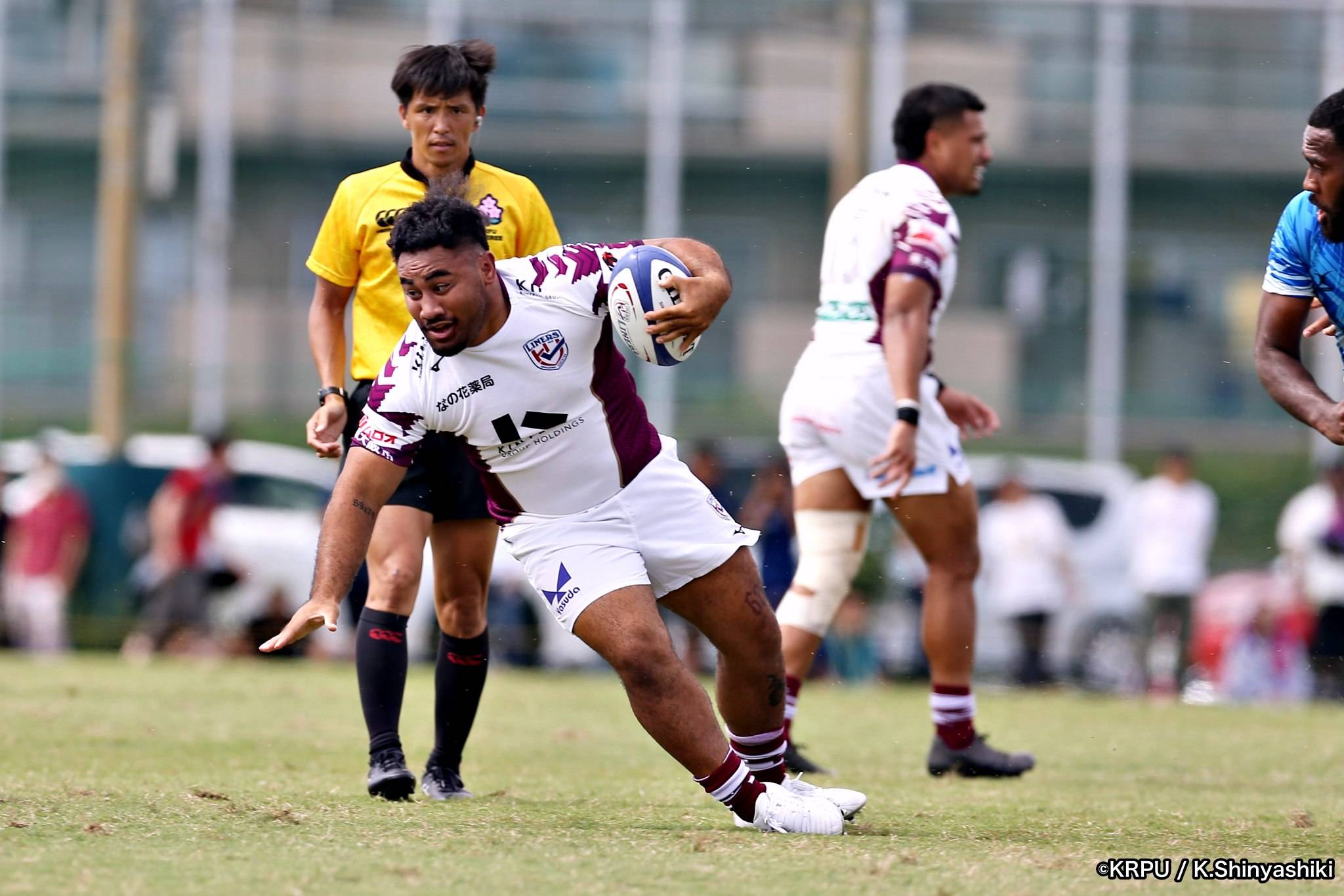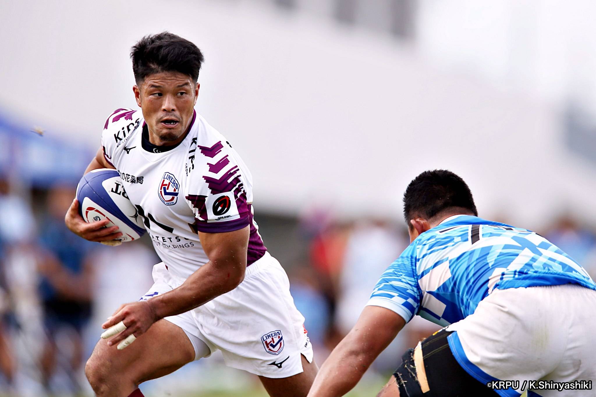 気を取り直しアタックに回るライナーズは、前半4分にカウンターから連続攻撃。22mライン付近へ迫り、ラックから出たボールを14セフォがキャッチし抜けると、左にテンポよく回し7宮下が左端にトライします。