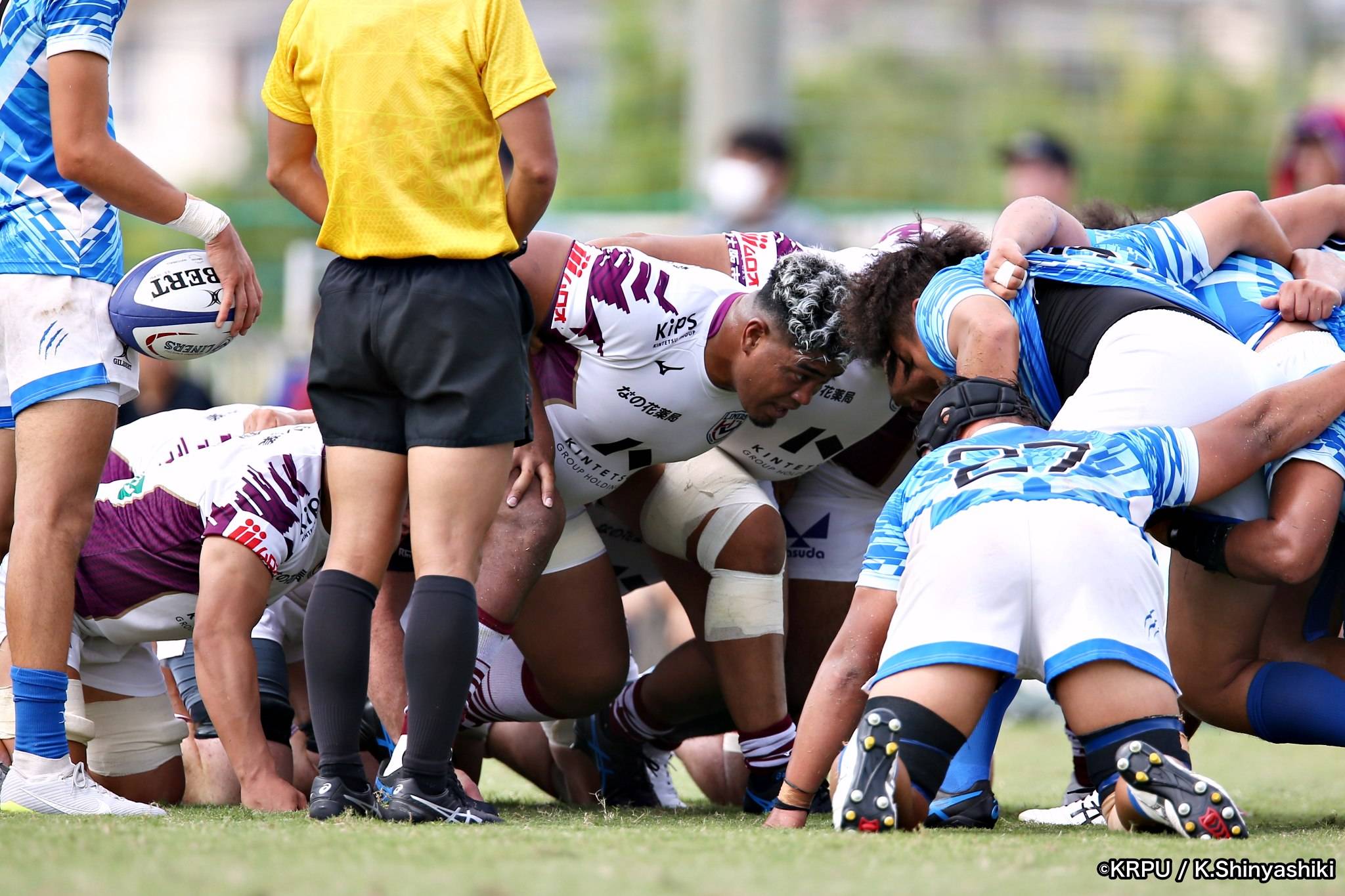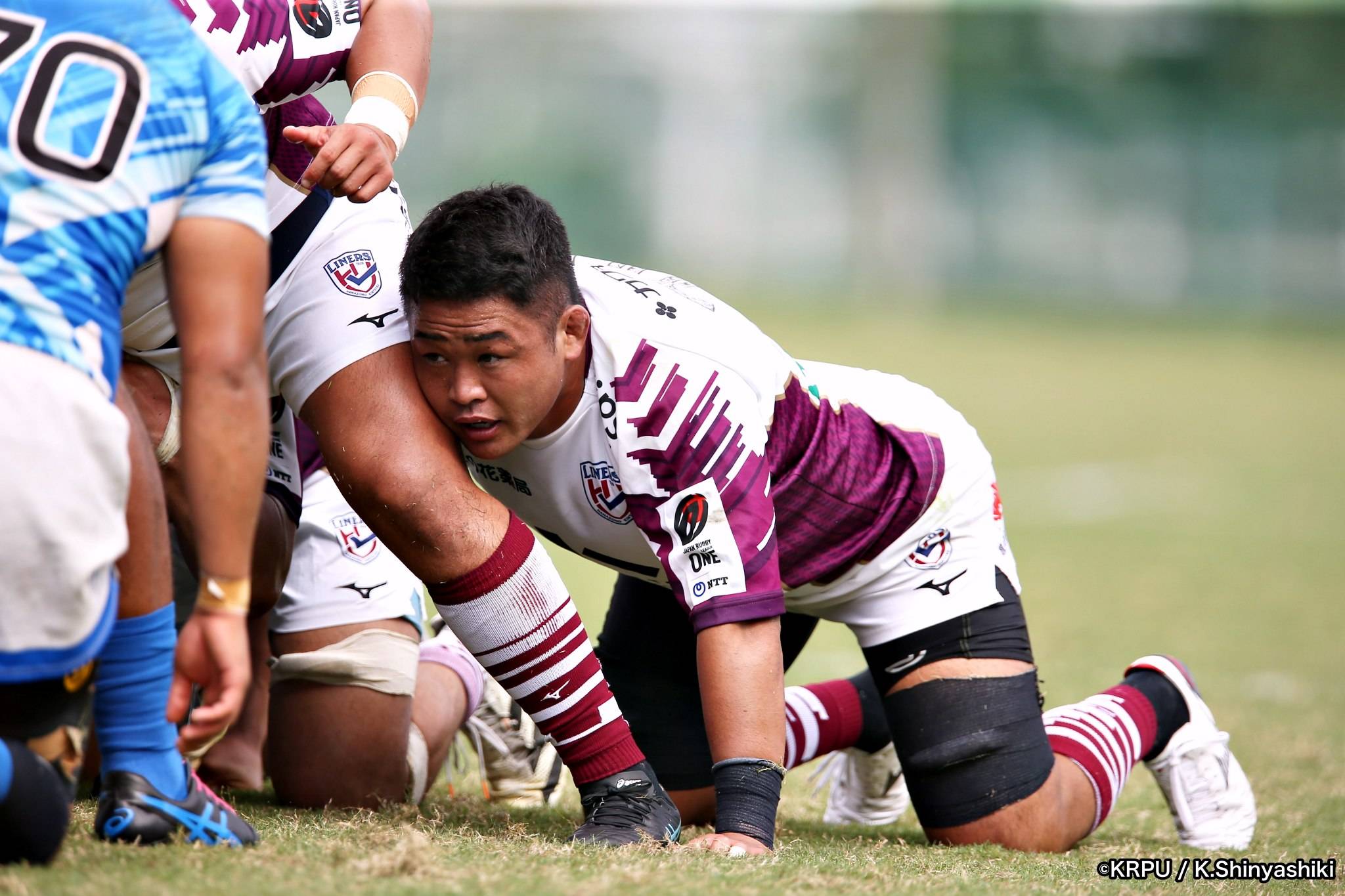 前半終了間際、ようやくライナーズにチャンスが。相手陣22m内でのスクラムで優勢を取ると、タッチに出し前へ。